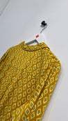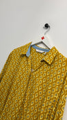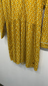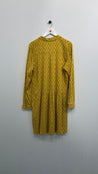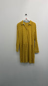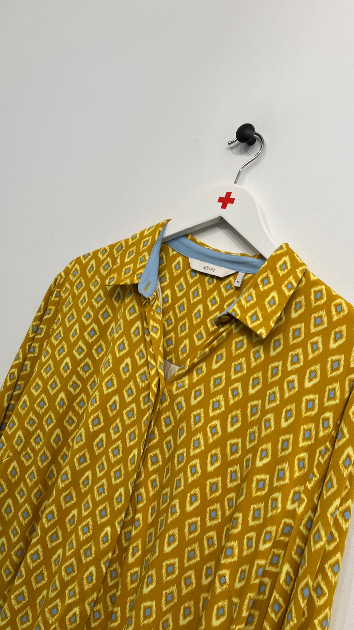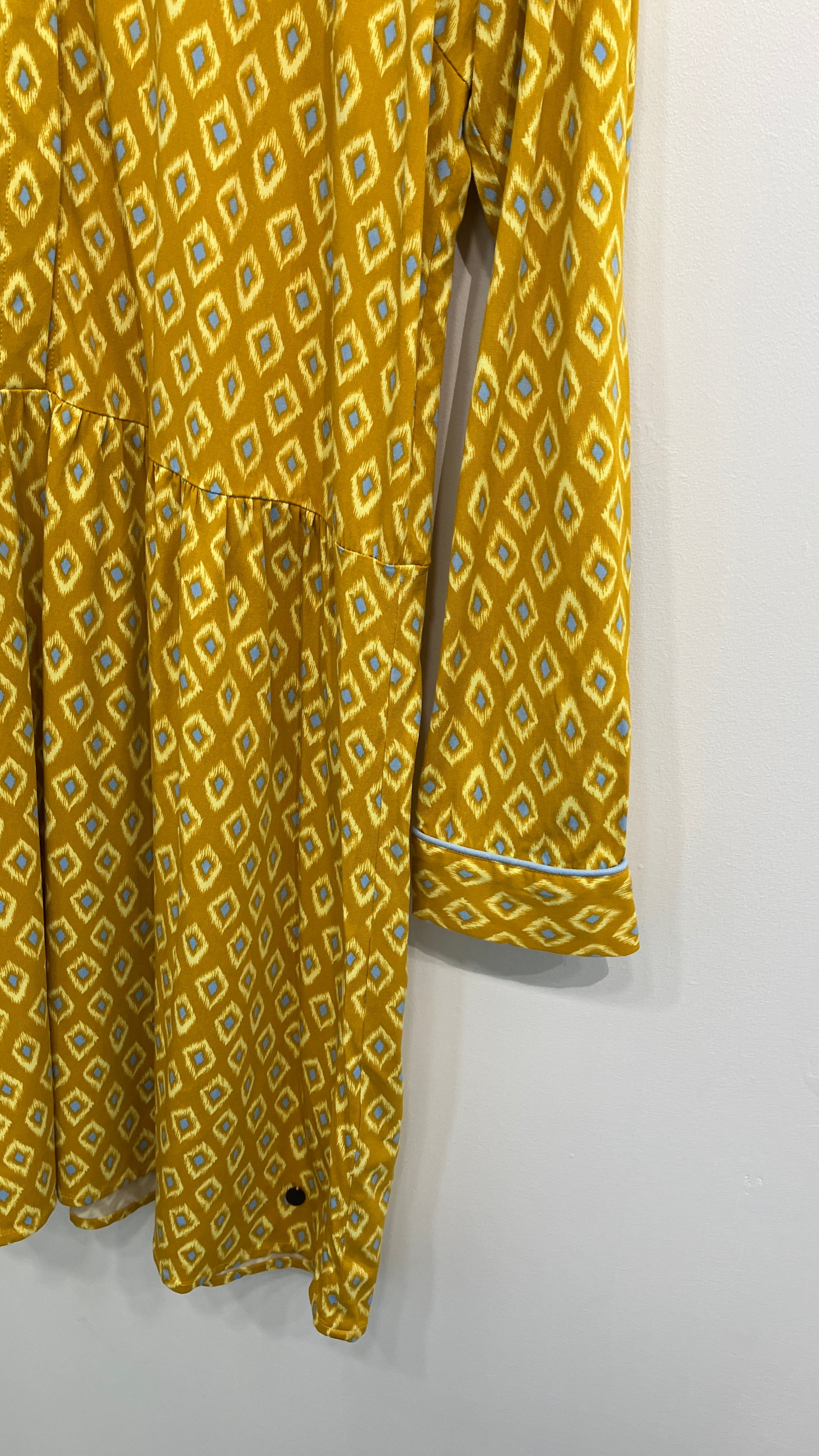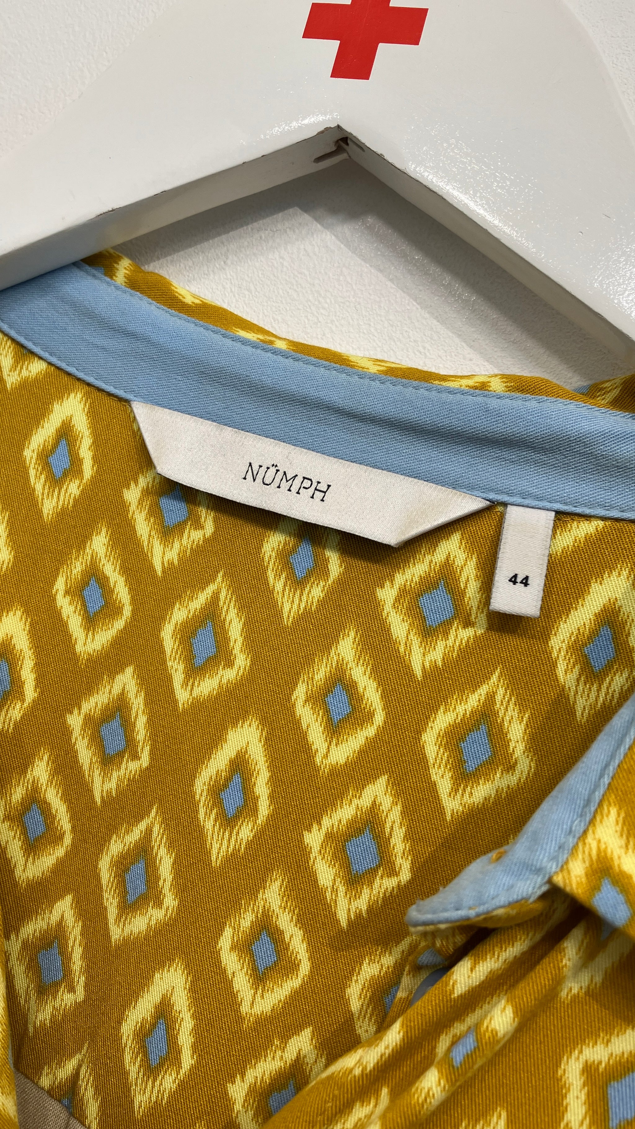 Smuk lang Nümph kjole med flot krave og flerfarvet mønster.
