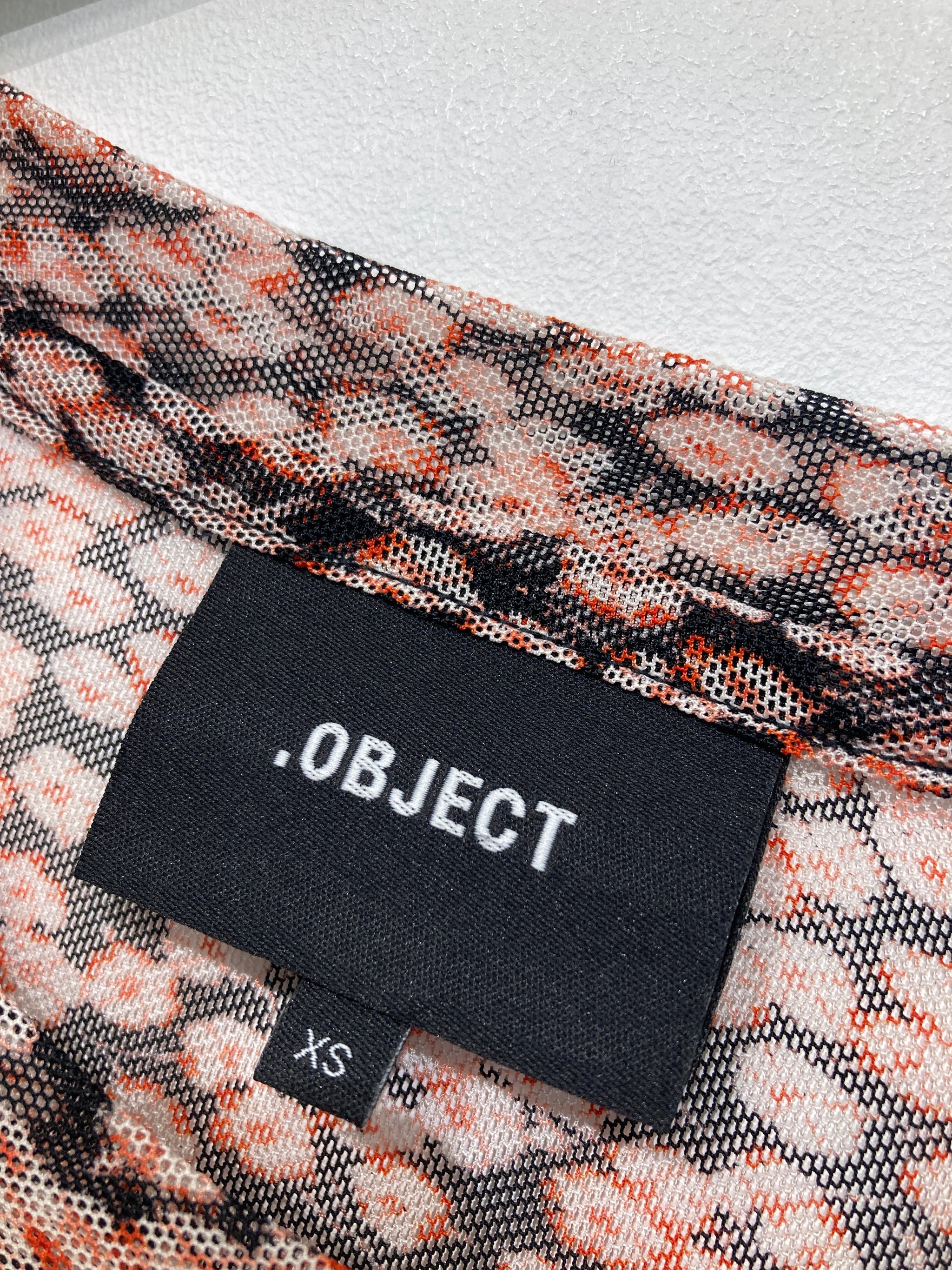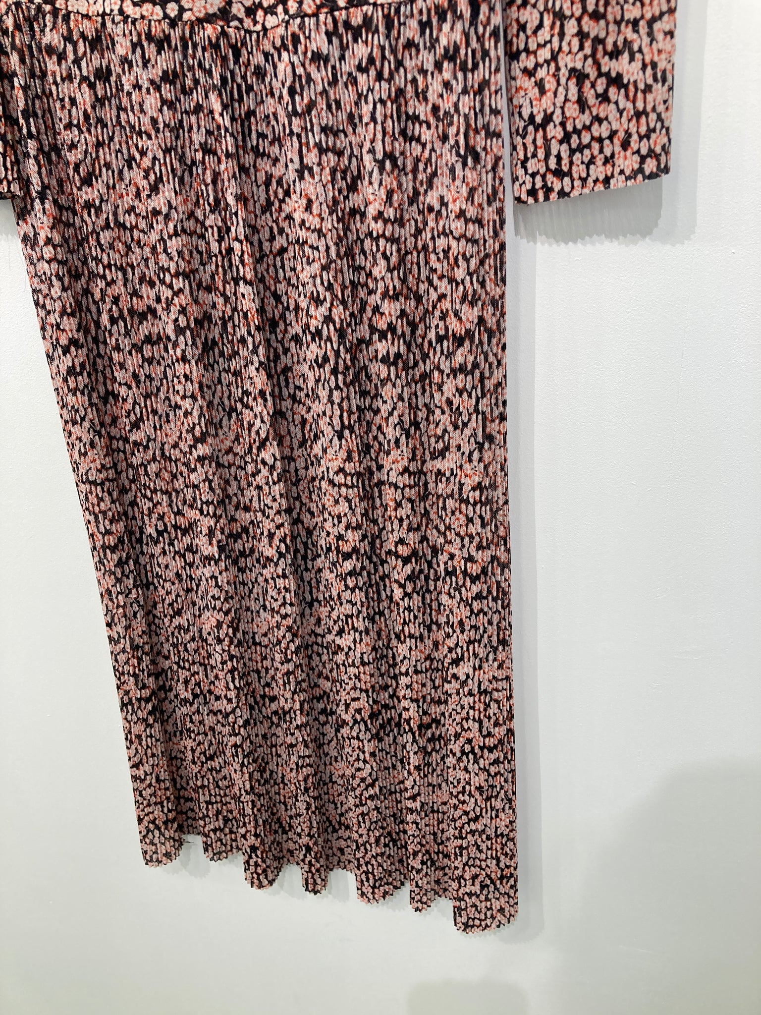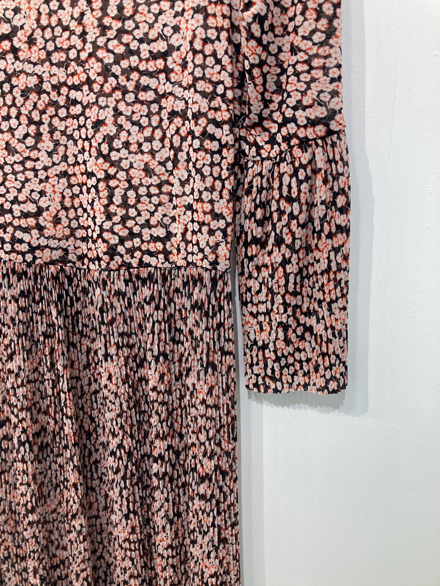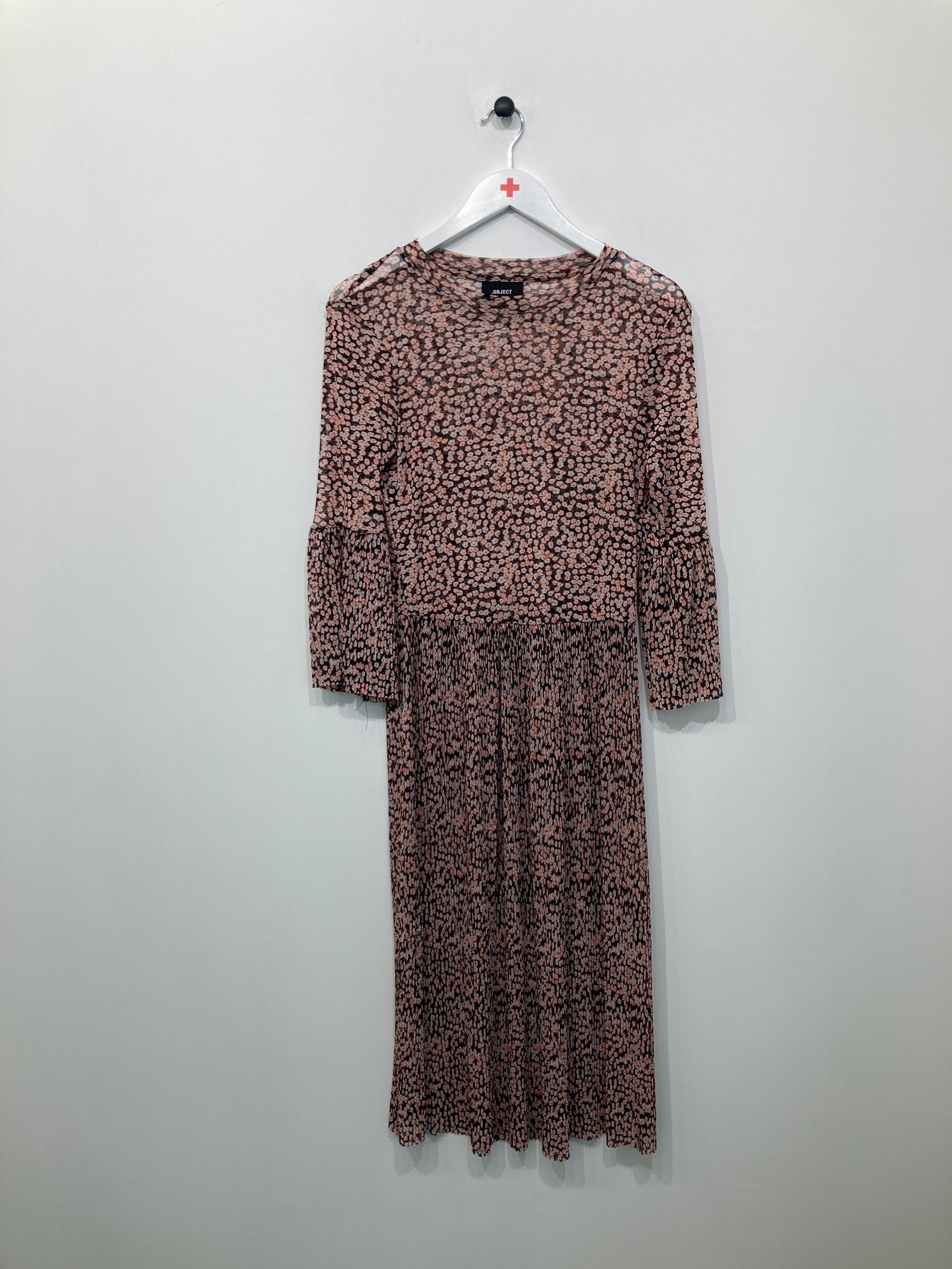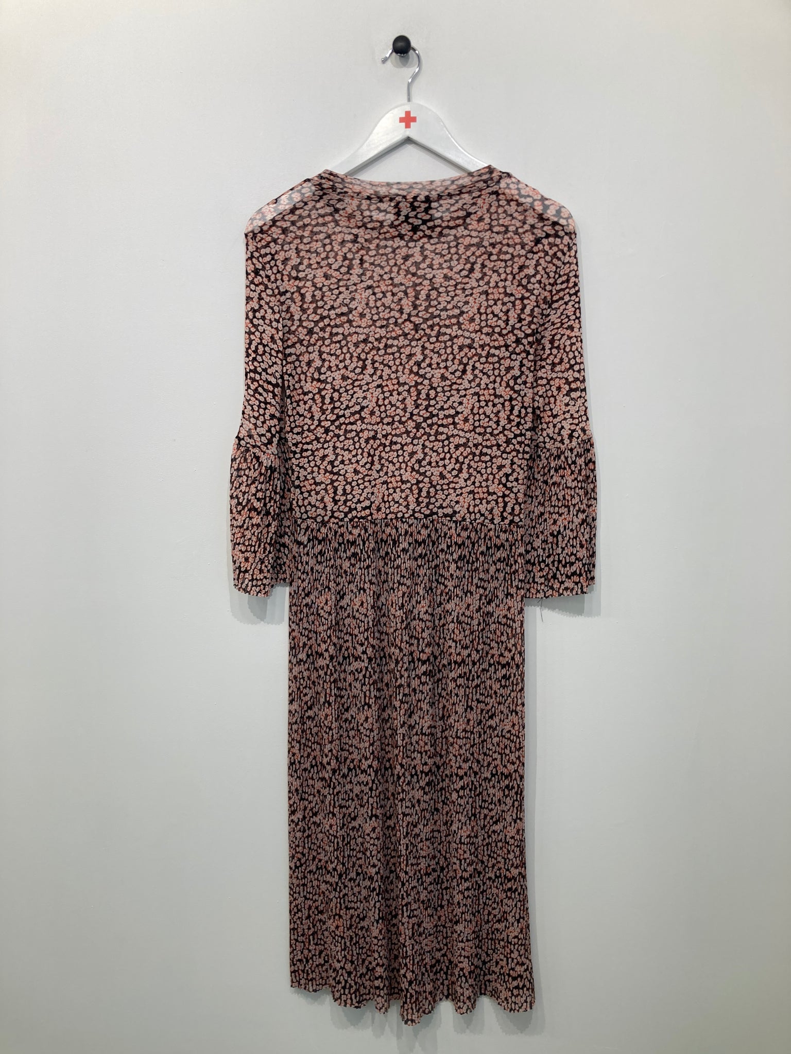 Lang kjole med rund halsudskæring og overskæring ved ærmerne. Mangler vaskemærke.
