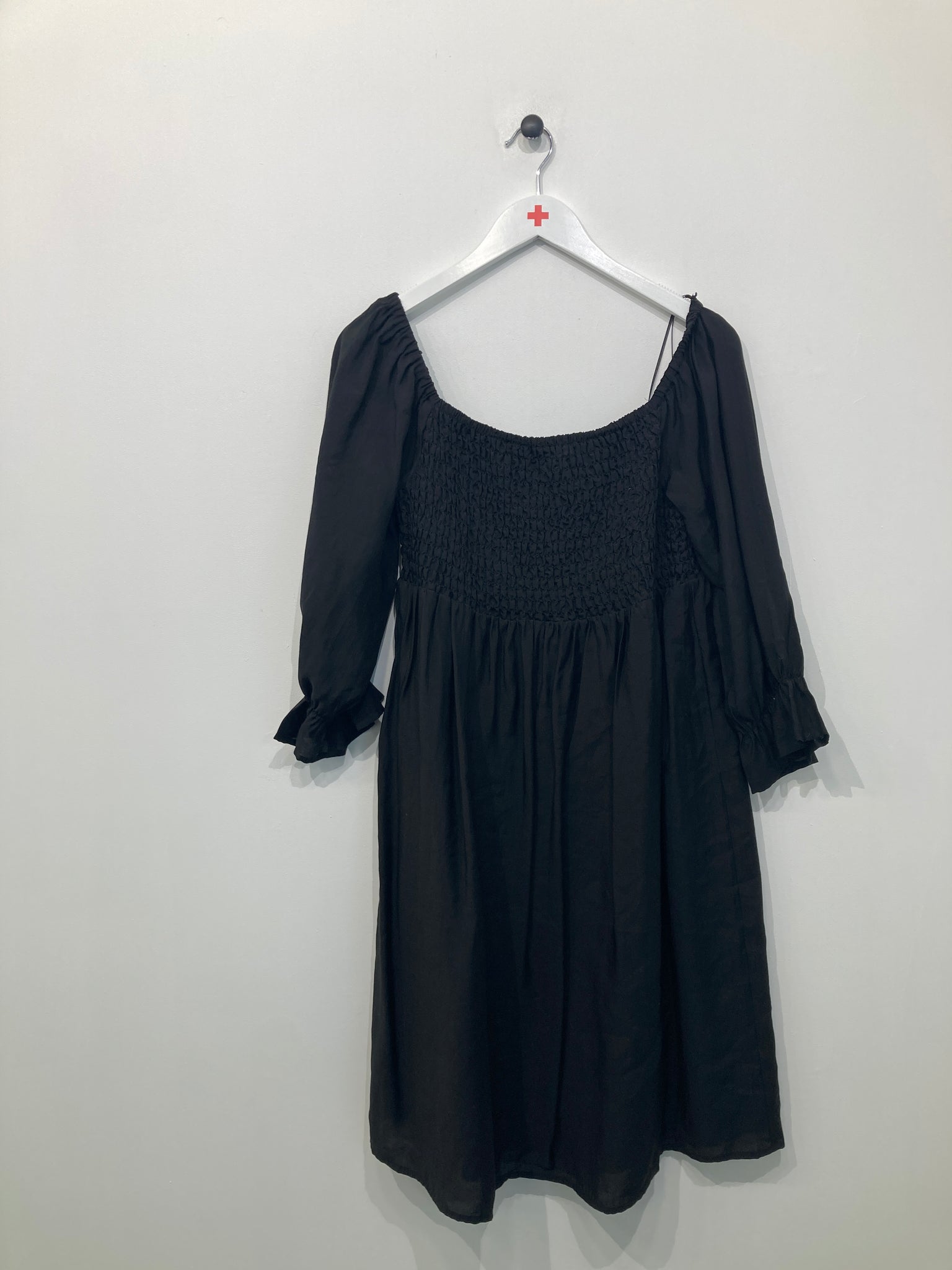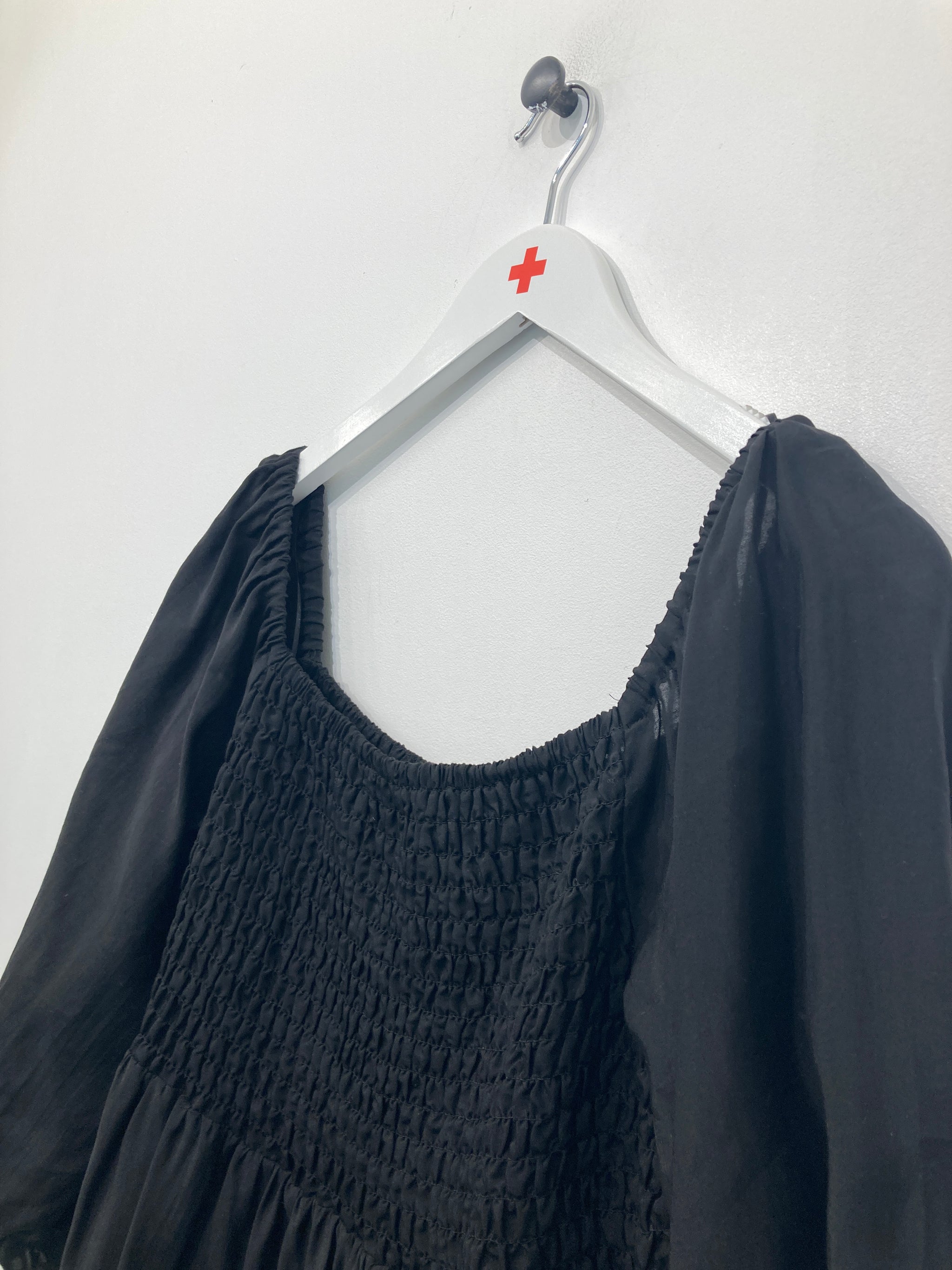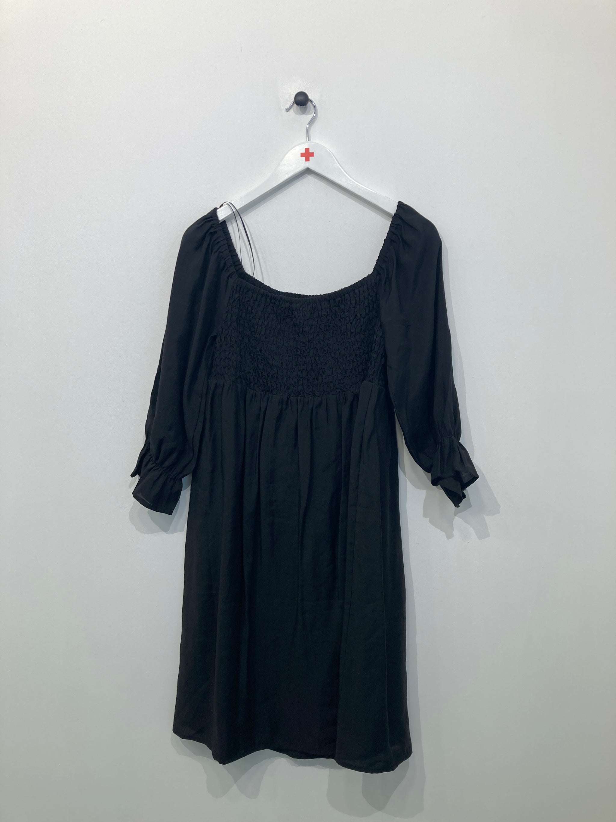 Fin Kjole med elastik ved brystet og lange ærmer med rynke detalje. Mangler vaskemærke.