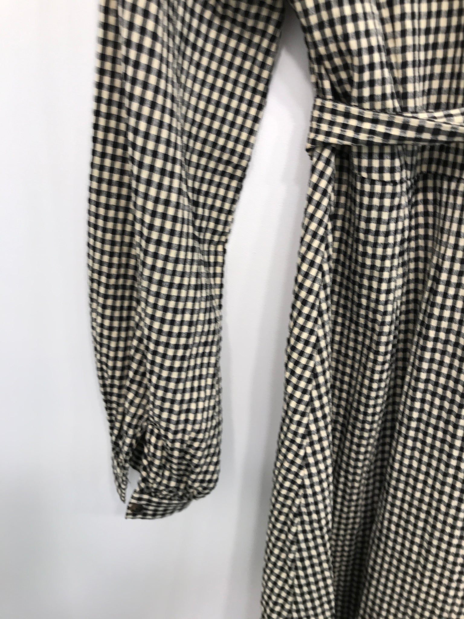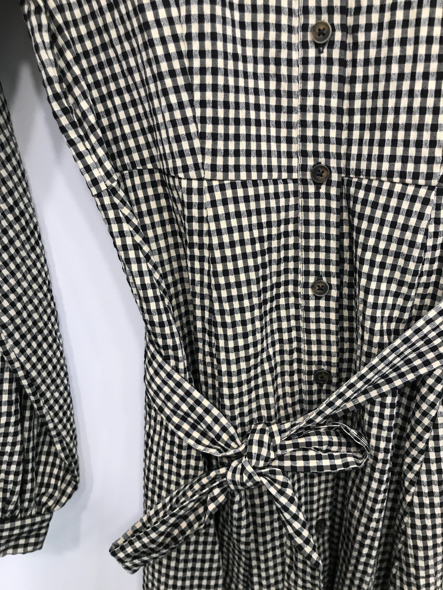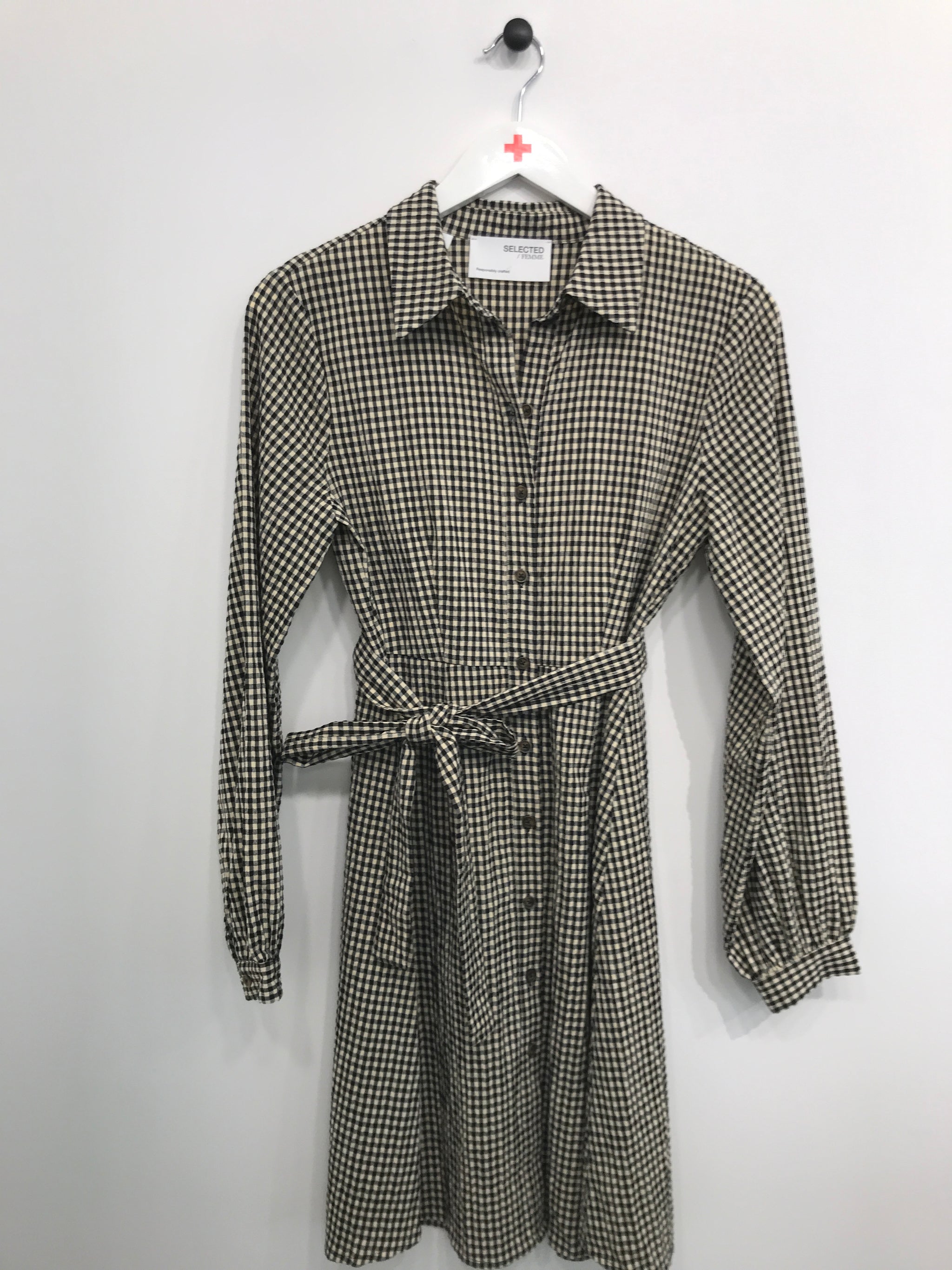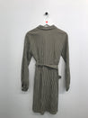Skjortekjole med krave og gennemgående knaplukning. Kjole har lange ærmer og bindebånd i taljen.