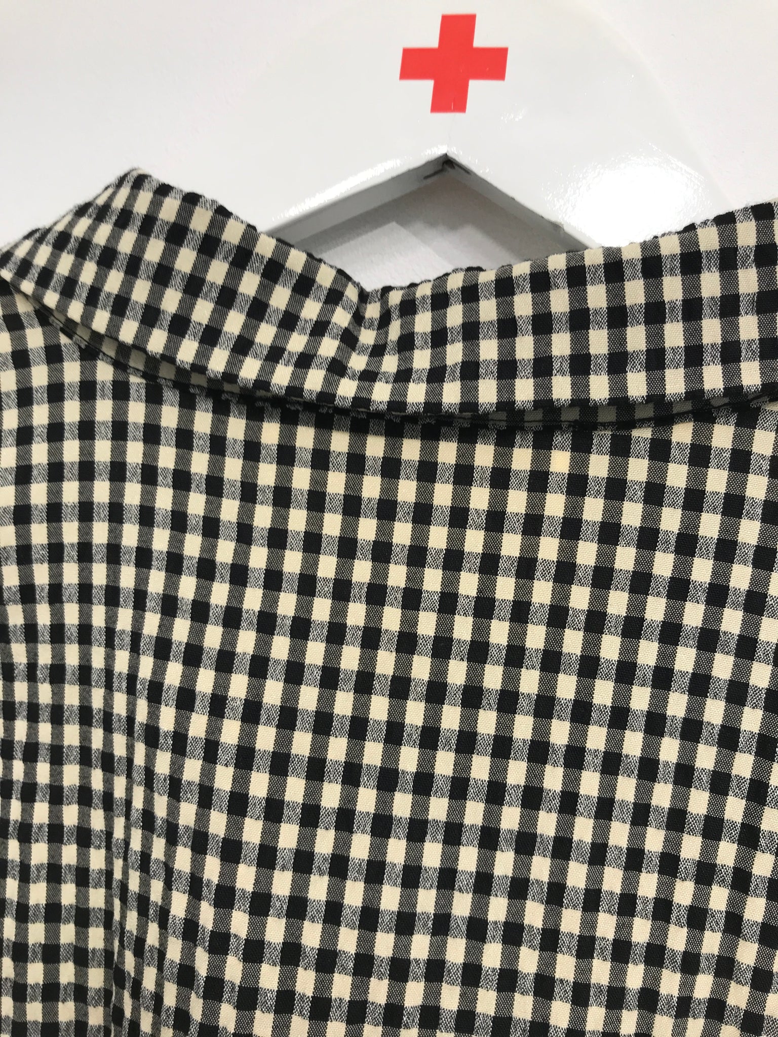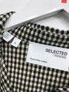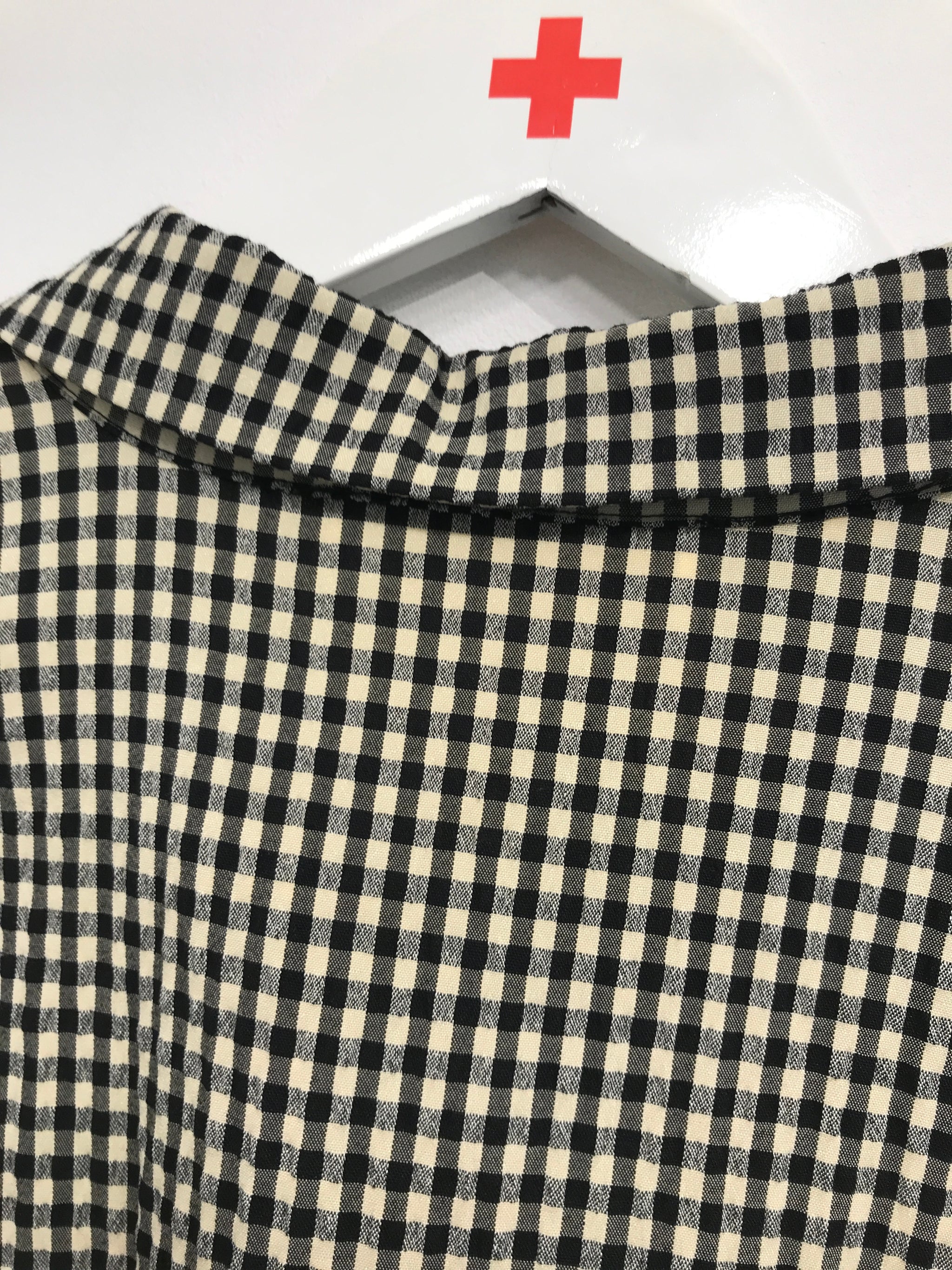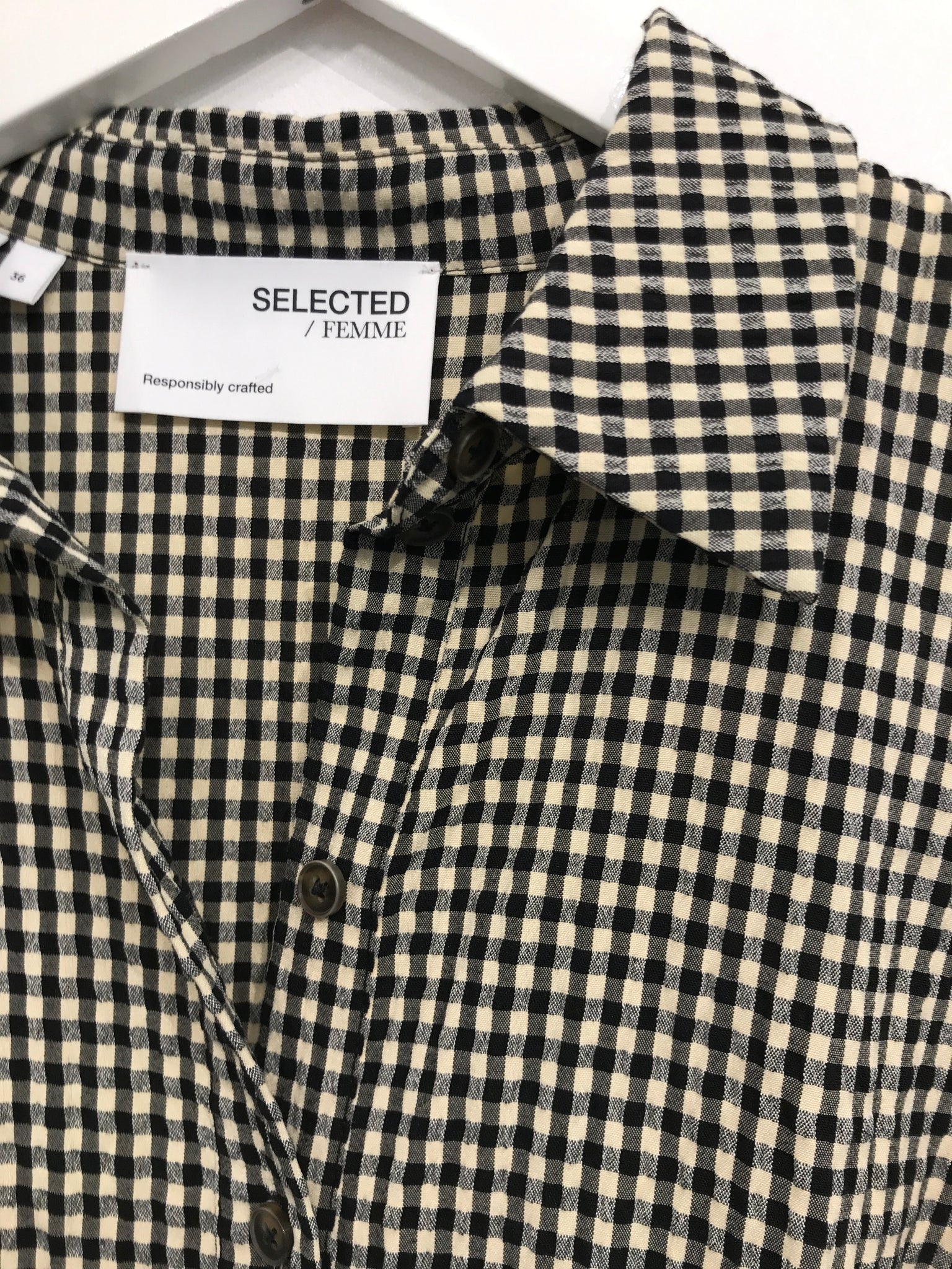Skjortekjole med krave og gennemgående knaplukning. Kjole har lange ærmer og bindebånd i taljen.