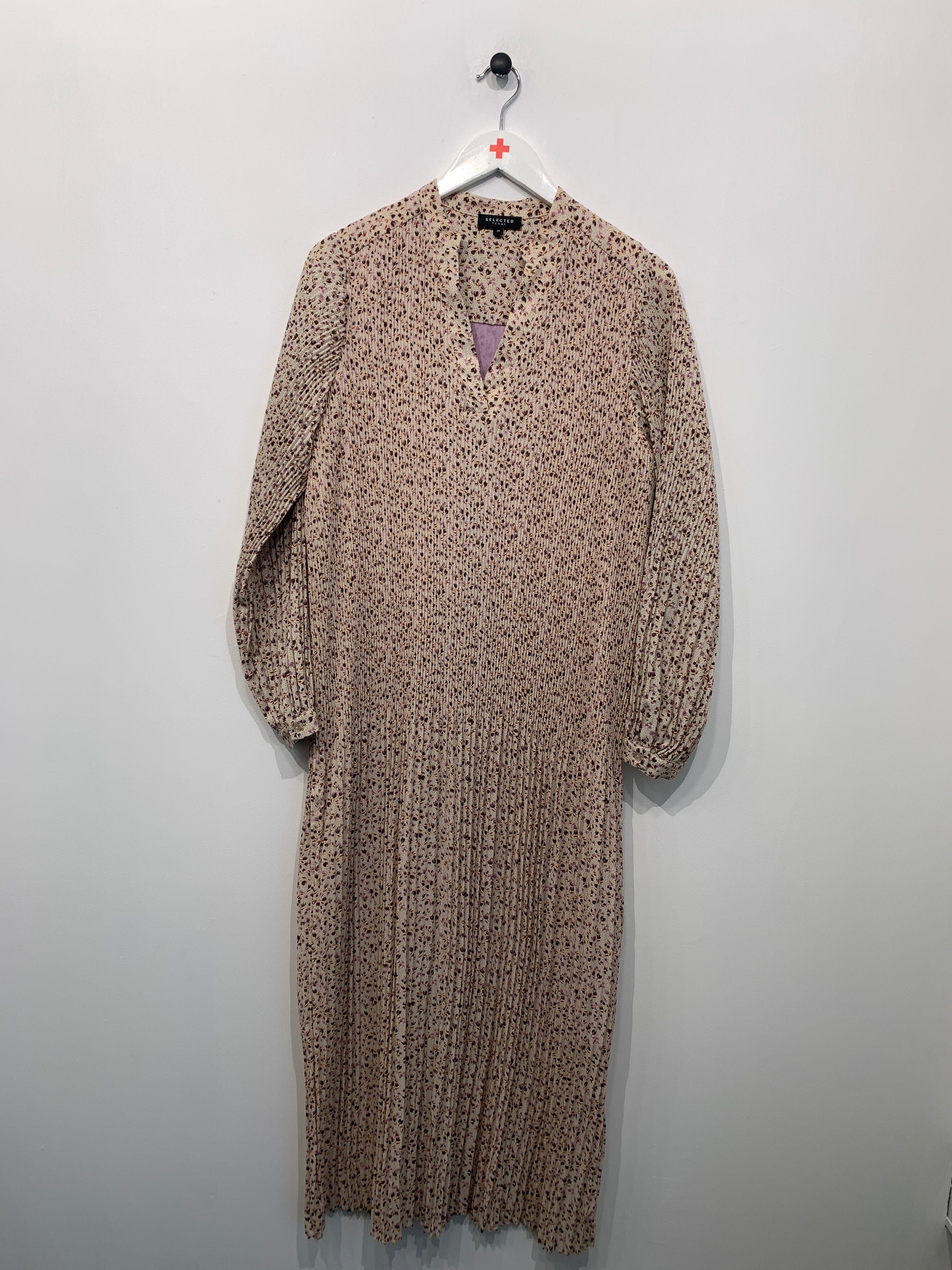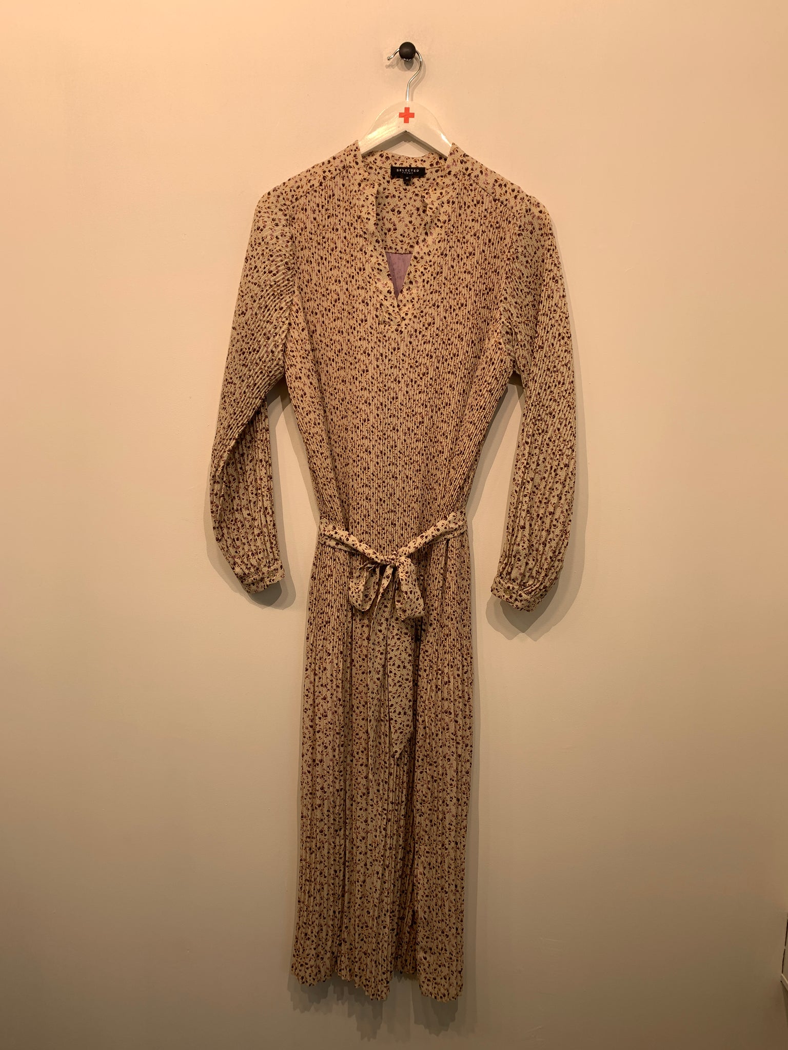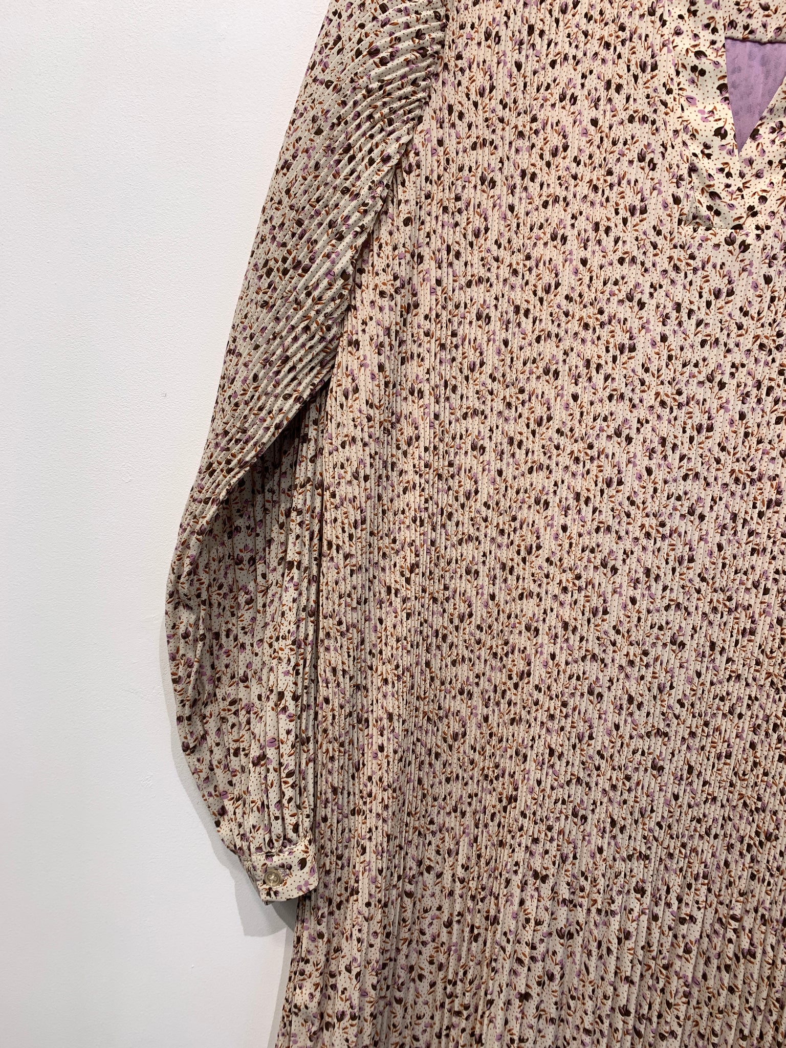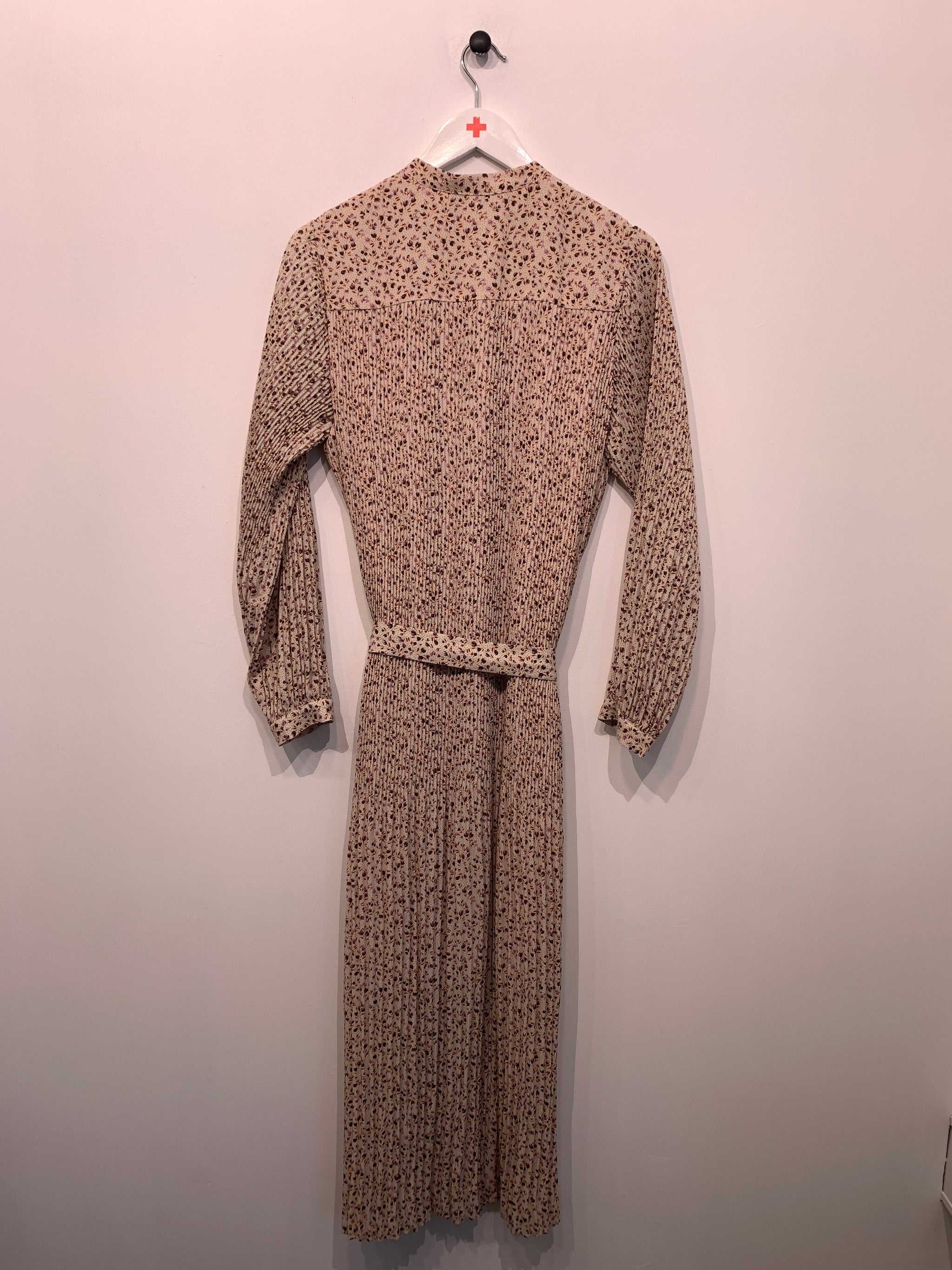 Kjole i smalt plisseret stof med v-udskæring, lange ærmer og bindebånd i taljen. Vaskemærke mangler.