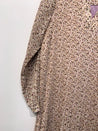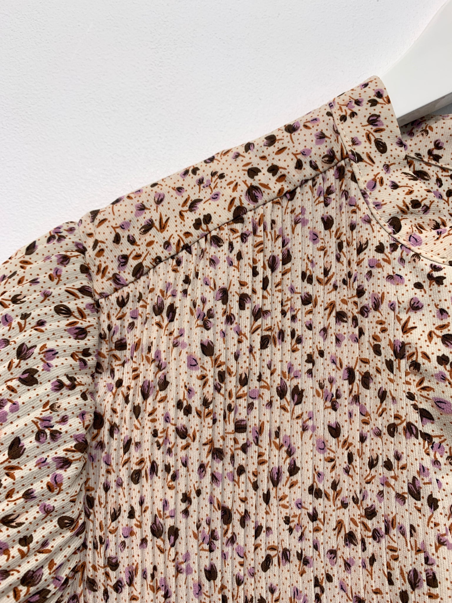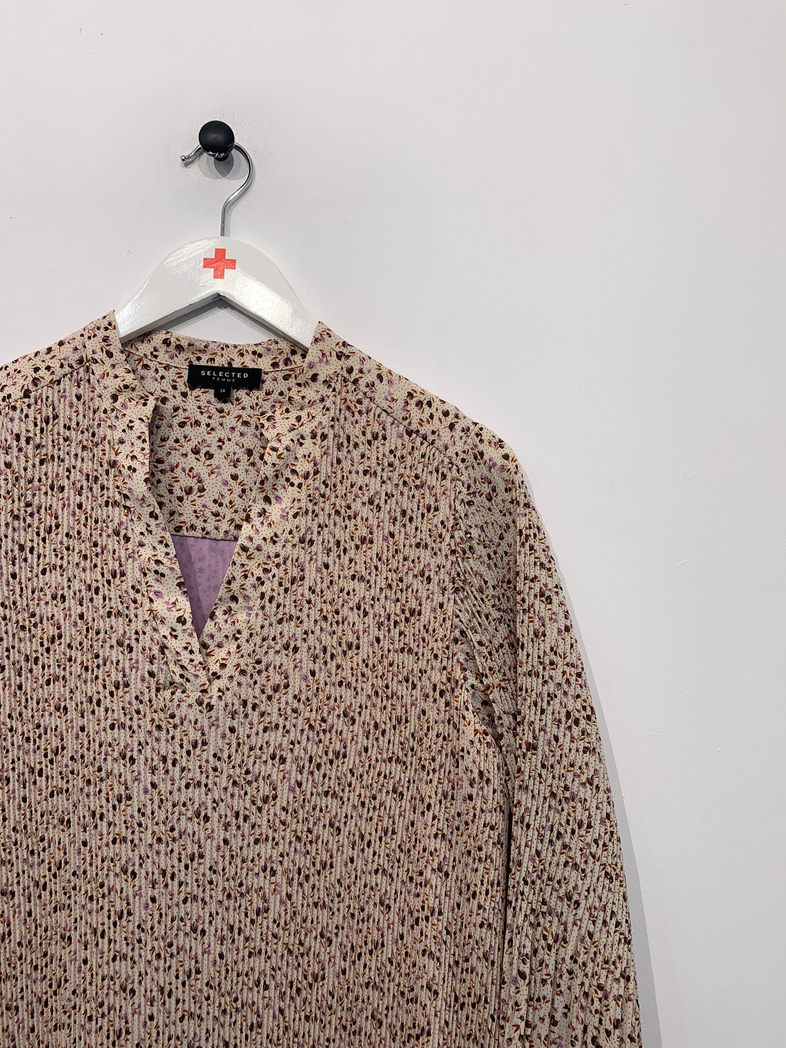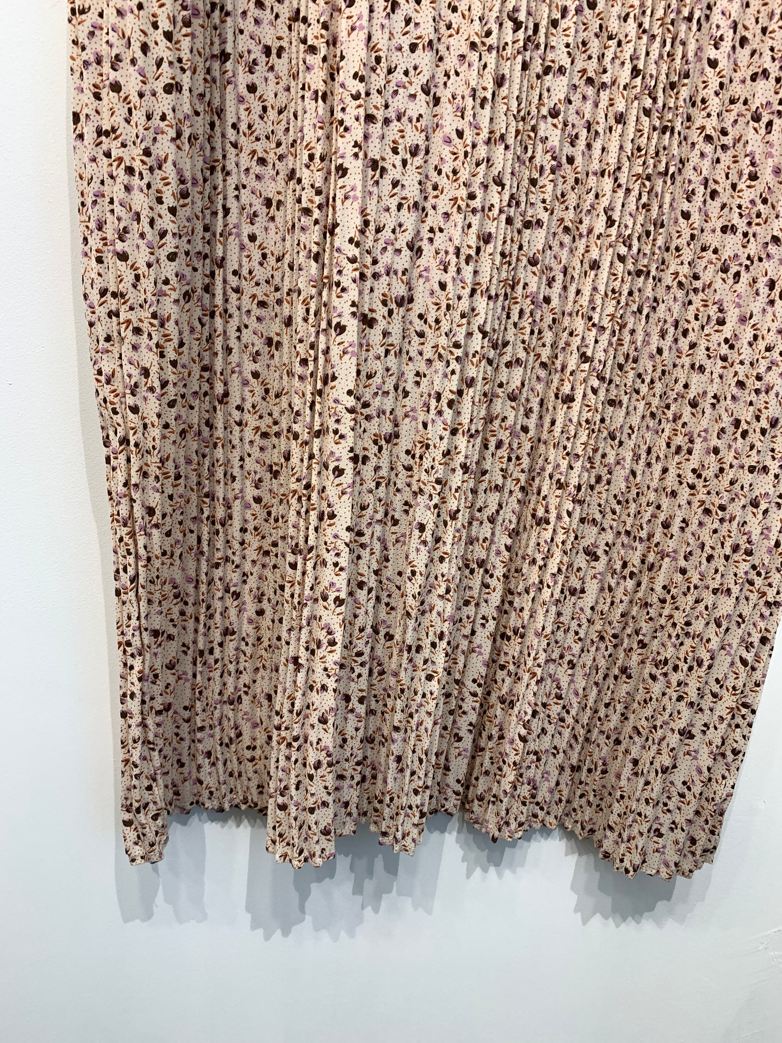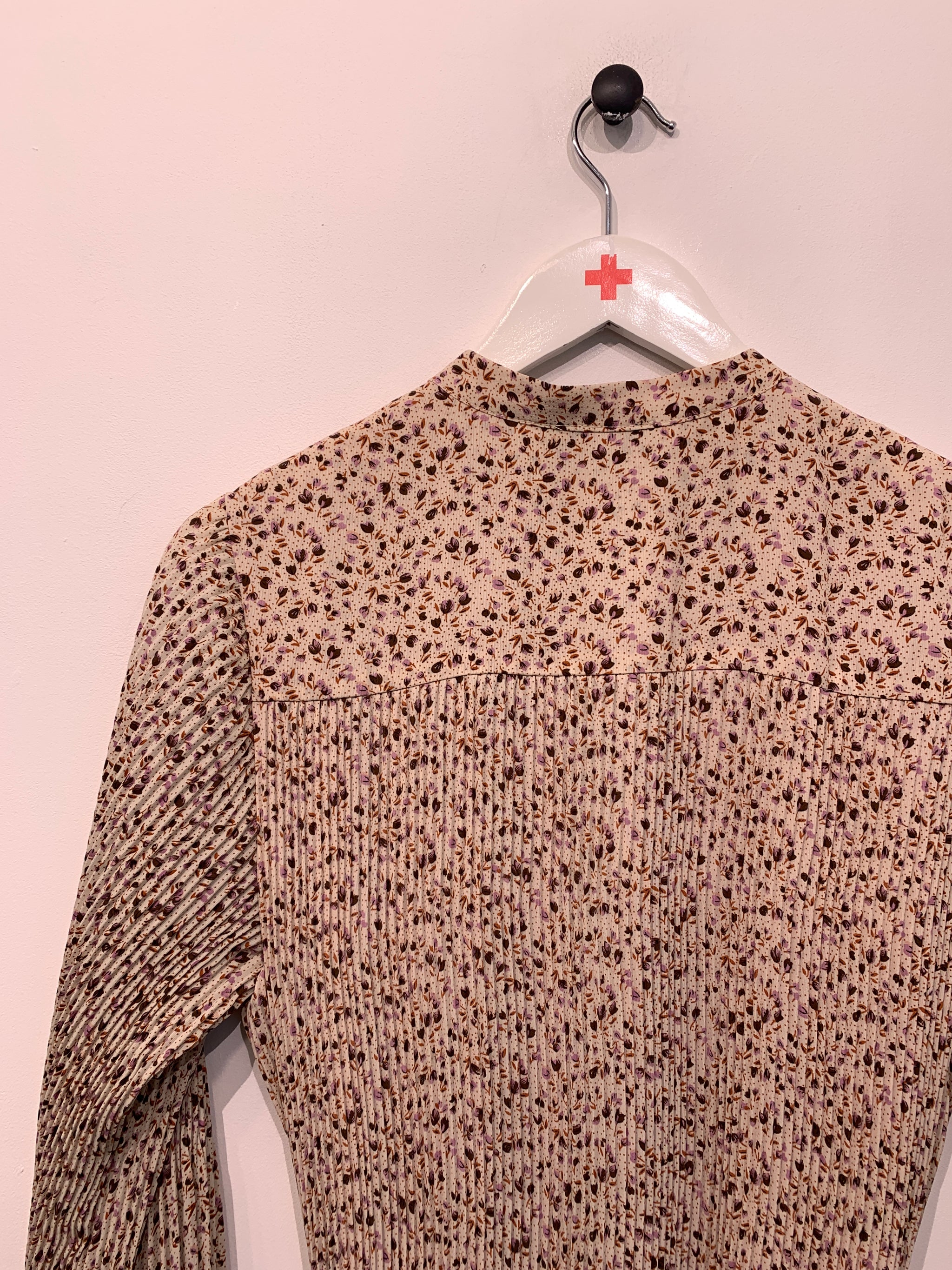 Kjole i smalt plisseret stof med v-udskæring, lange ærmer og bindebånd i taljen. Vaskemærke mangler.