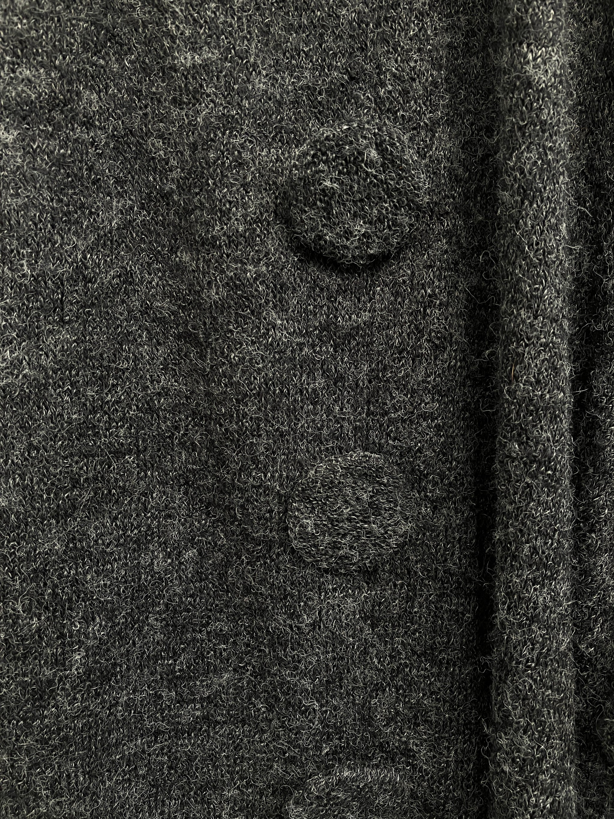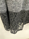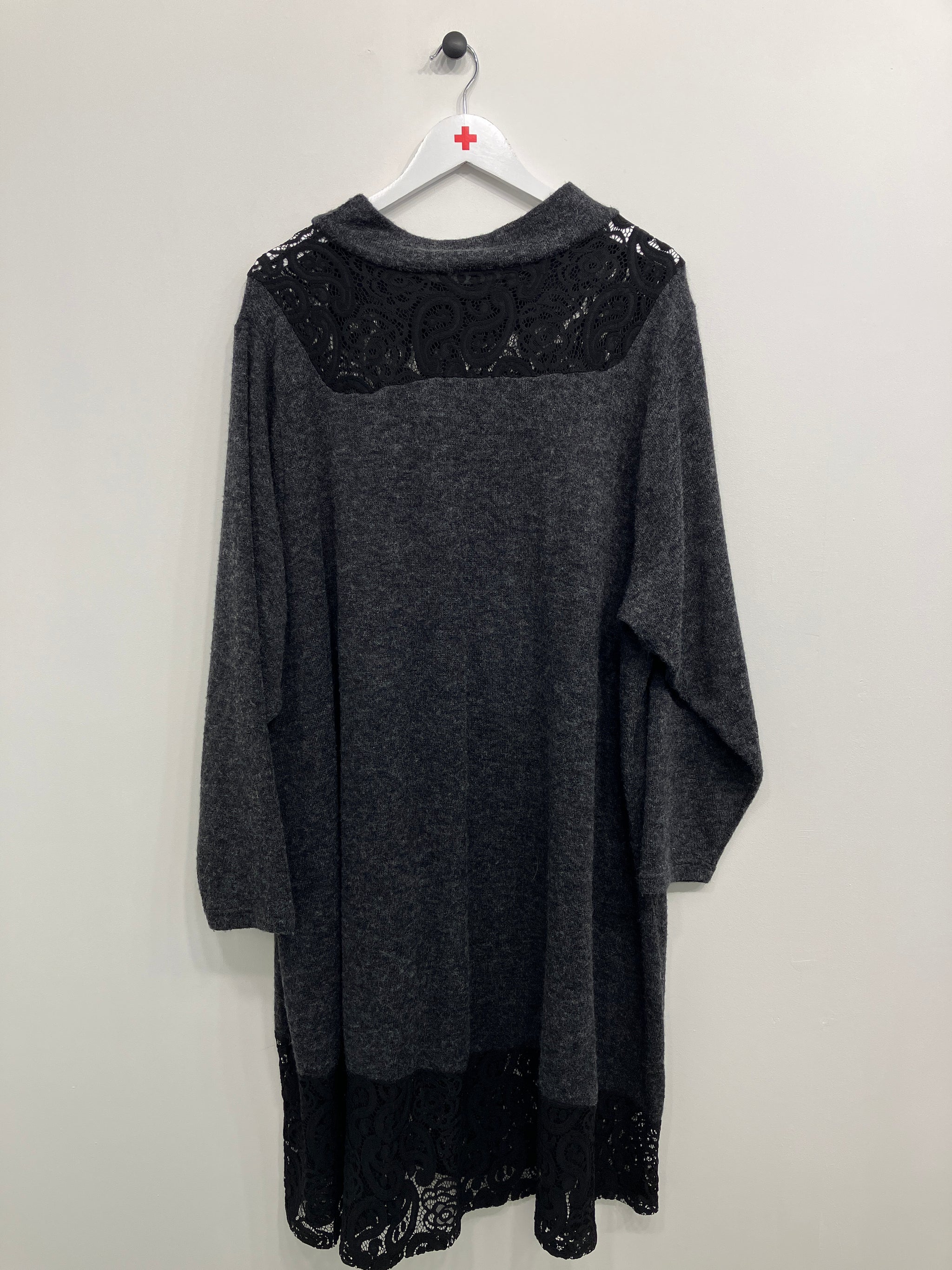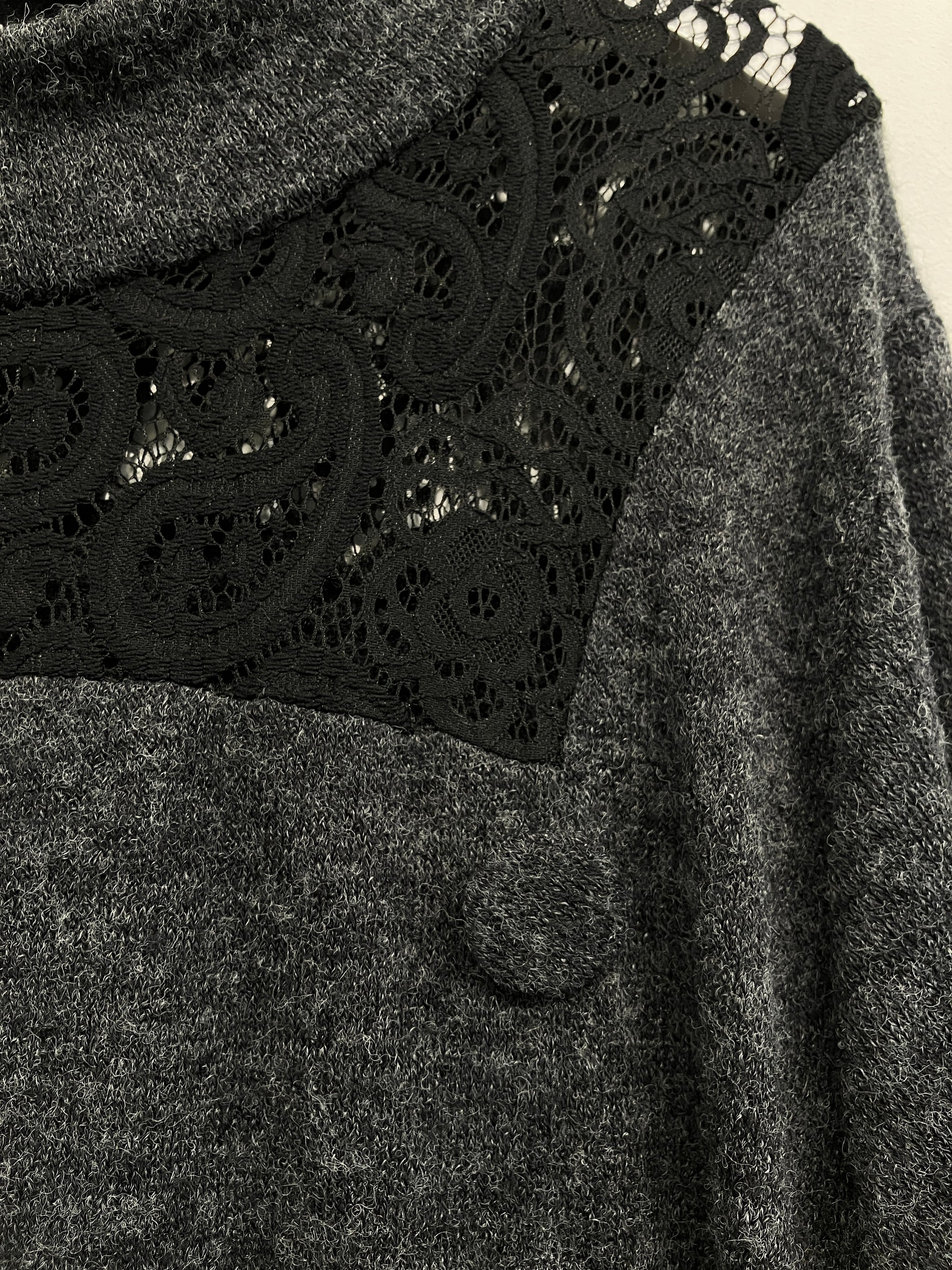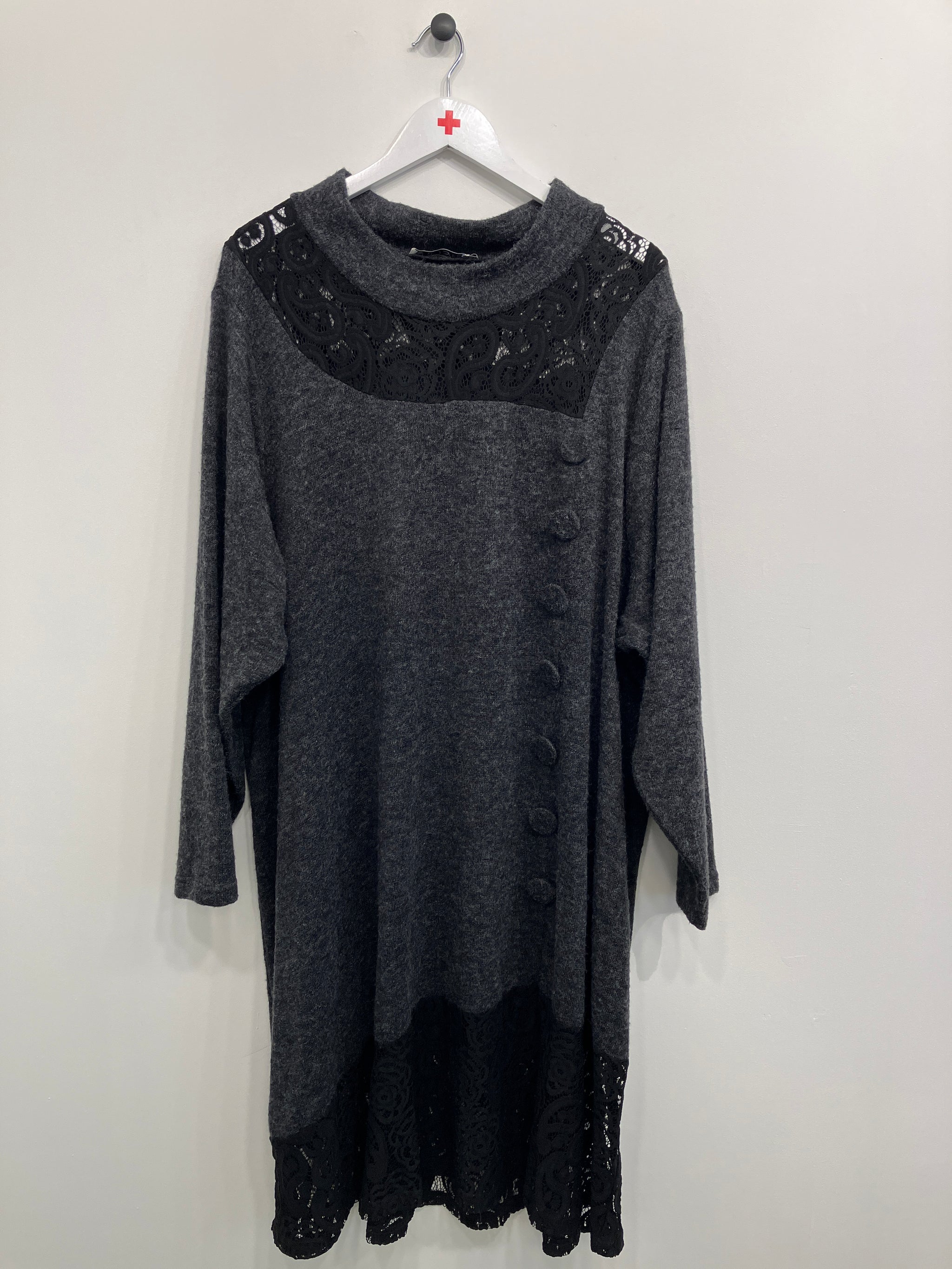 Kjole med rund hals og lange ærmer. Kjolen har store stofbeklædte knapper ned langs den ene side, et sort blondestykke på den nederste del af kjolen og også på det øverste stykke omkring skuldre, bryst og ryg.