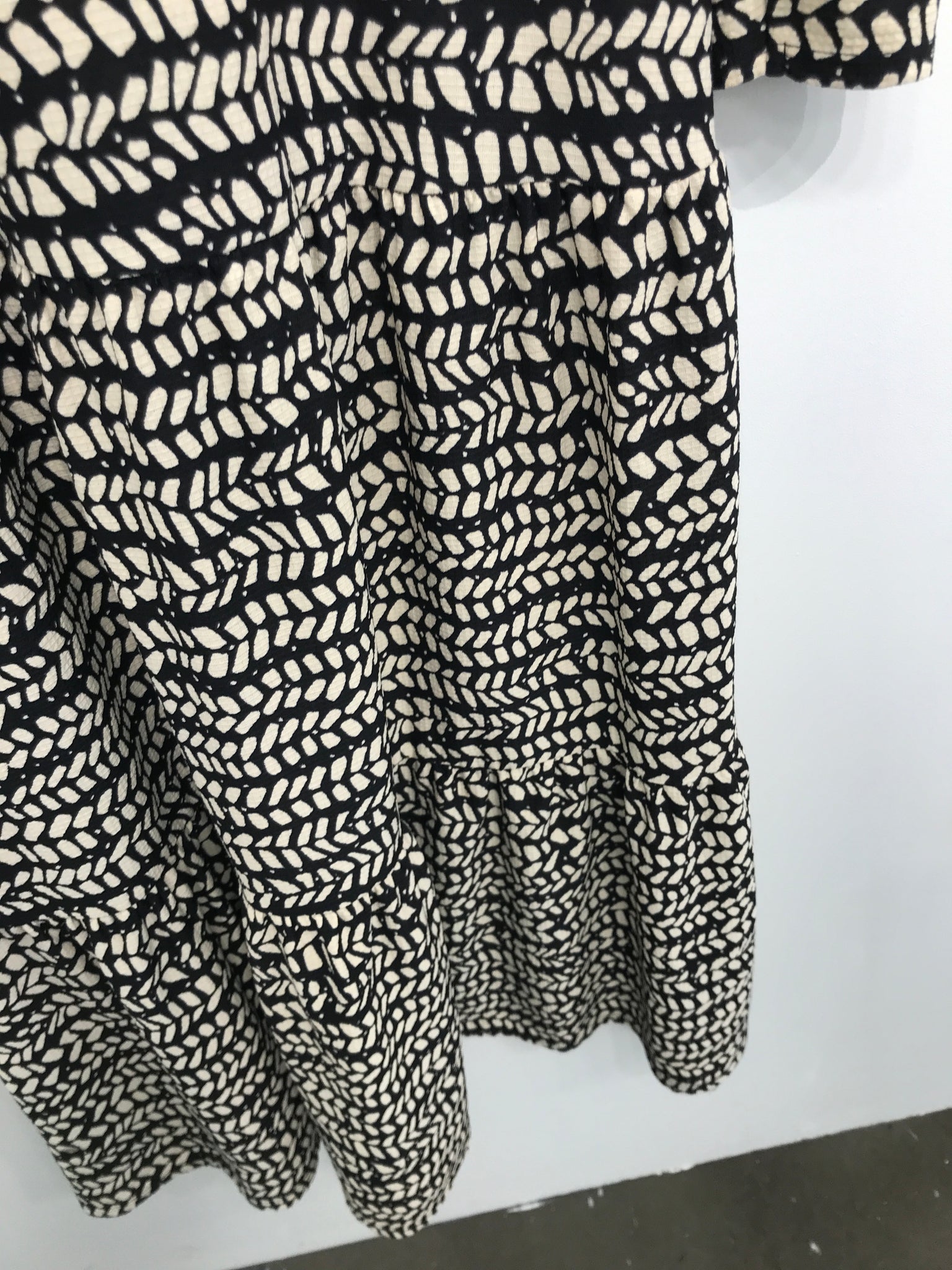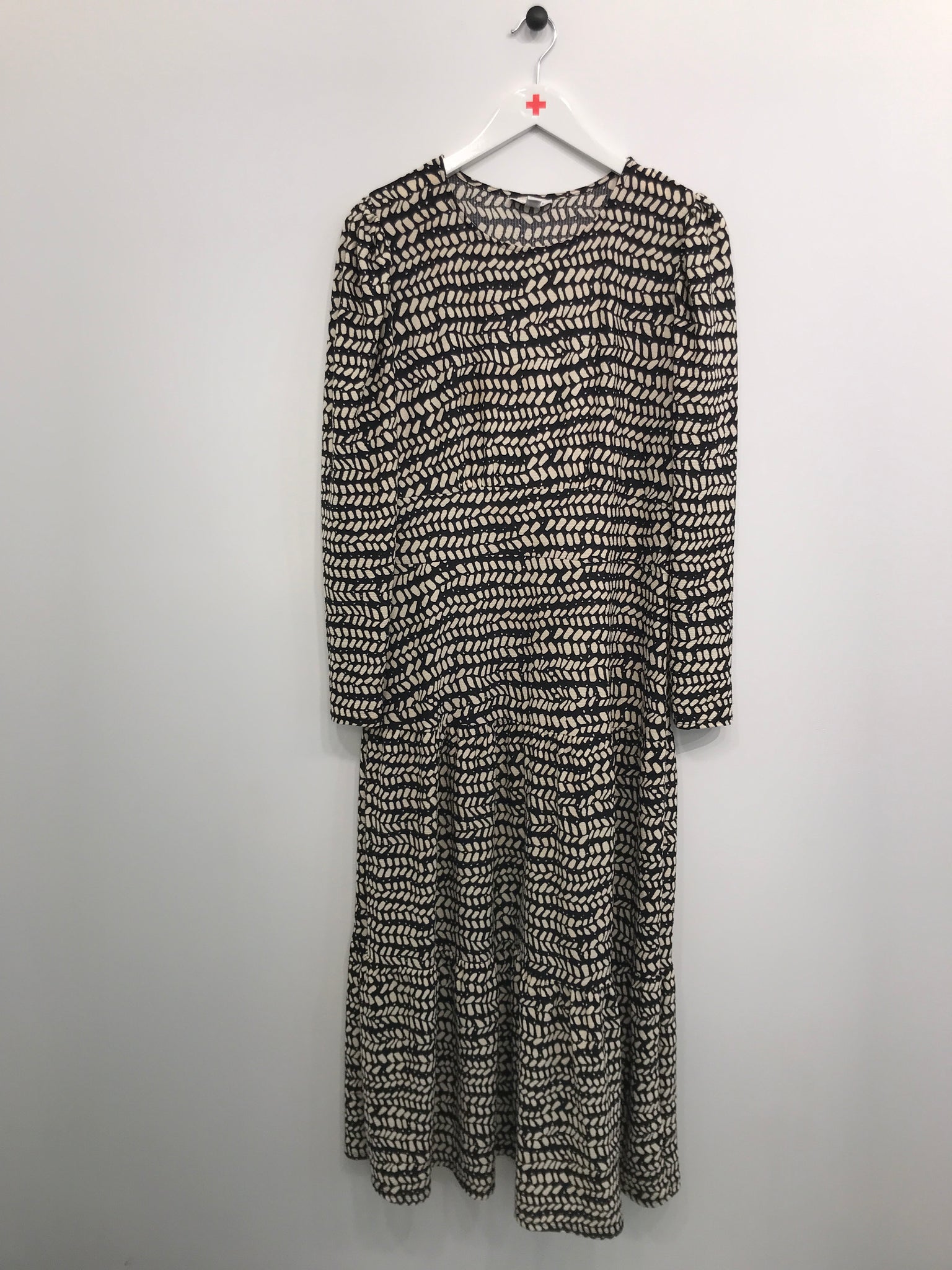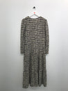 Lang kjole med rund hals, lange ærmer og etagesyninger.