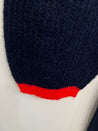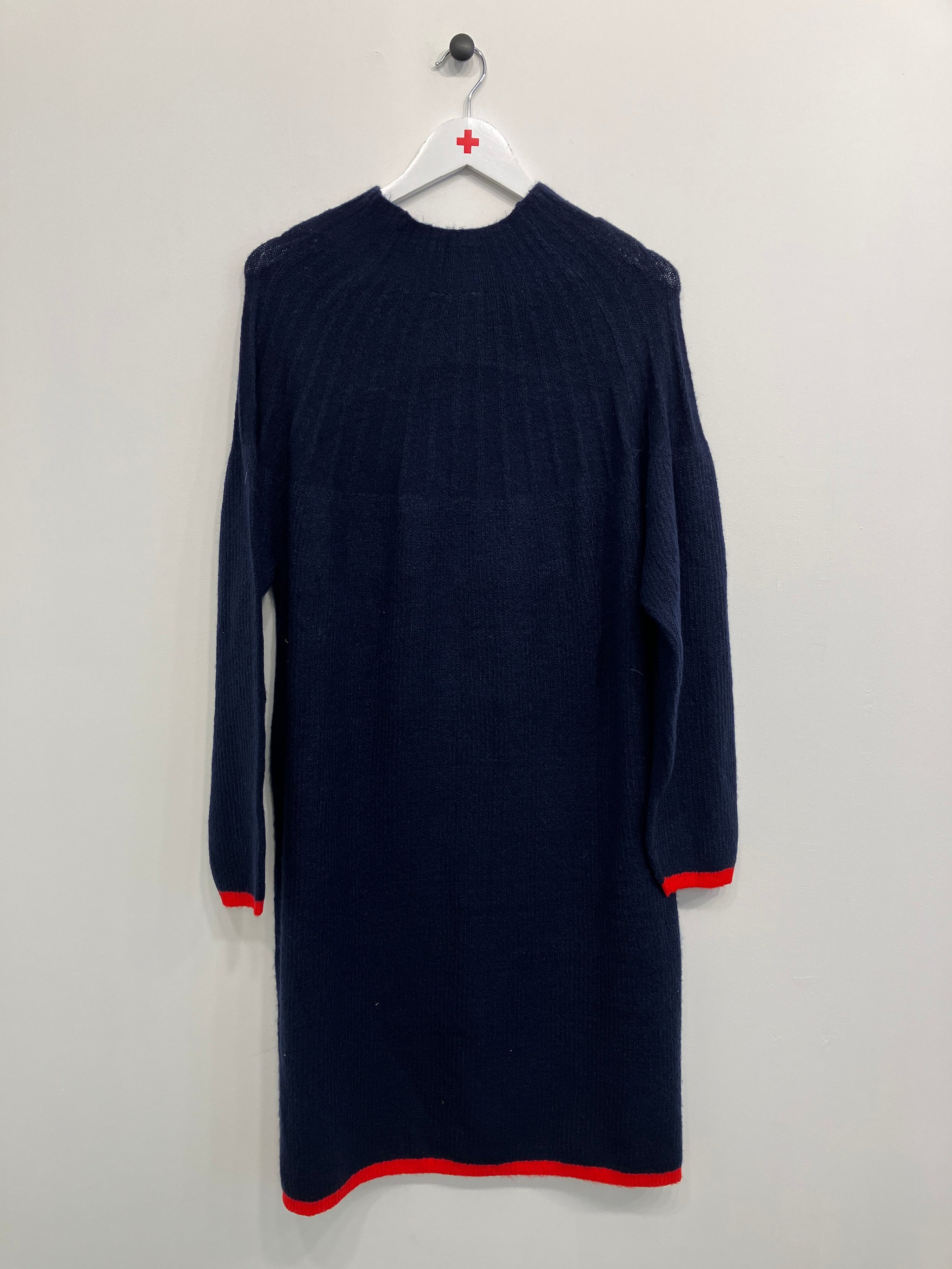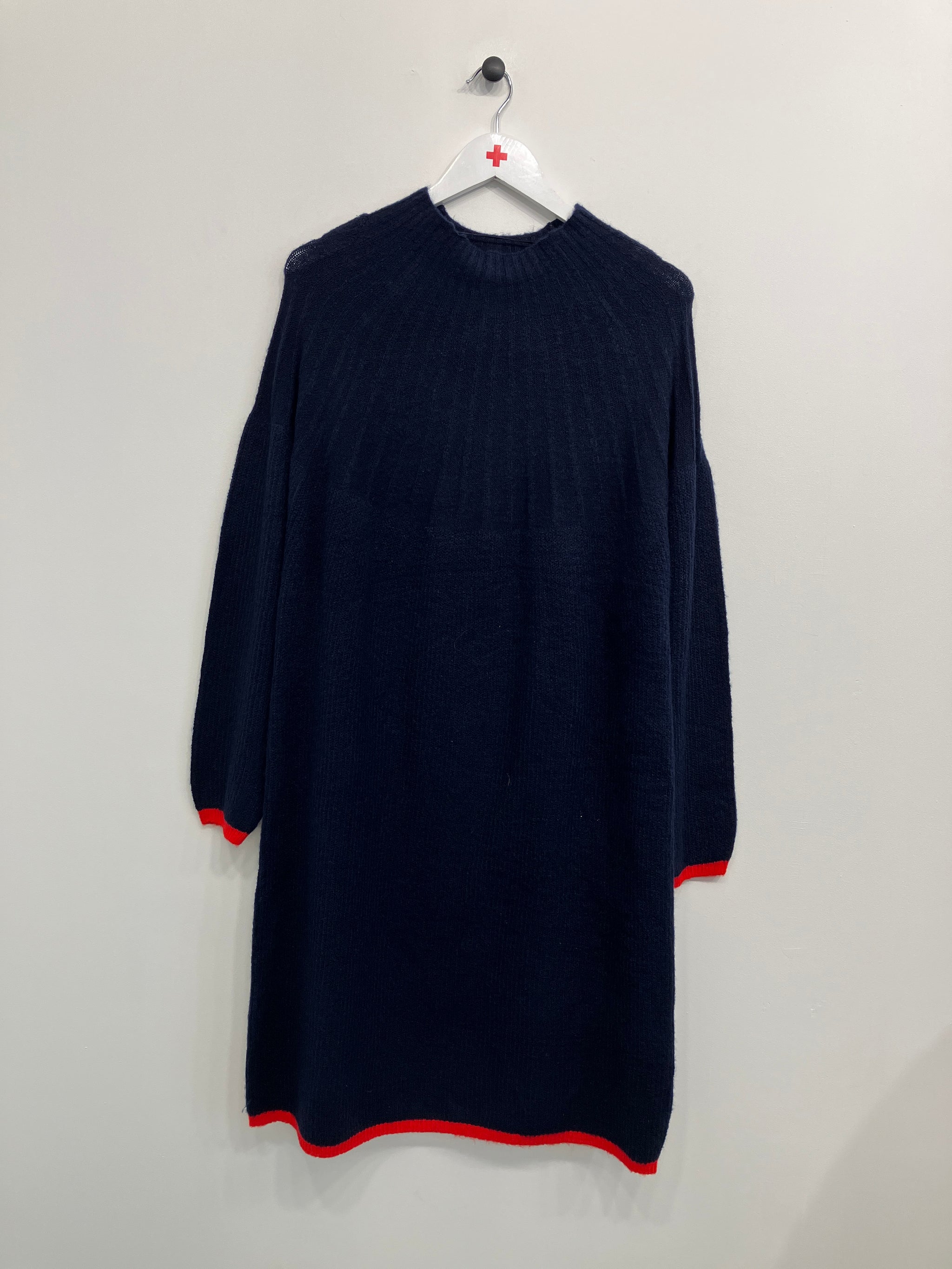 Kjole i løs pasform med lange ærmer og rund hals. I bund og ved ærmer afsluttes med lille kant i rødlig pangfarve.