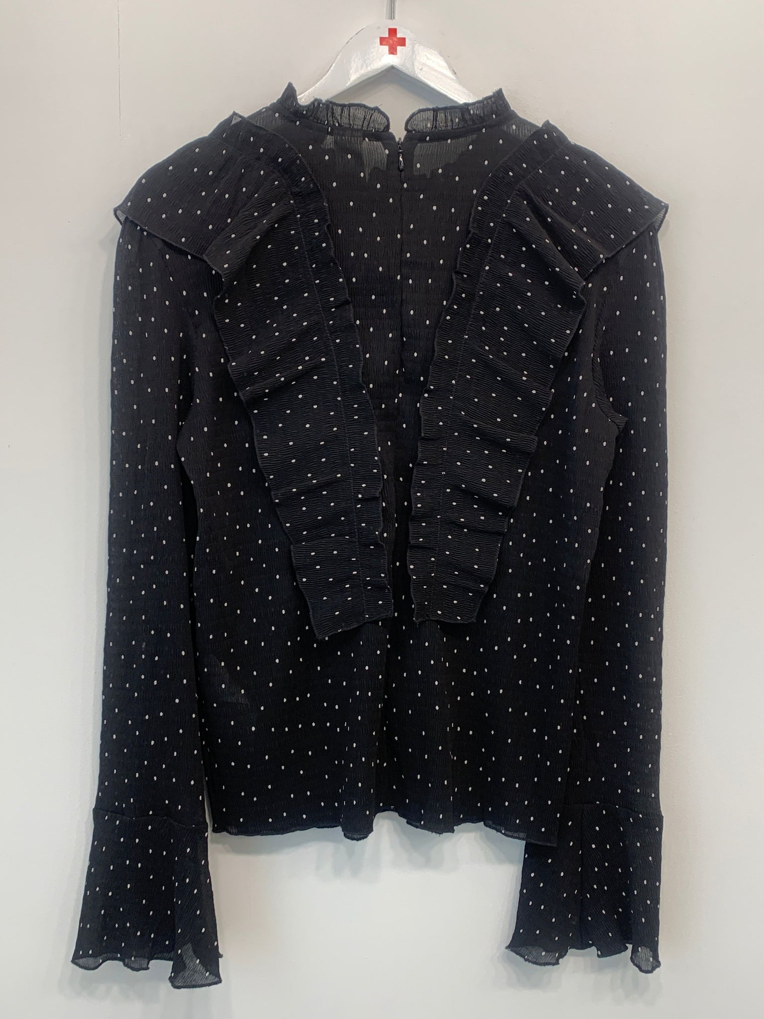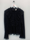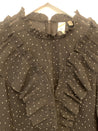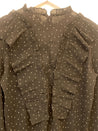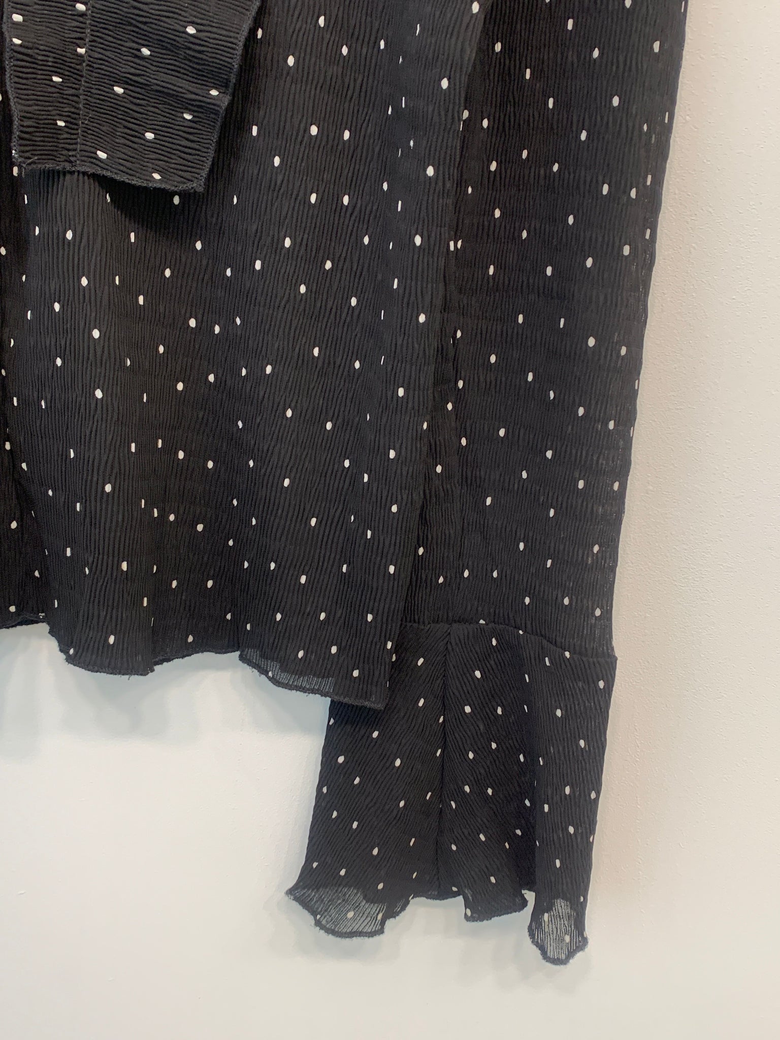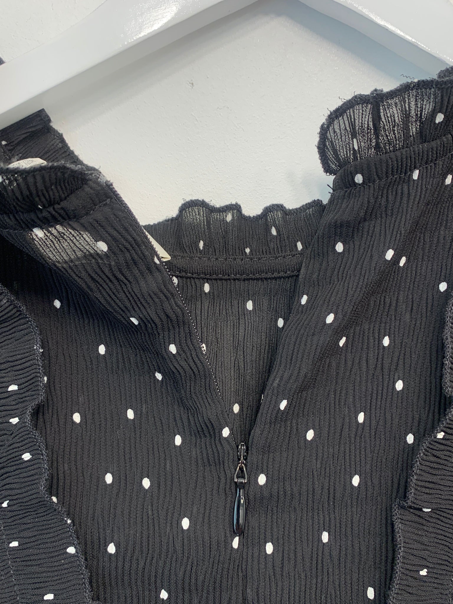Sort skjorte med hvide prikker, kalvekrøs og flæser samt lynlåslukning i nakken