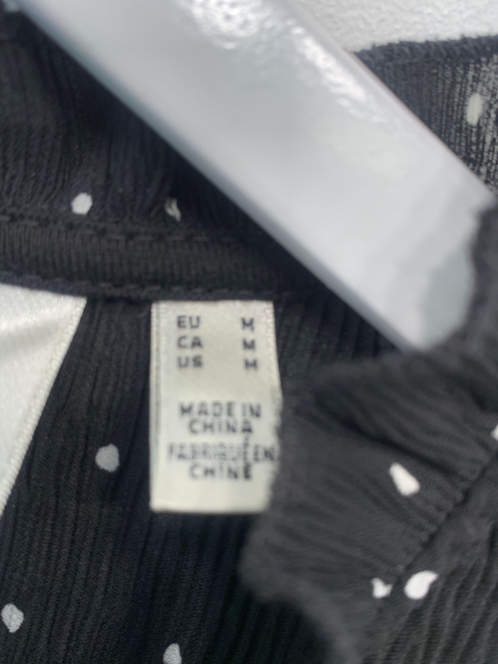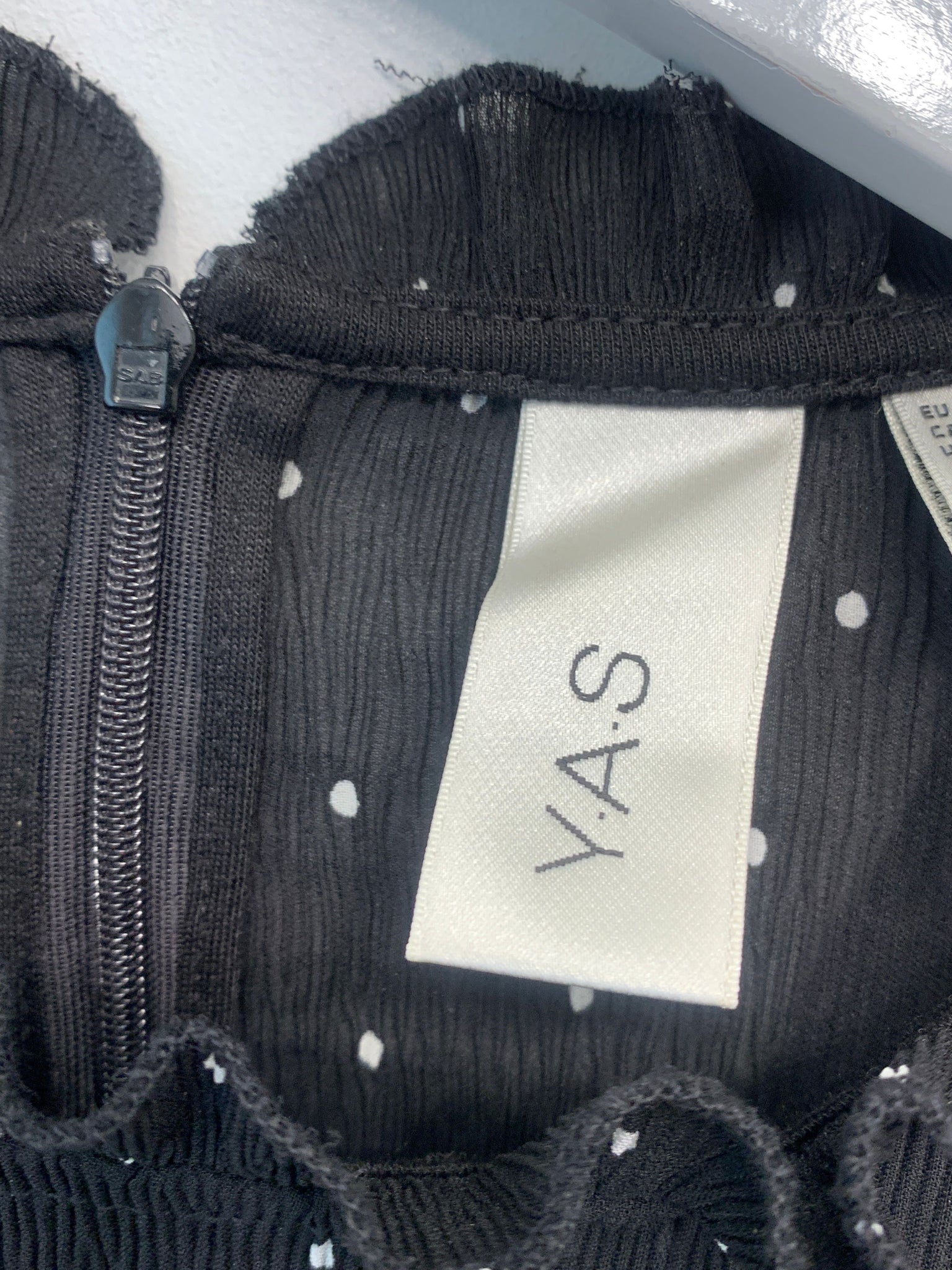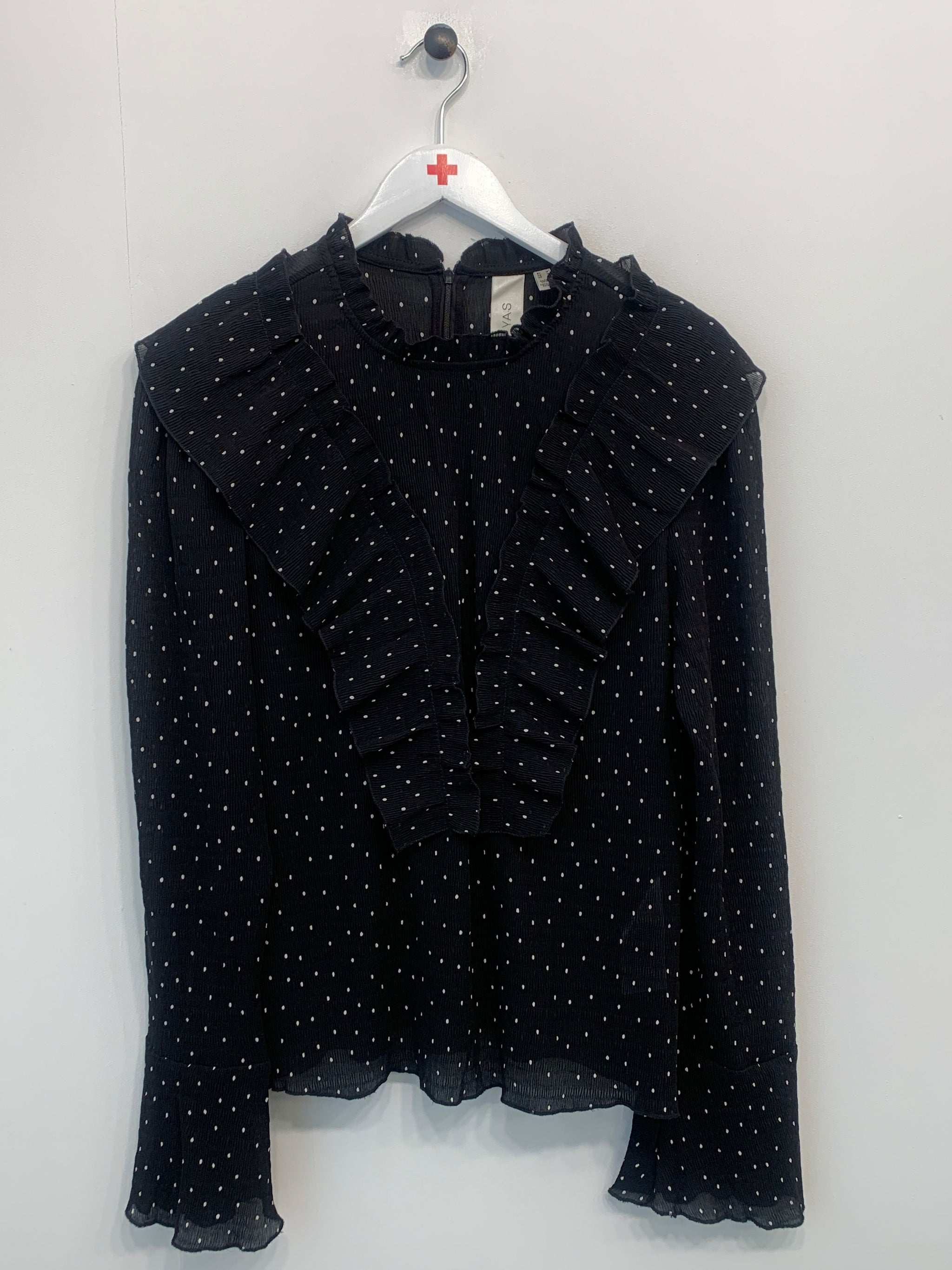 Sort skjorte med hvide prikker, kalvekrøs og flæser samt lynlåslukning i nakken