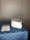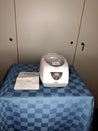 Produktet er en elektrisk maskine med en blank hvid overflade og et gennemsigtigt låg. Den har et digitalt display og knapper til indstilling. Materialet ser ud til at være plastik.