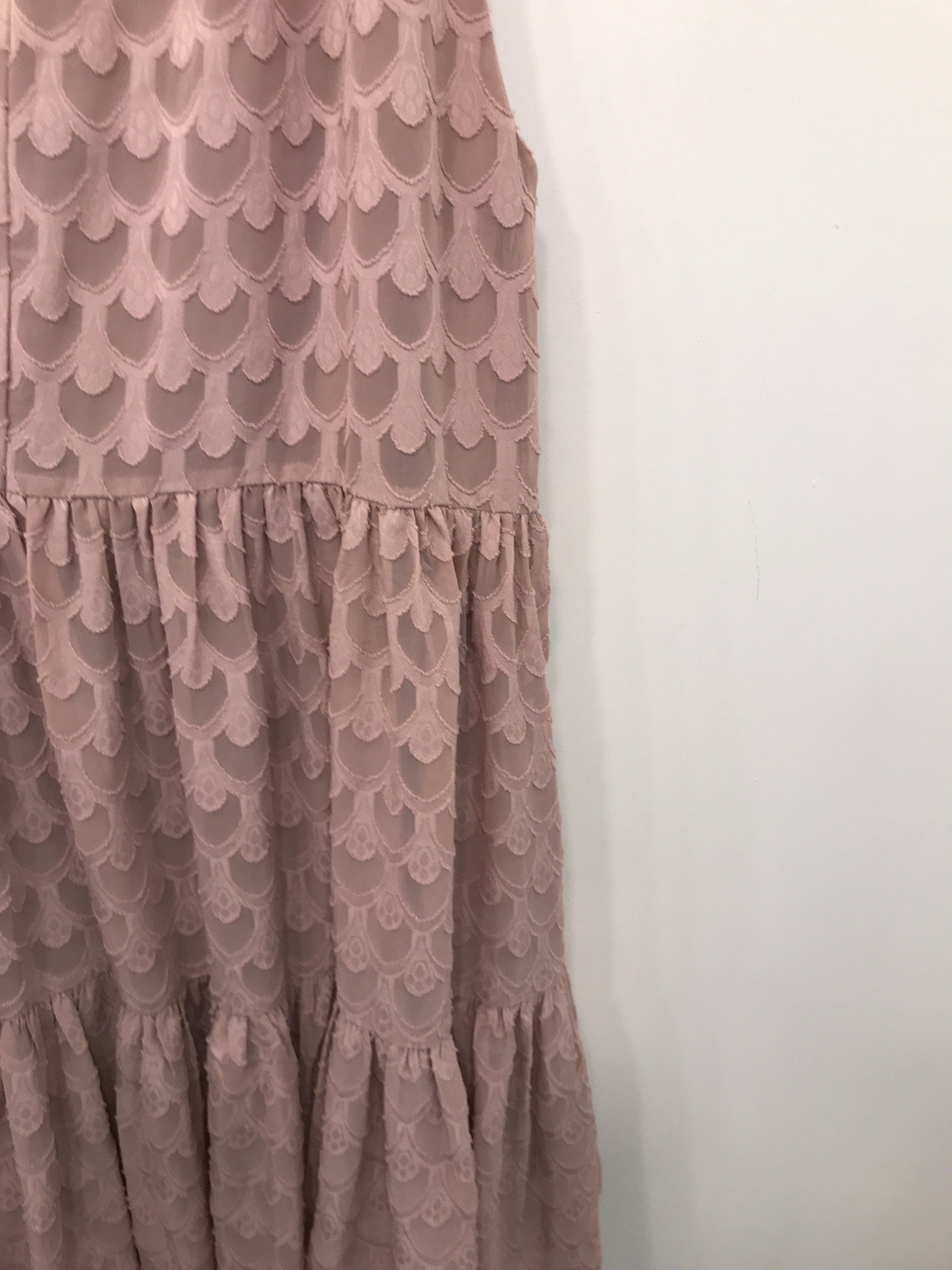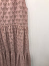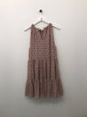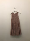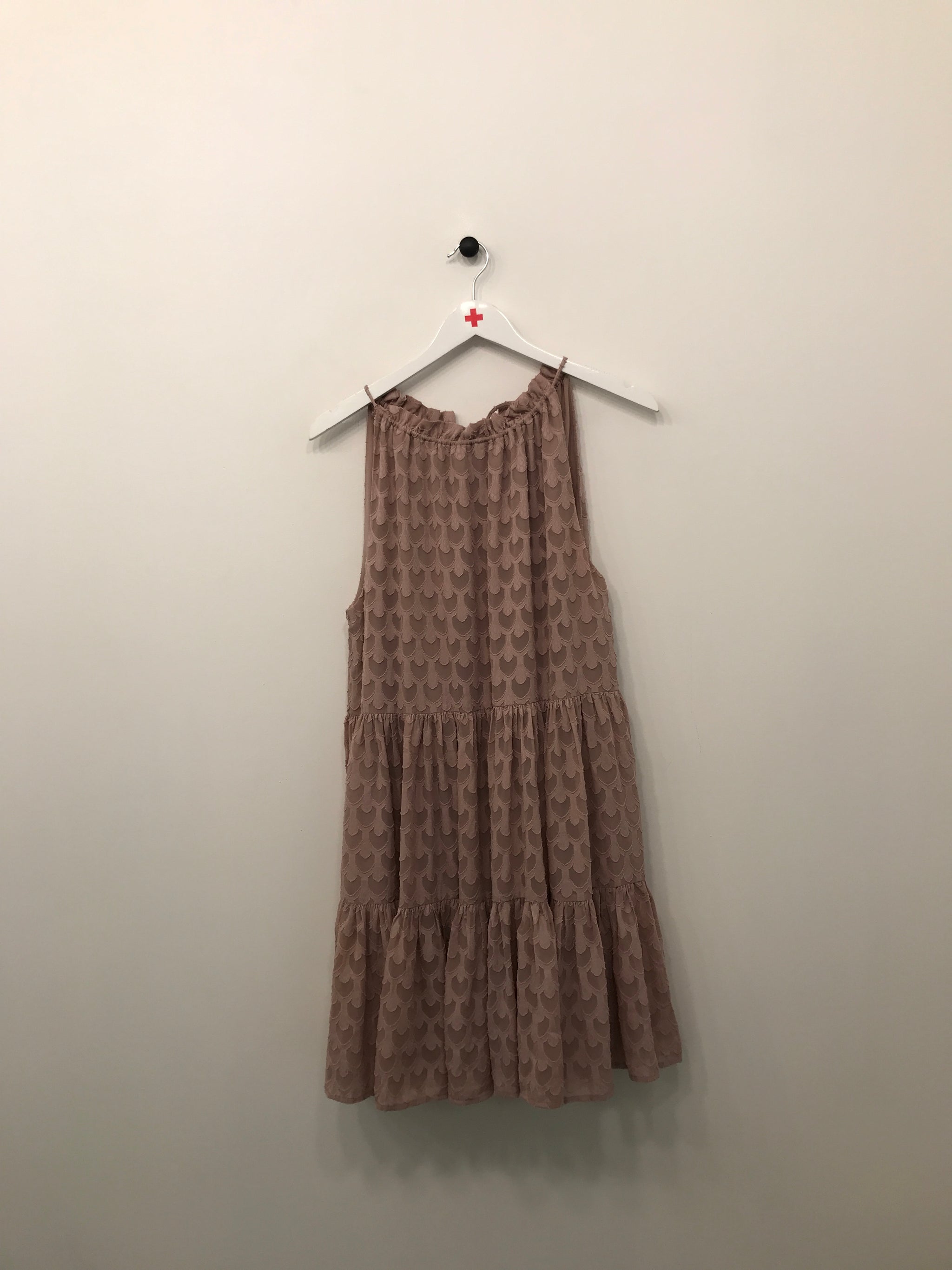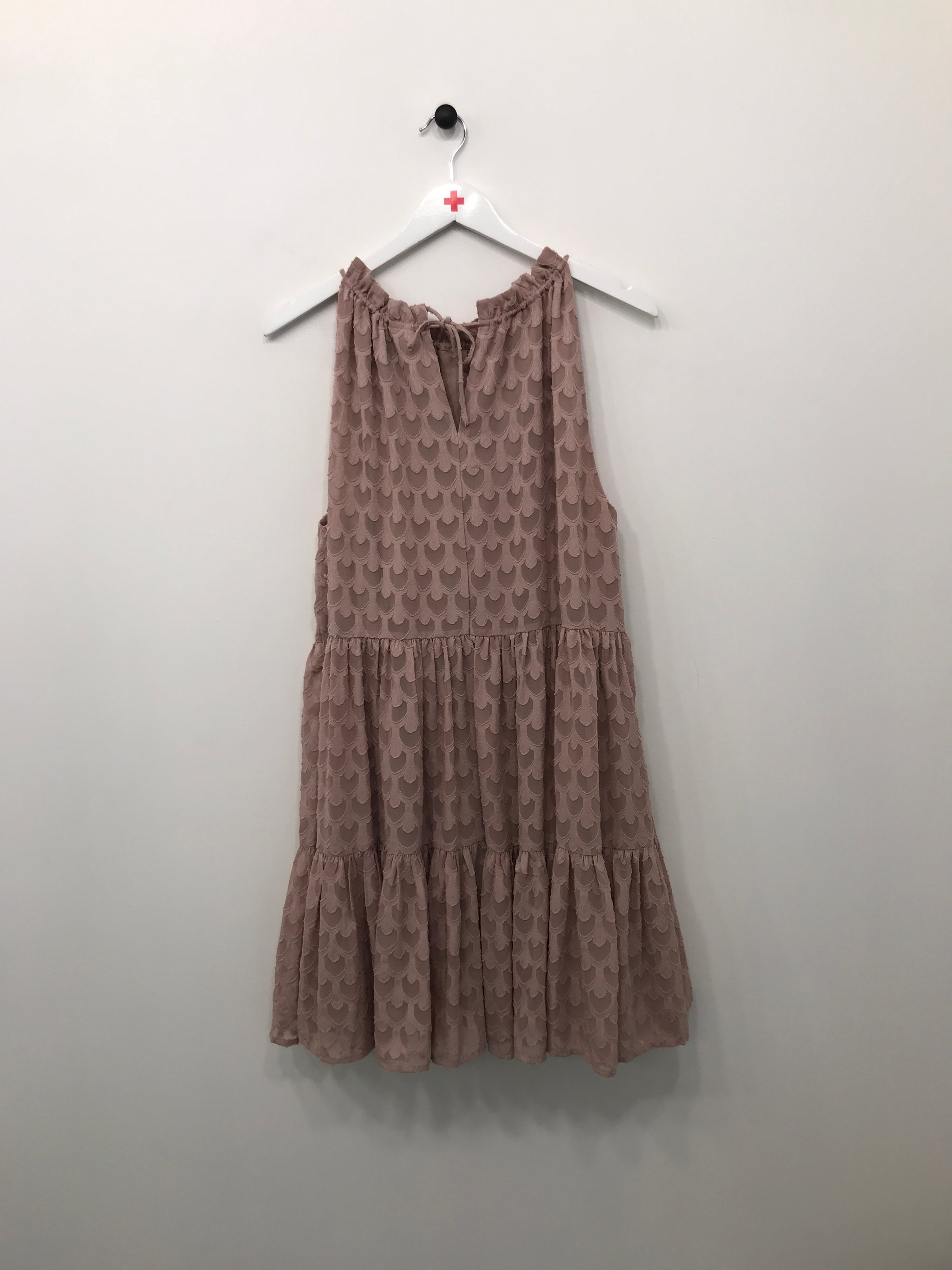 Ærmeløs kjole med flæse, elastik og bindebånd i udskæring.