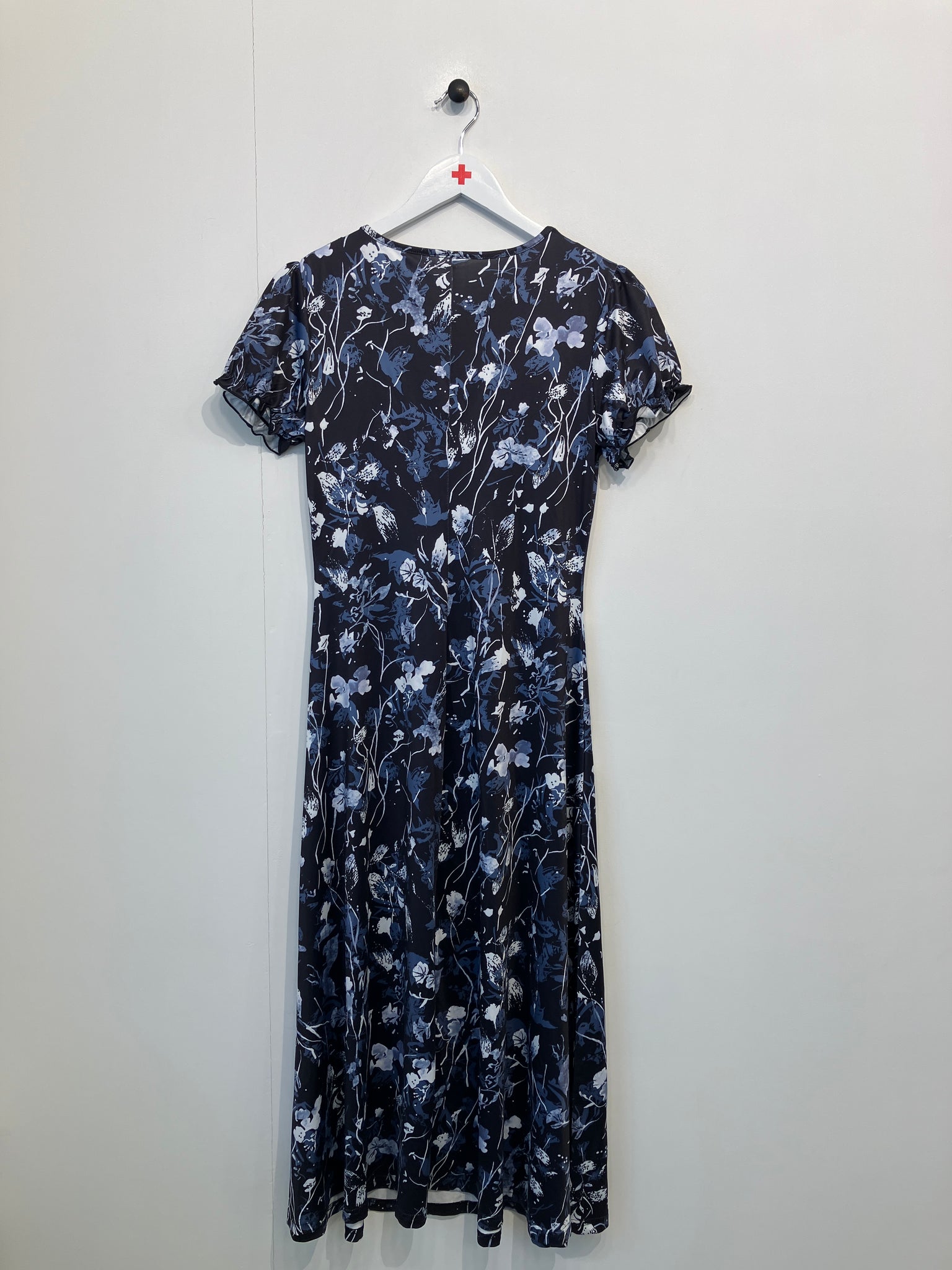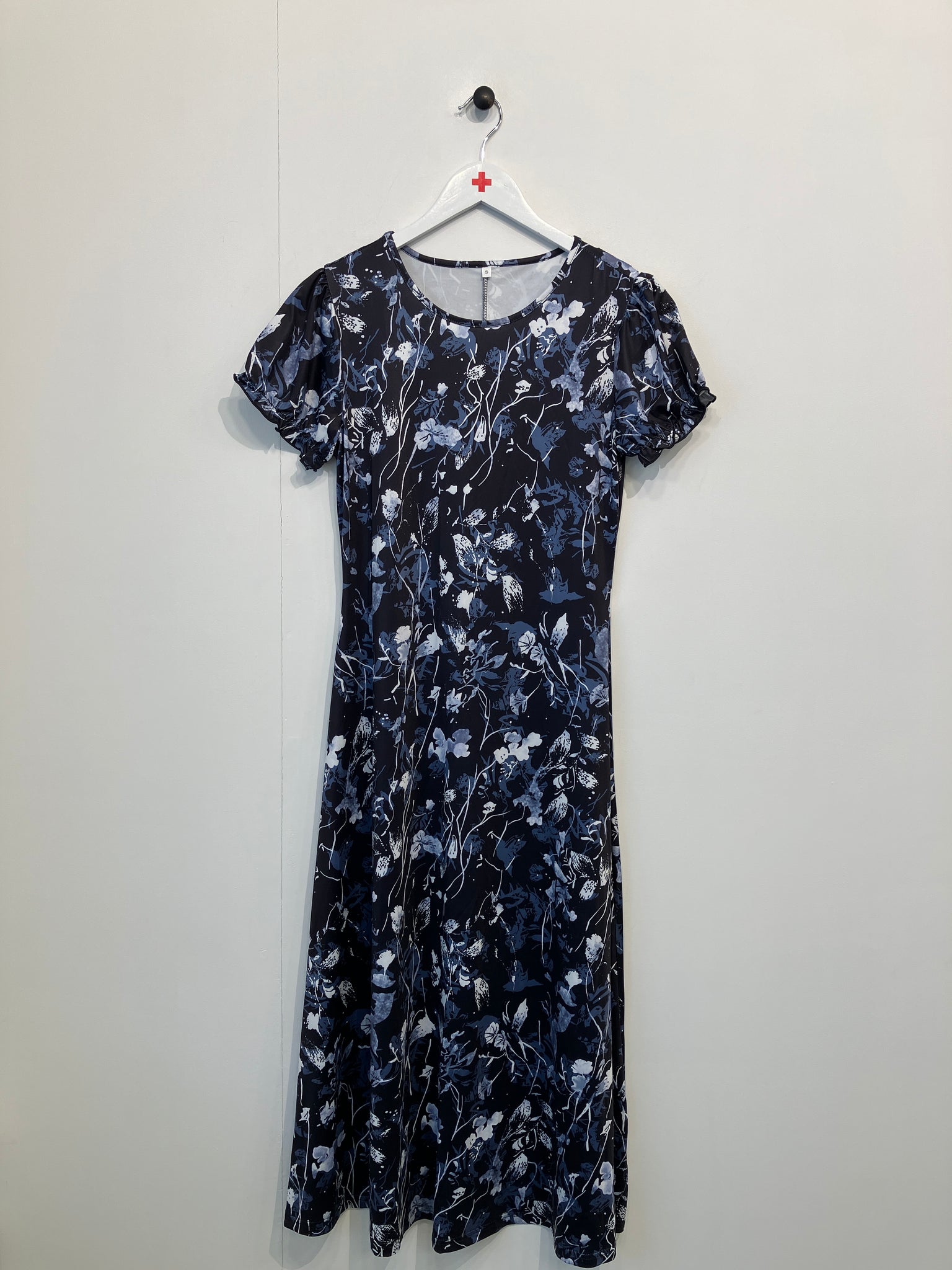 Sød, lang kjole med rund hals og korte ærmer med elastikkant.