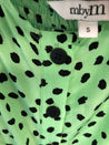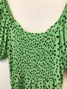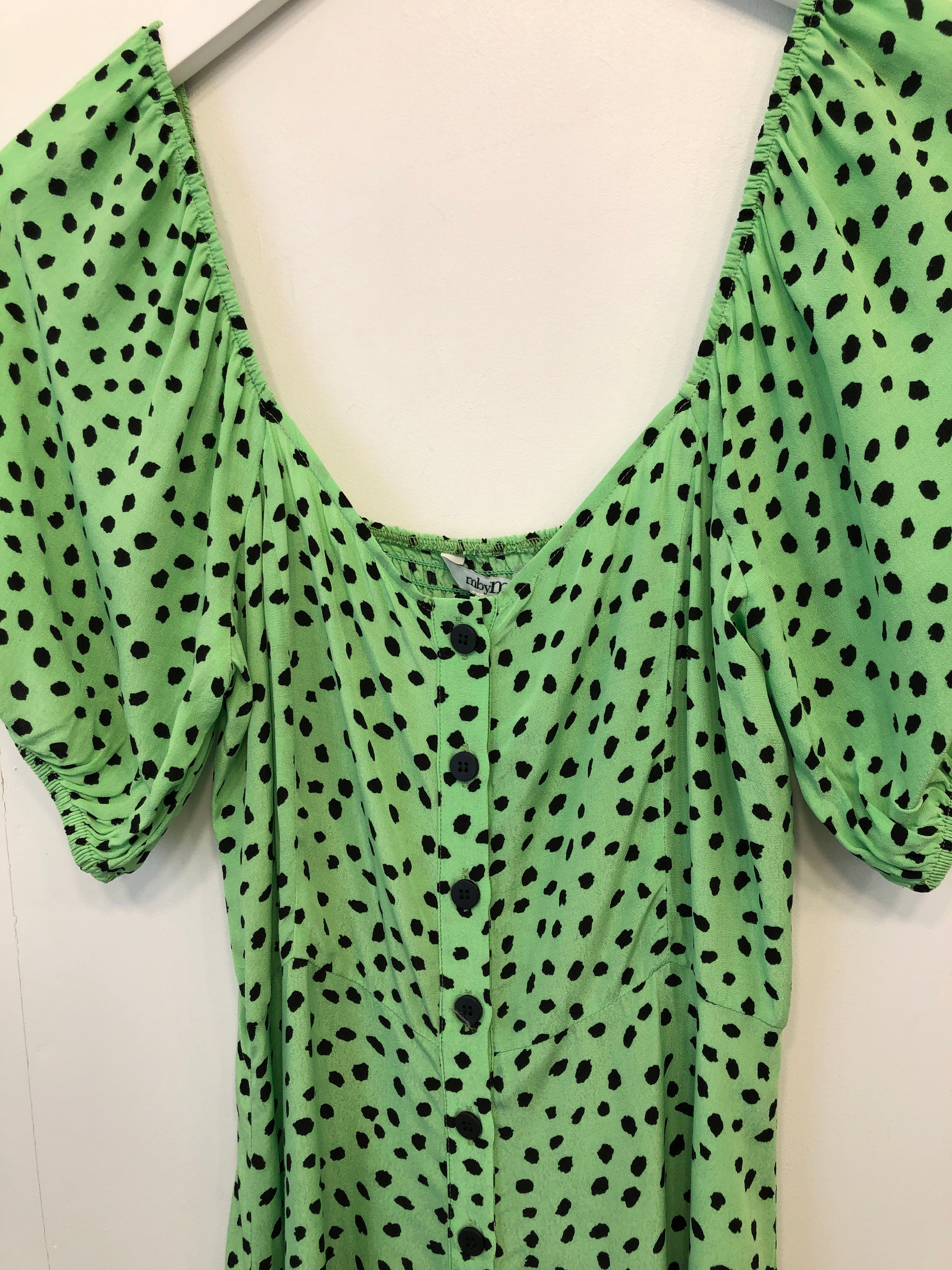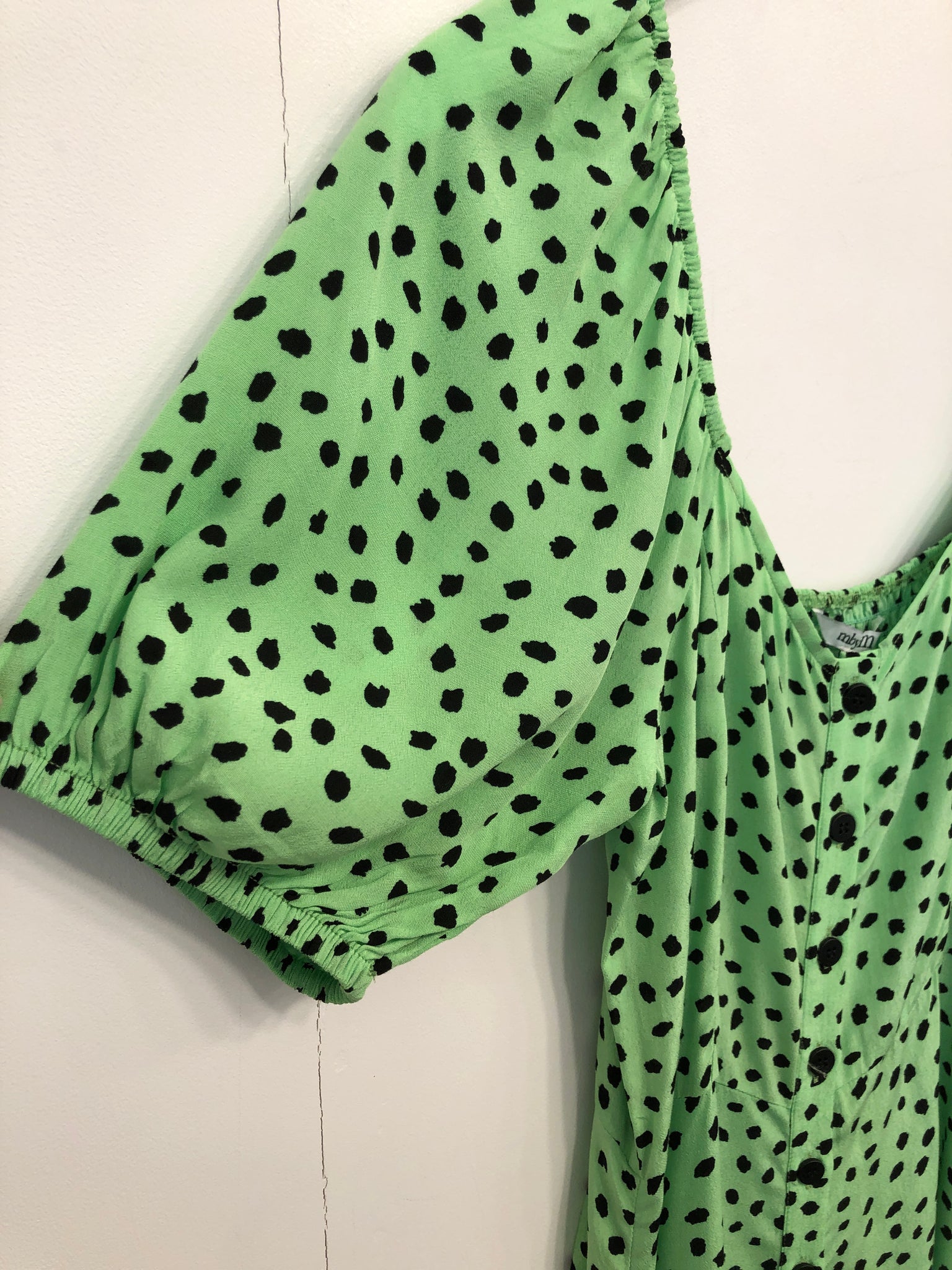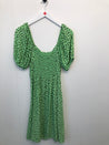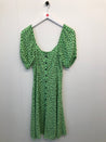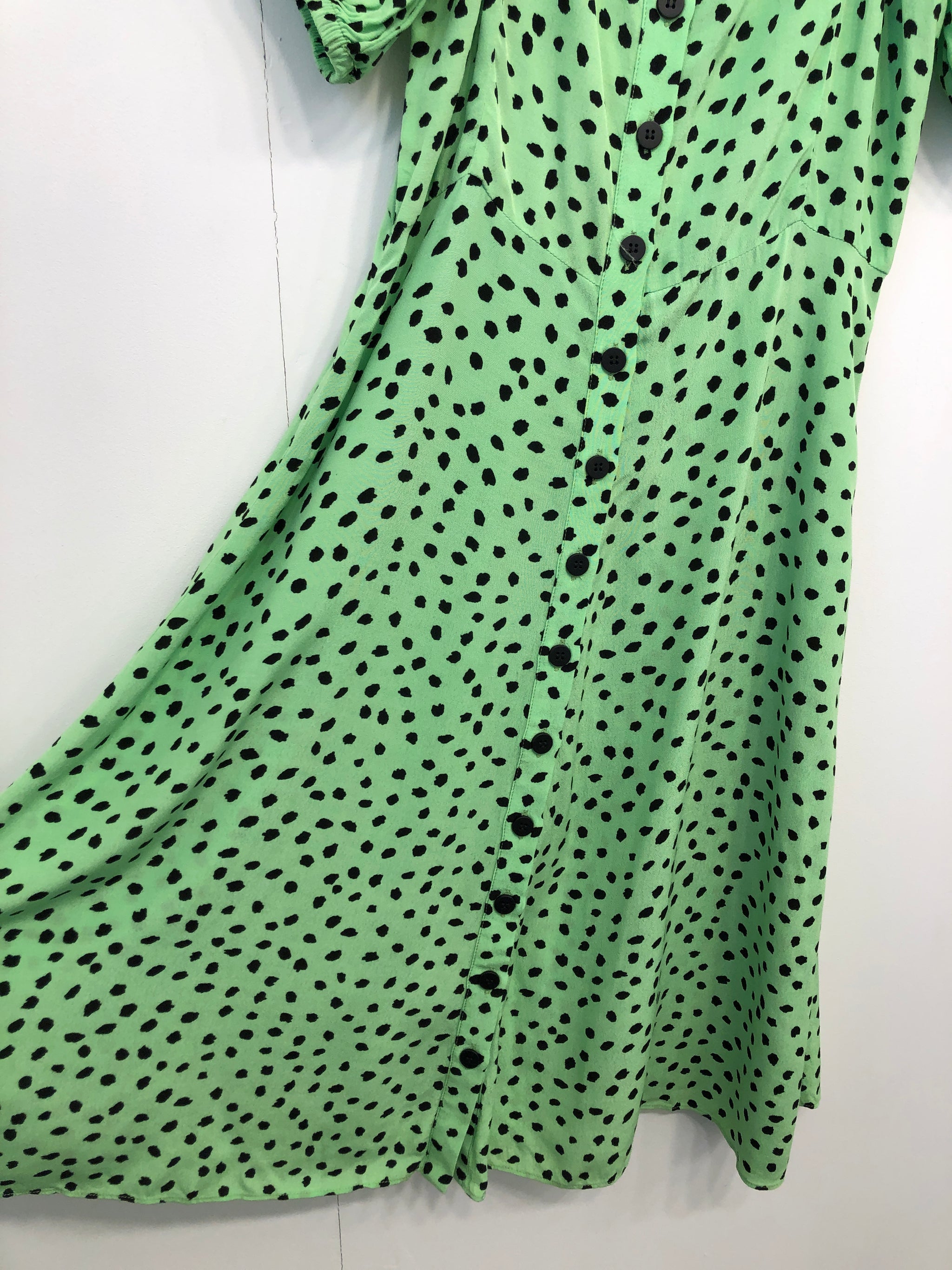 Kjole. Knaplukket, korte ærmer med vidde og elastik forneden, elastikbånd i ryg.