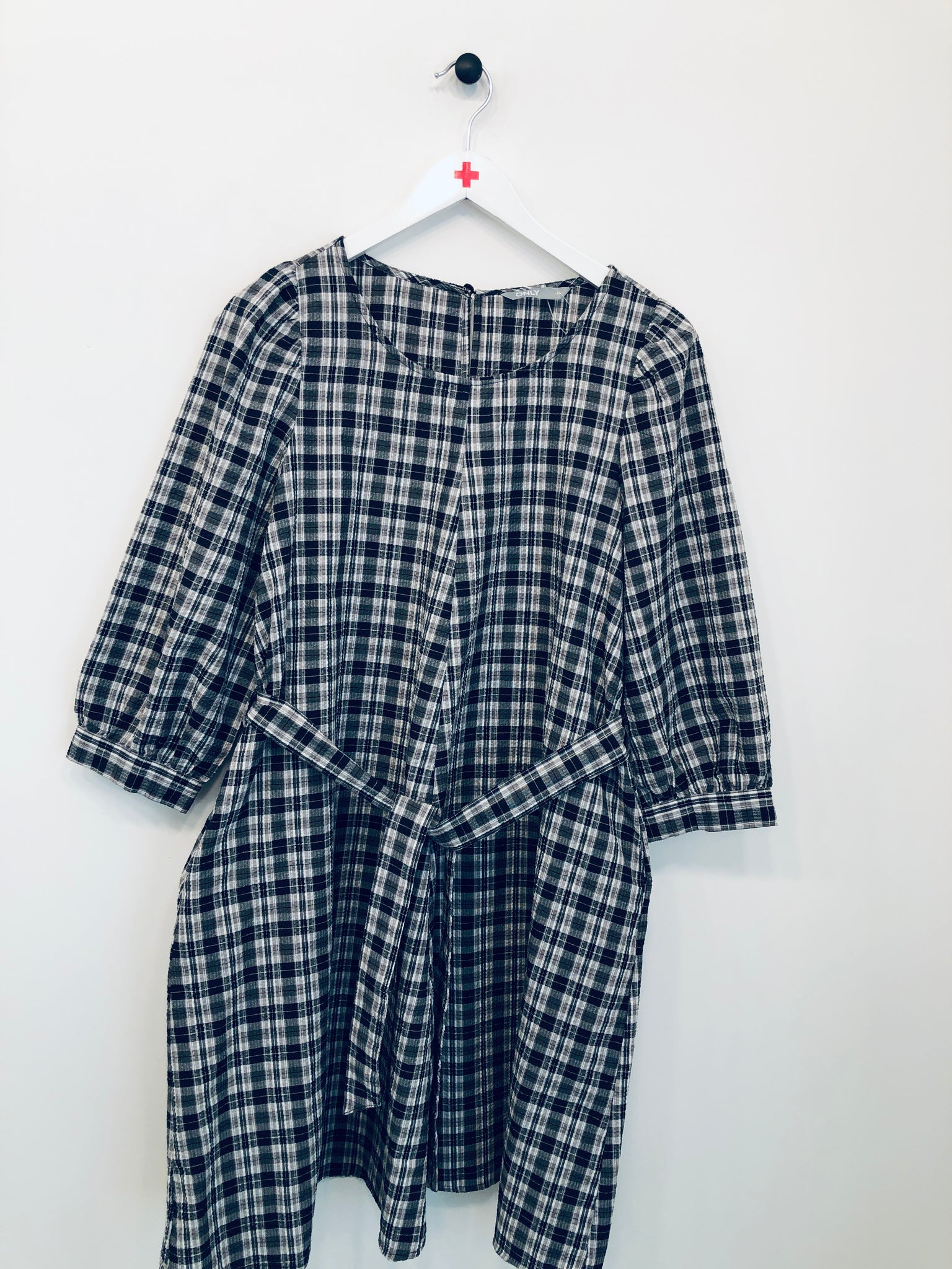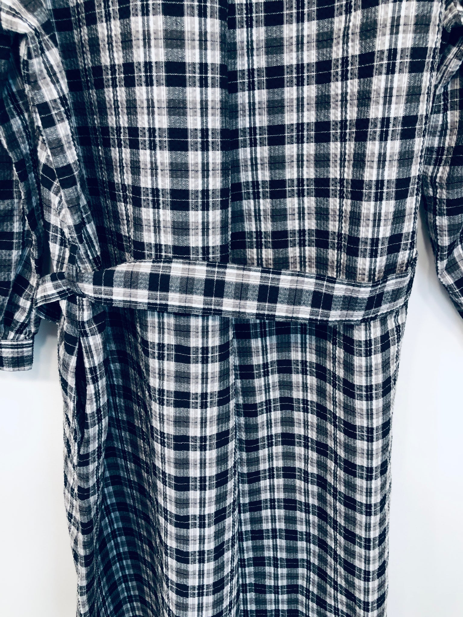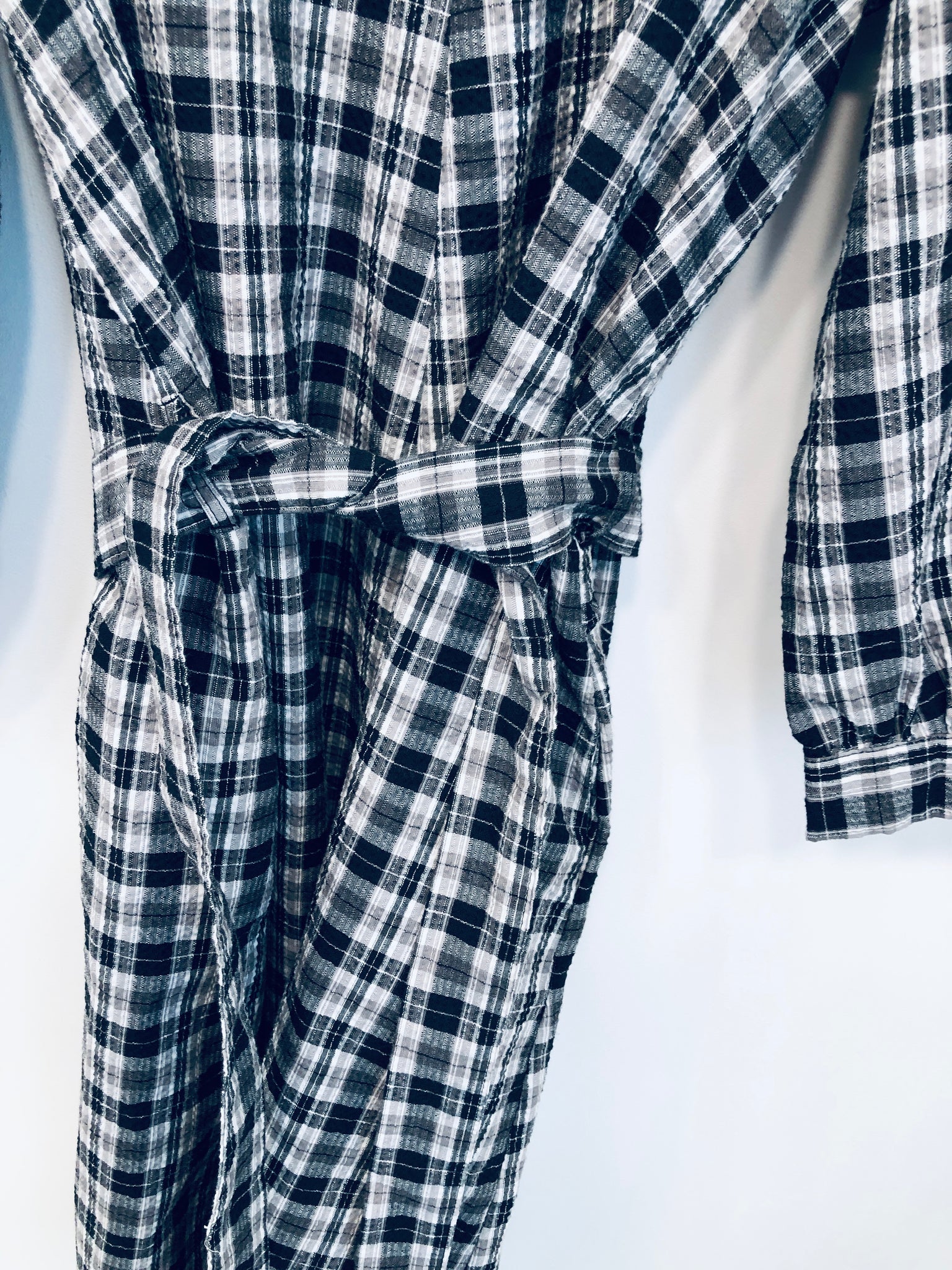 Flot hvid og grå ternet kjole med en snor rundt om taljen.