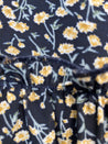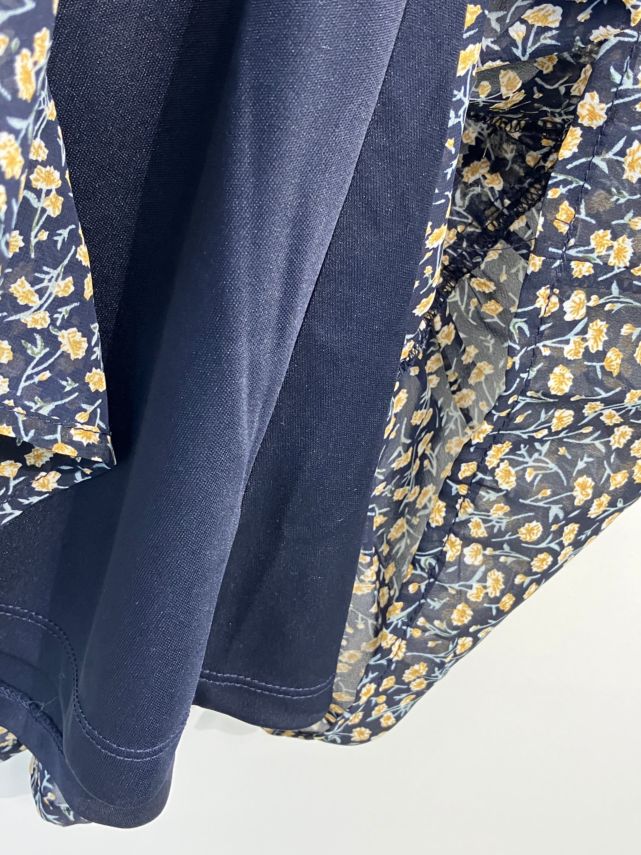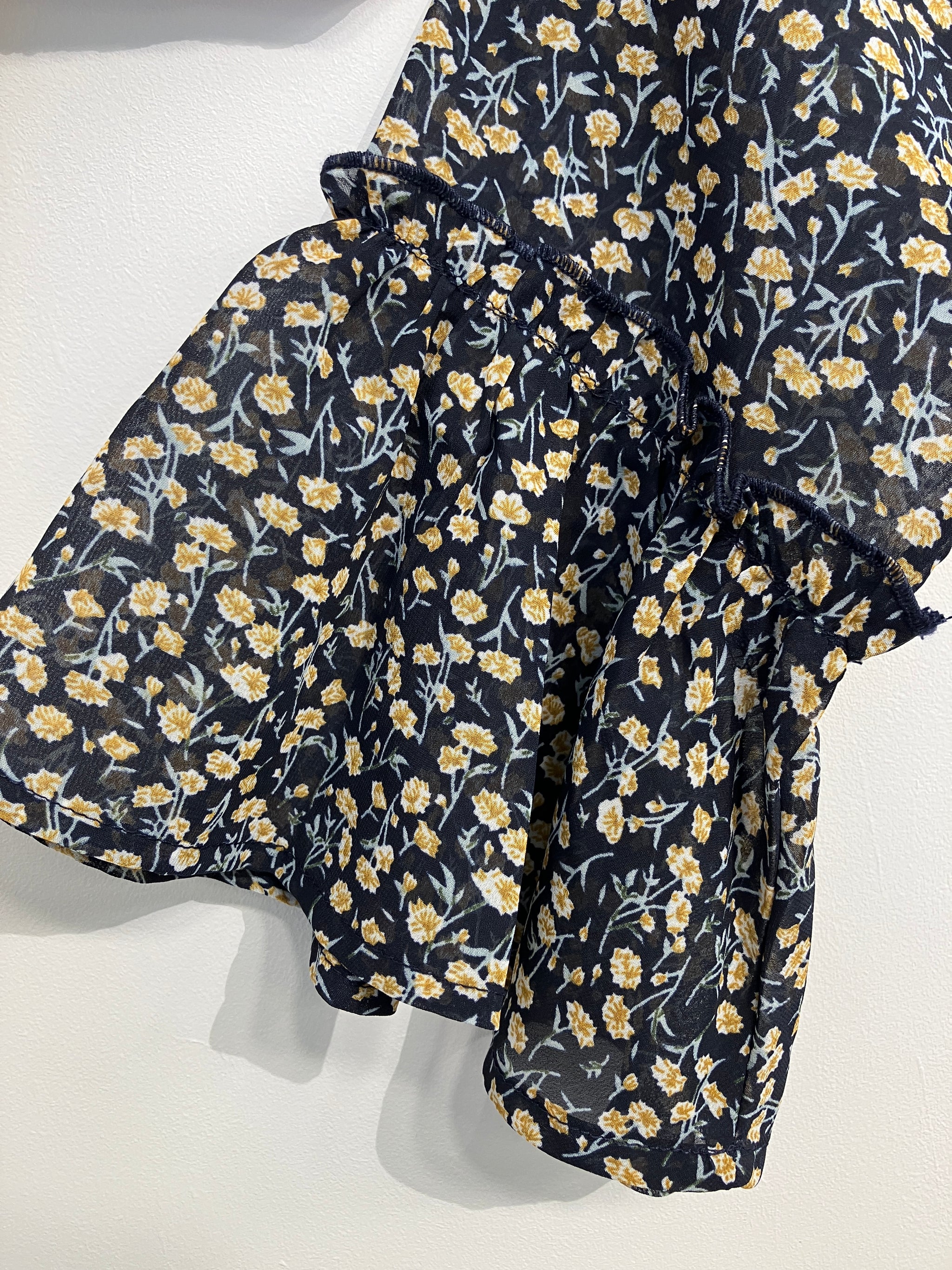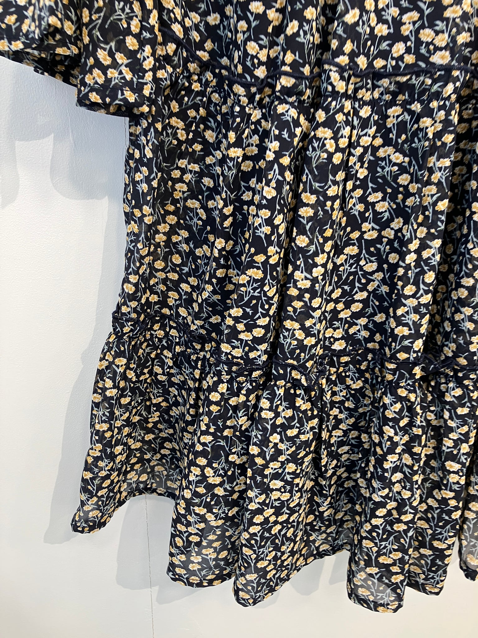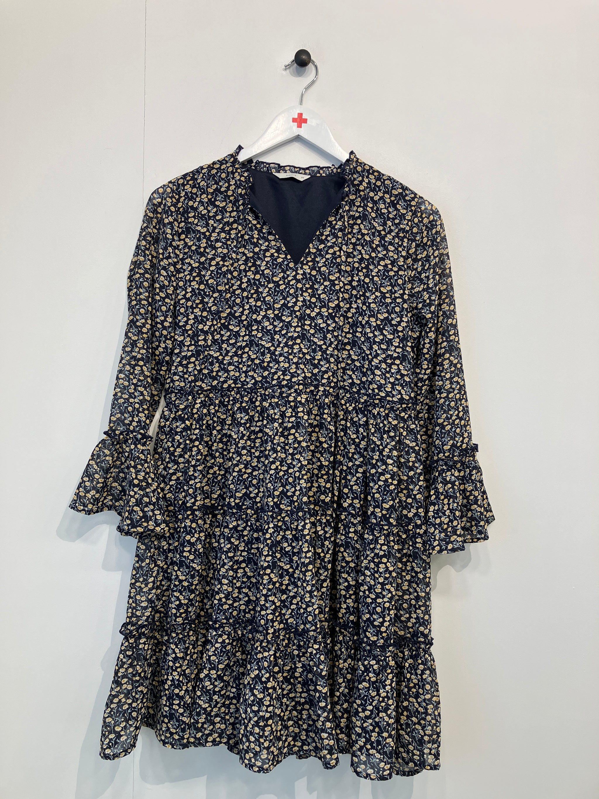Feminin, kort kjole med 3/4 ærmer. Kjolen er med v-hals med bindebånd, flæsekant på ærmer og etagesyninger.