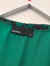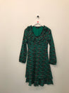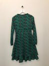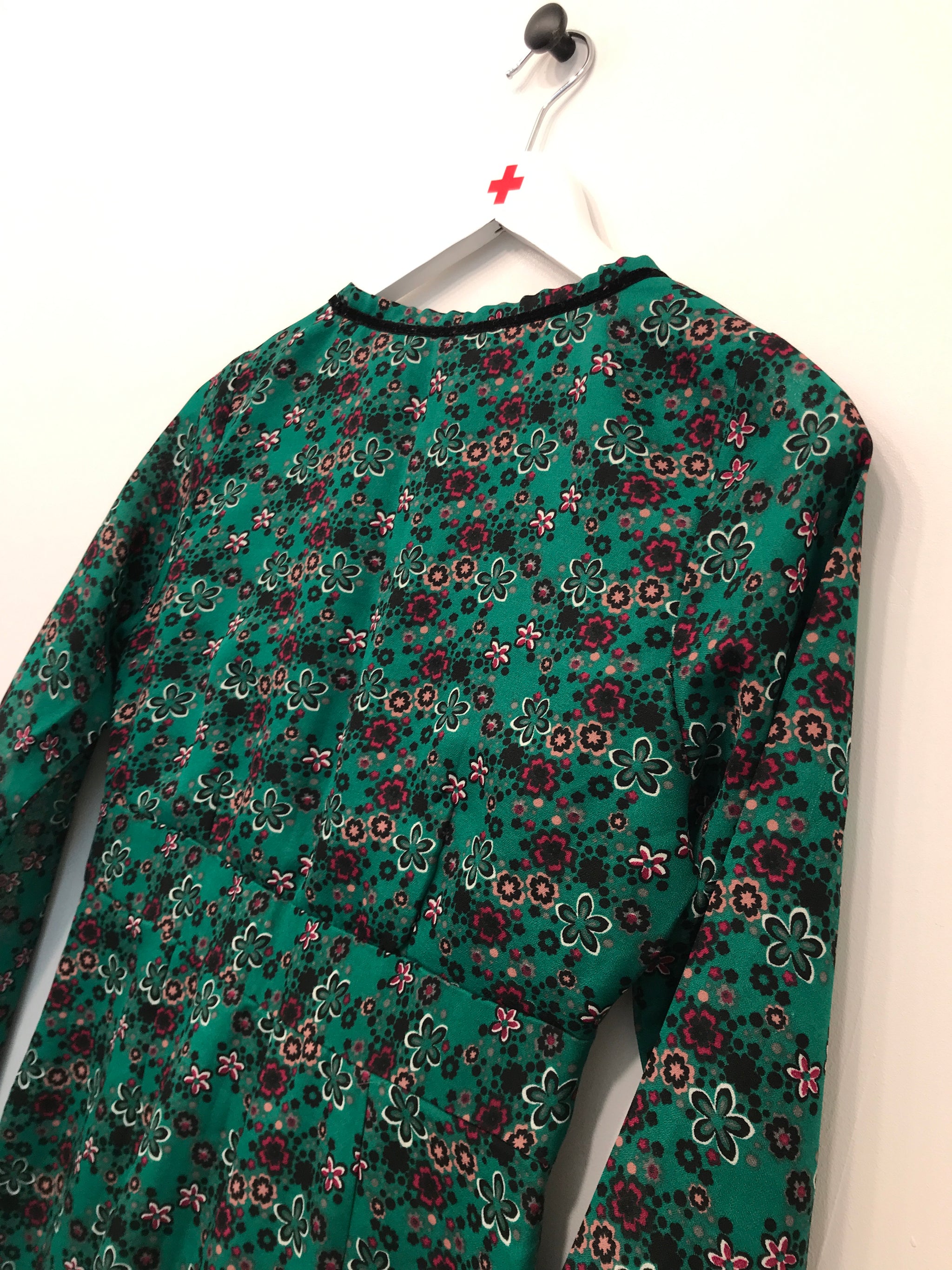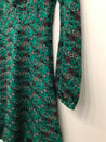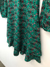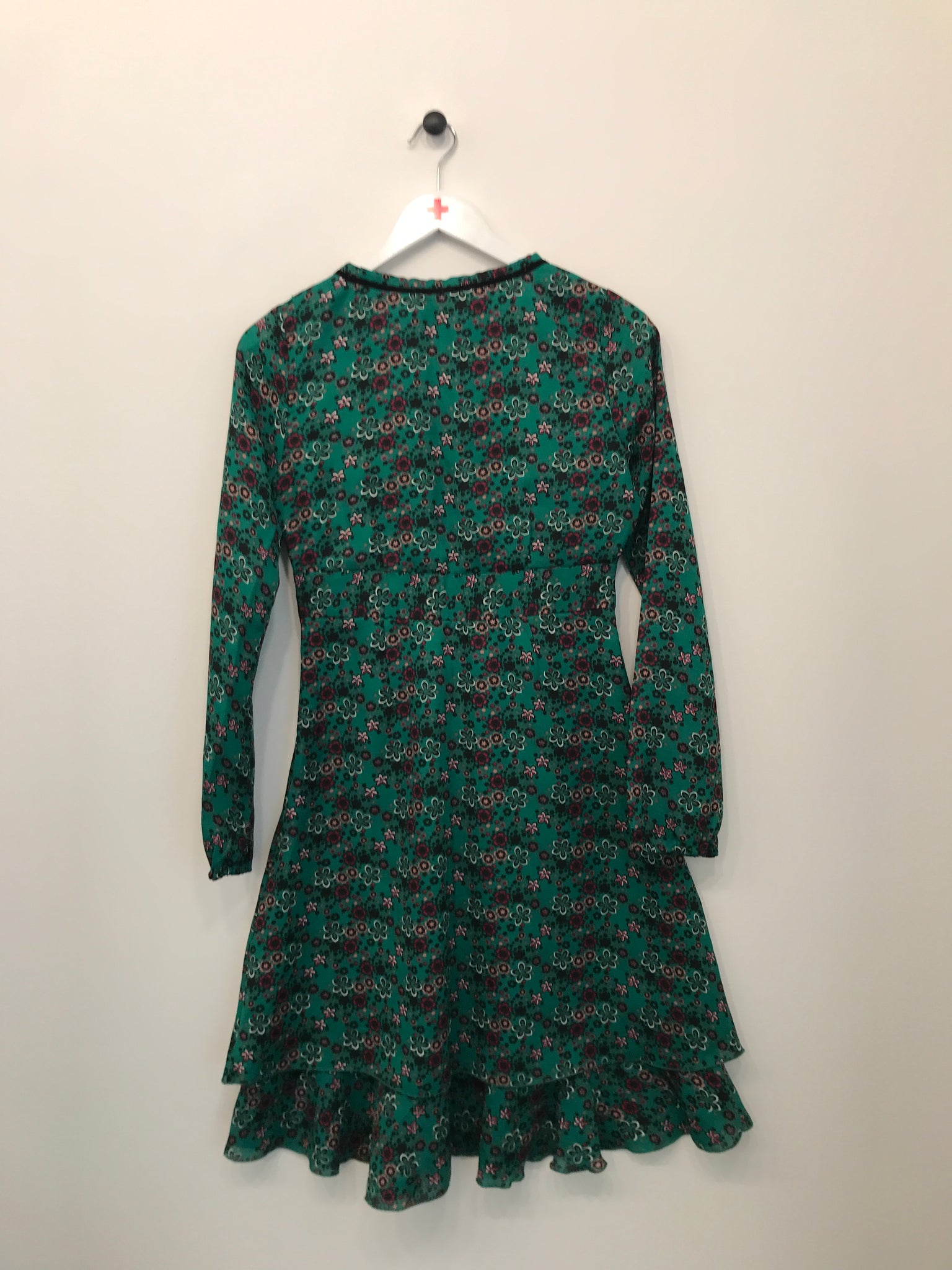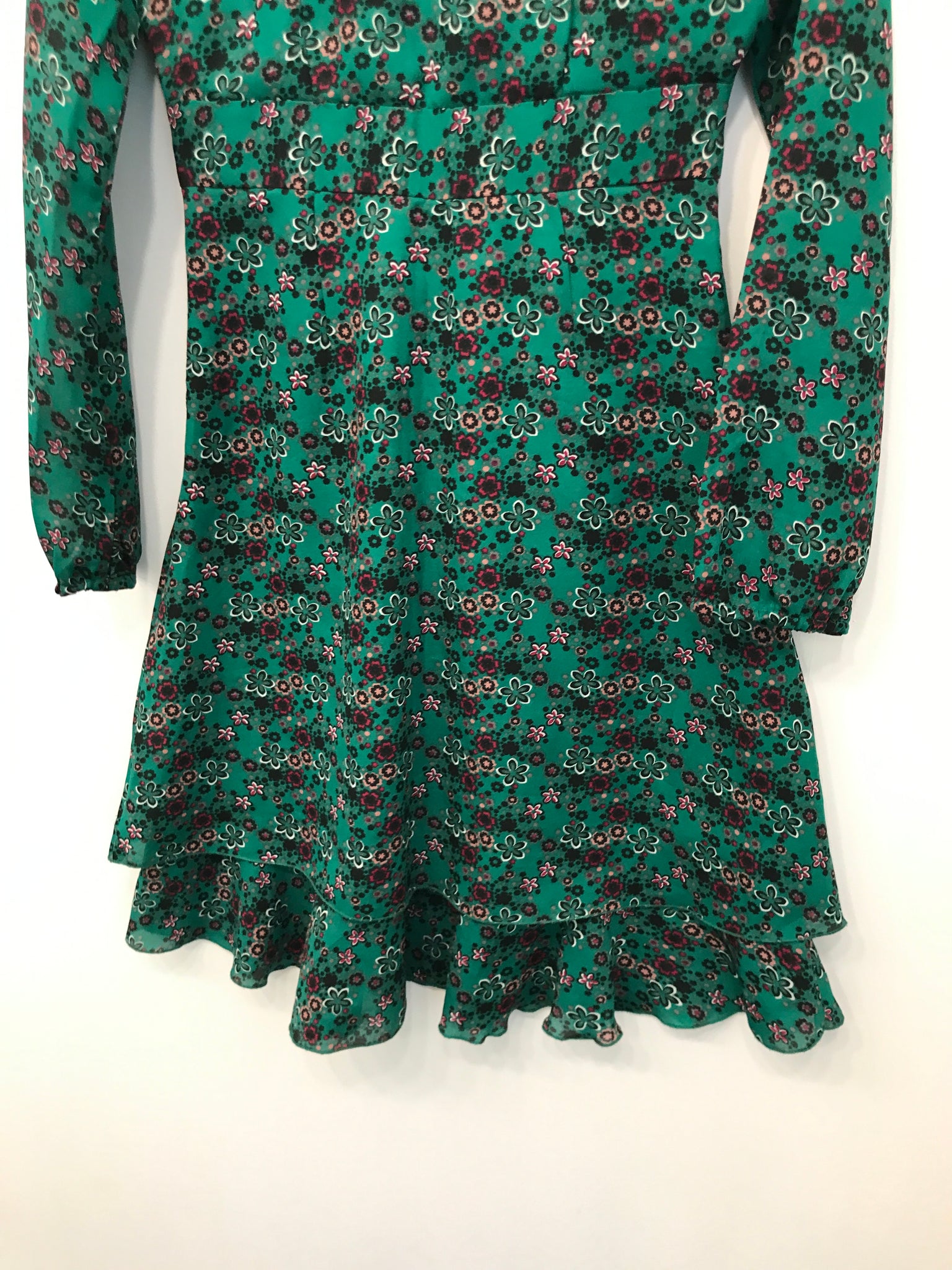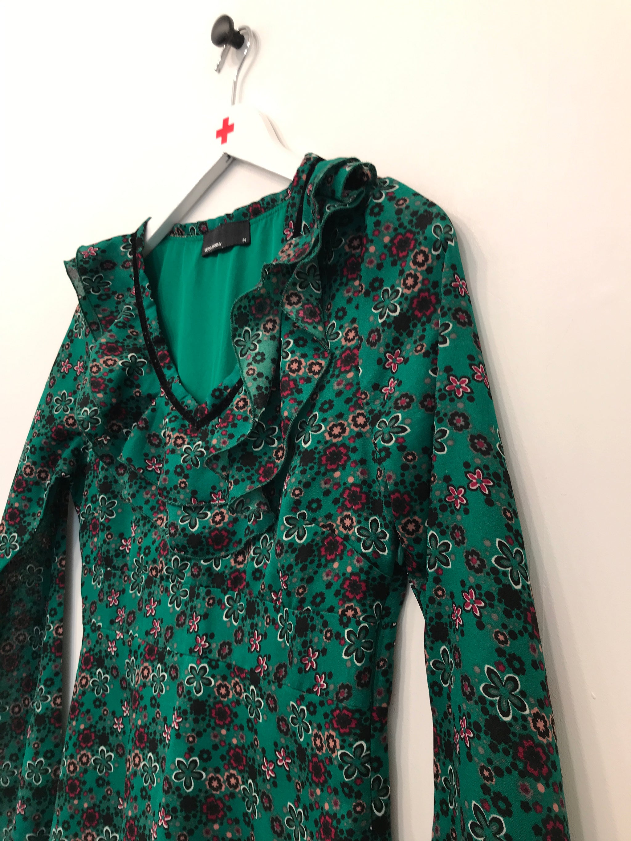Sukke kjole med lange ærmer og et elegant V-halsdesign, let bølgende flæser, som giver den et feminint og luftigt præg.