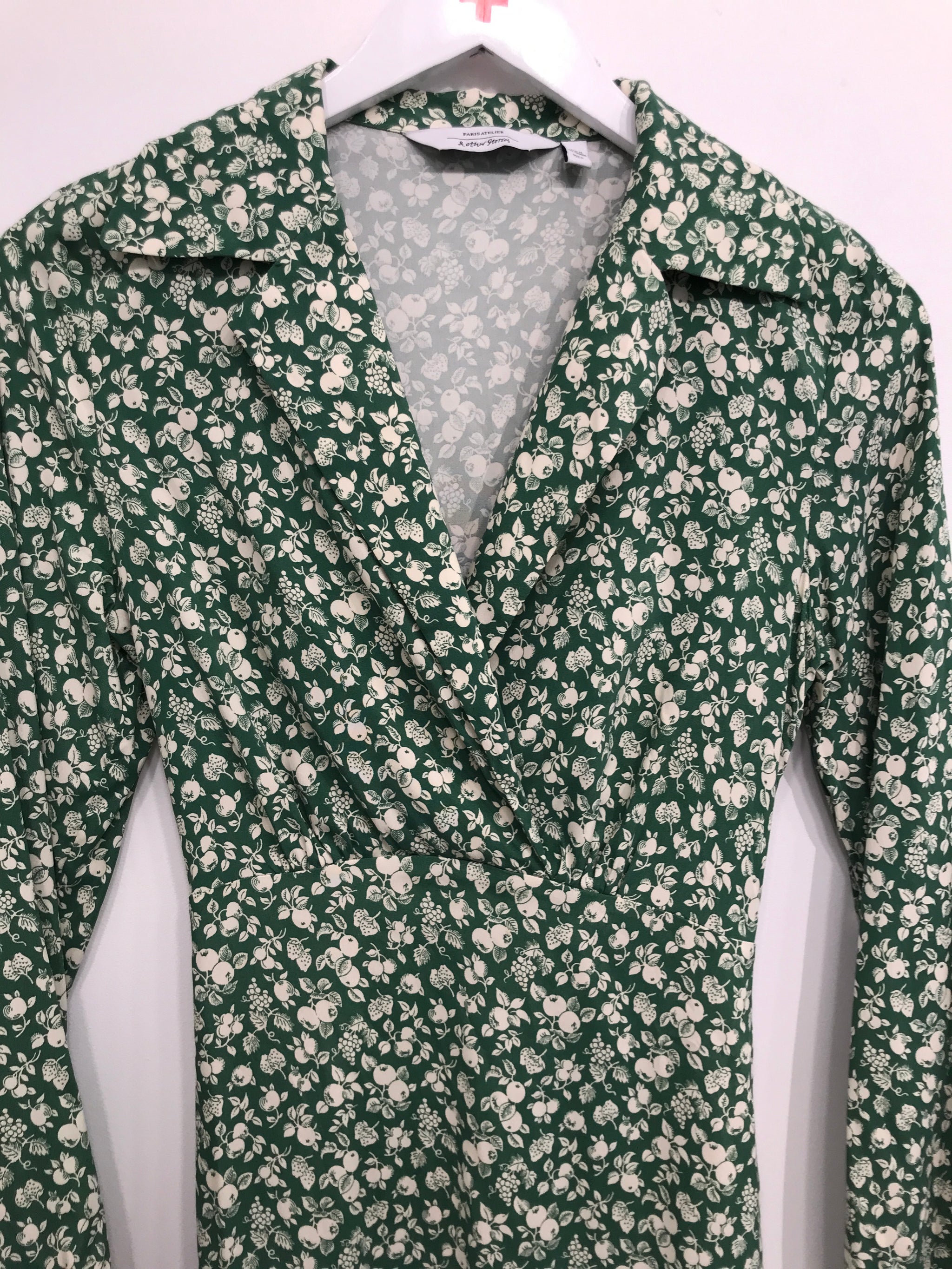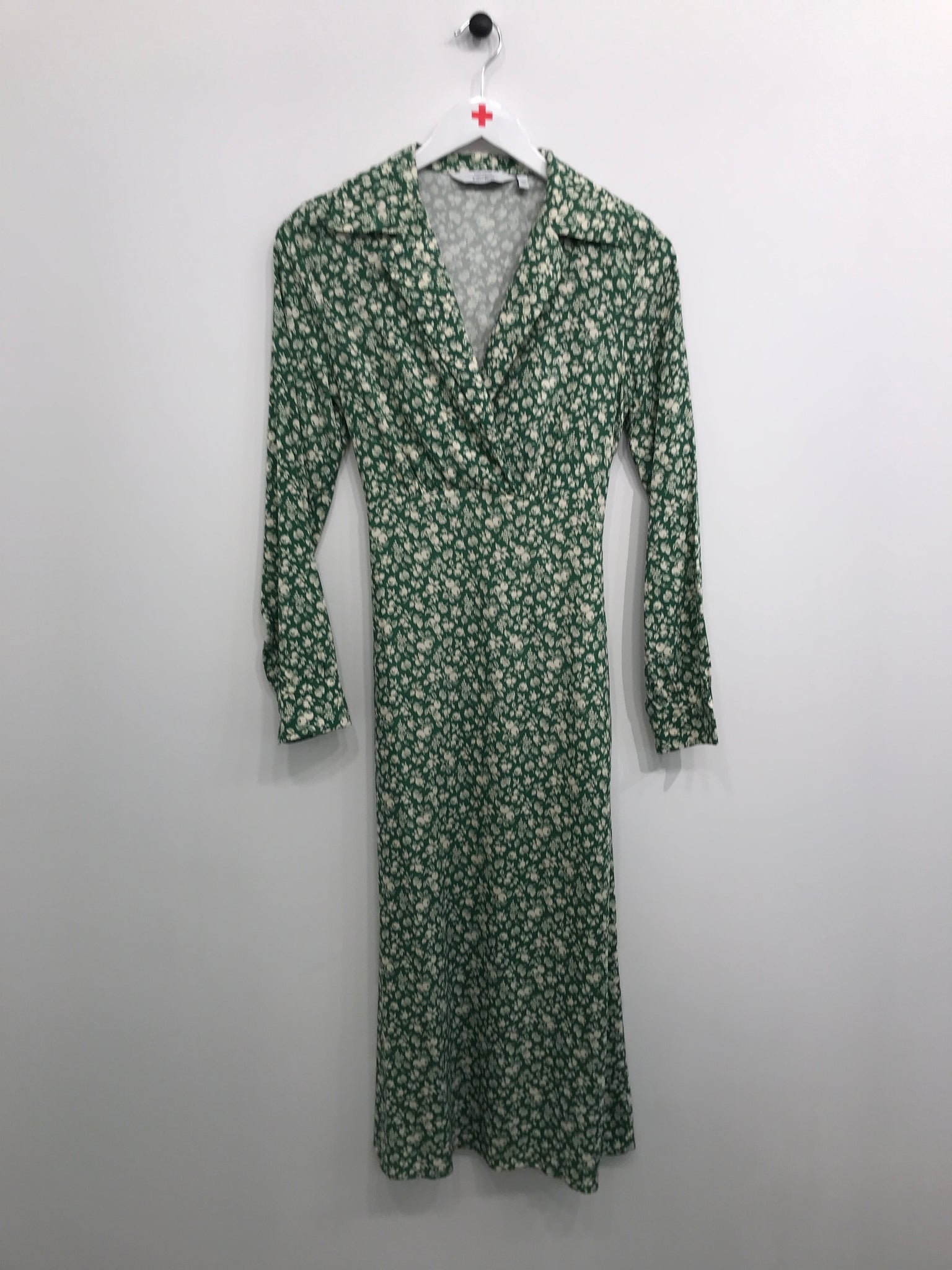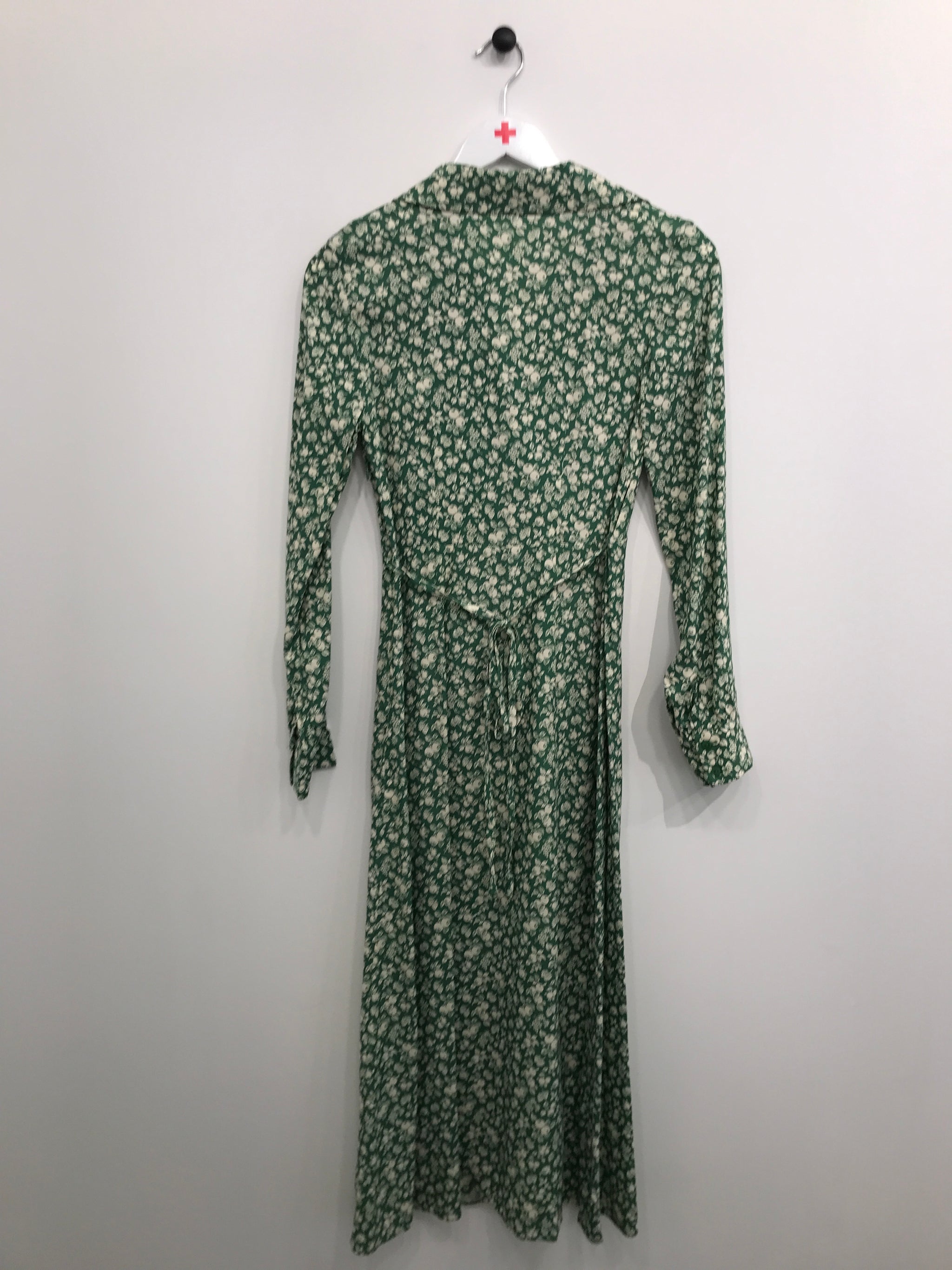 Lang kjole med V udskæring, lange ærmer og bindebånd i talje.