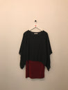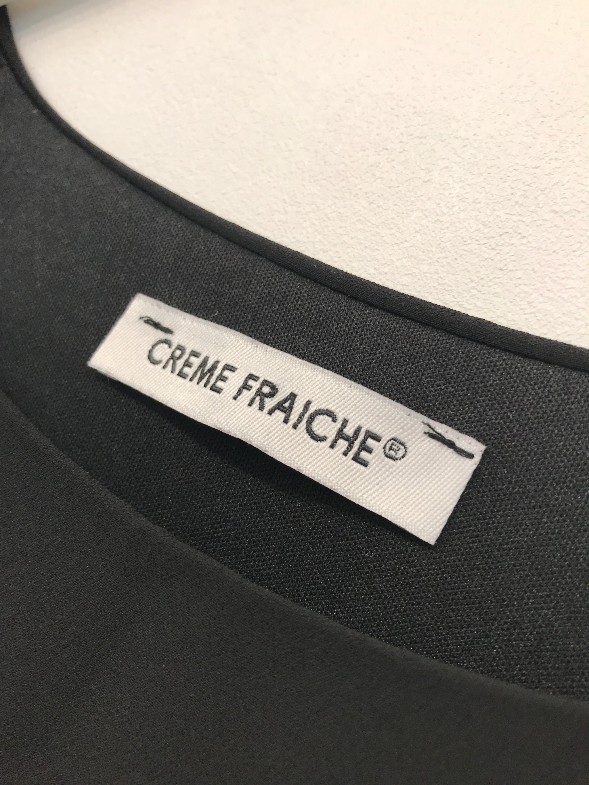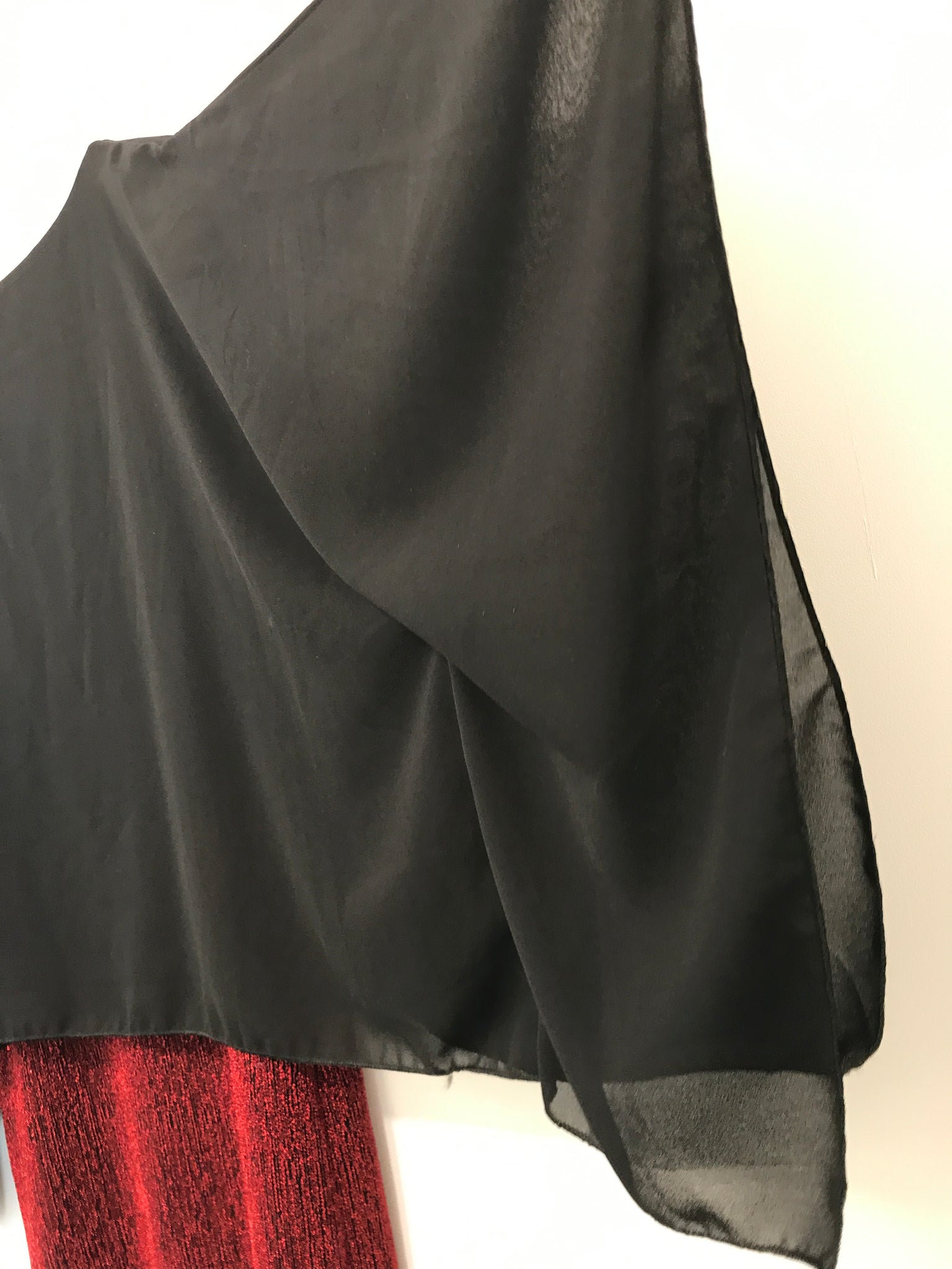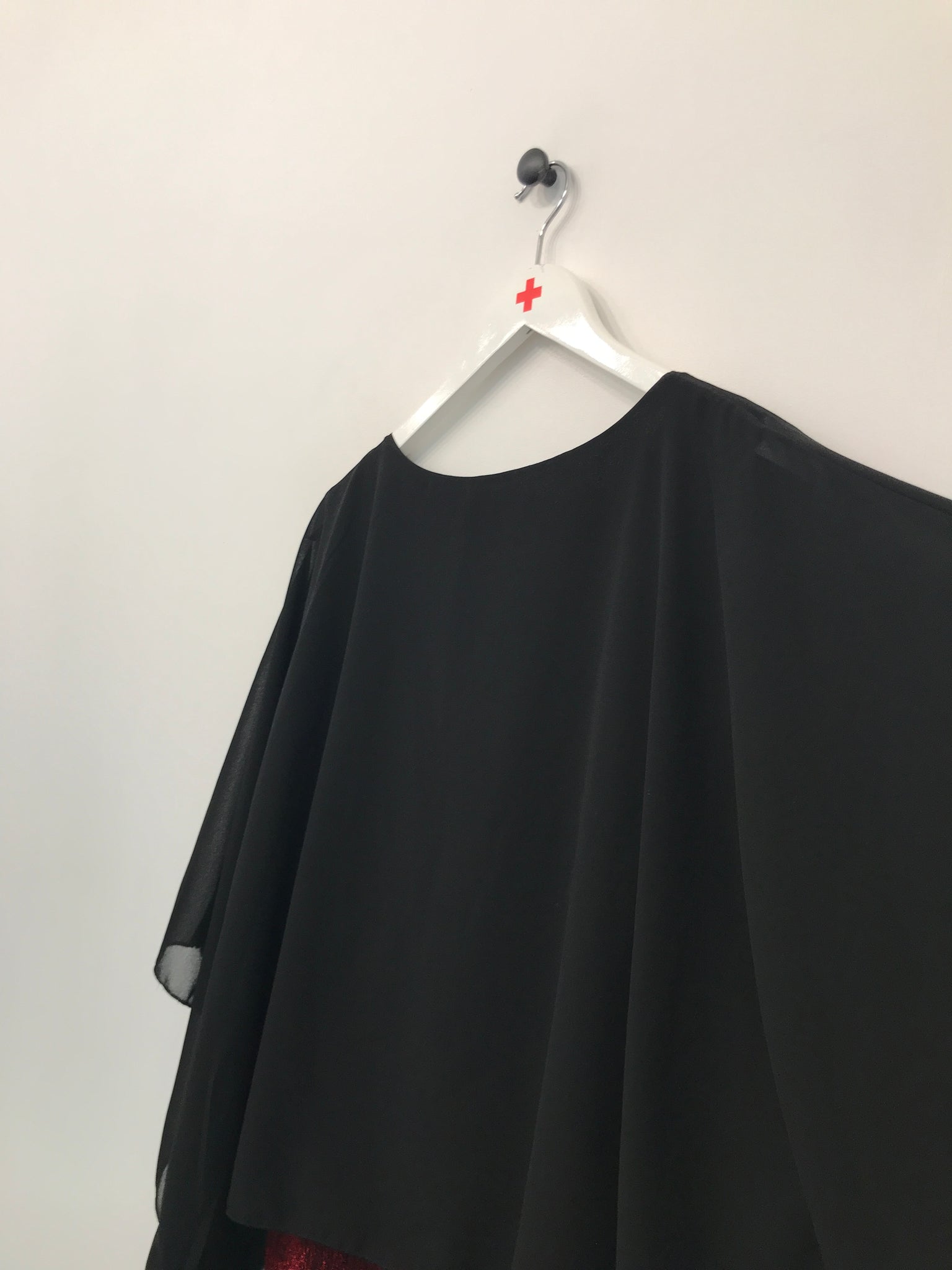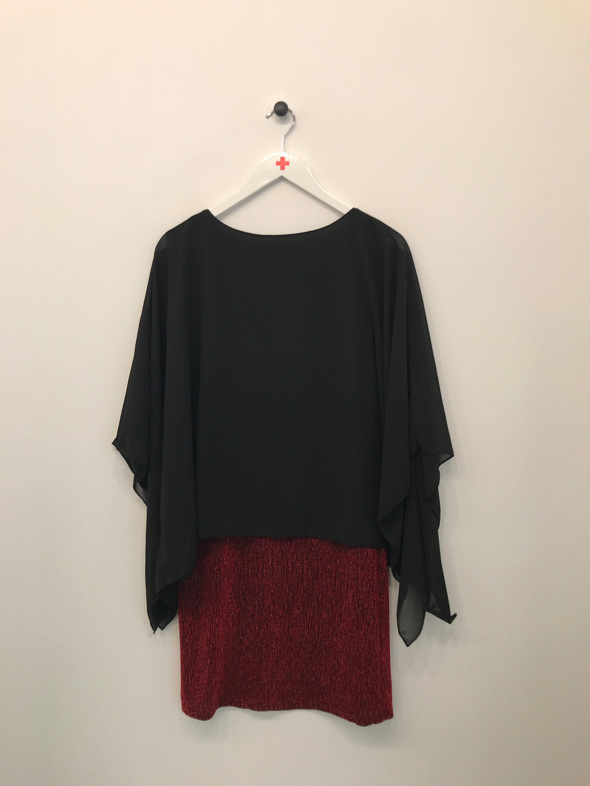 Kjole. Tynd stof med vidde øverst, rund hals. Tofarvet.