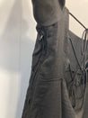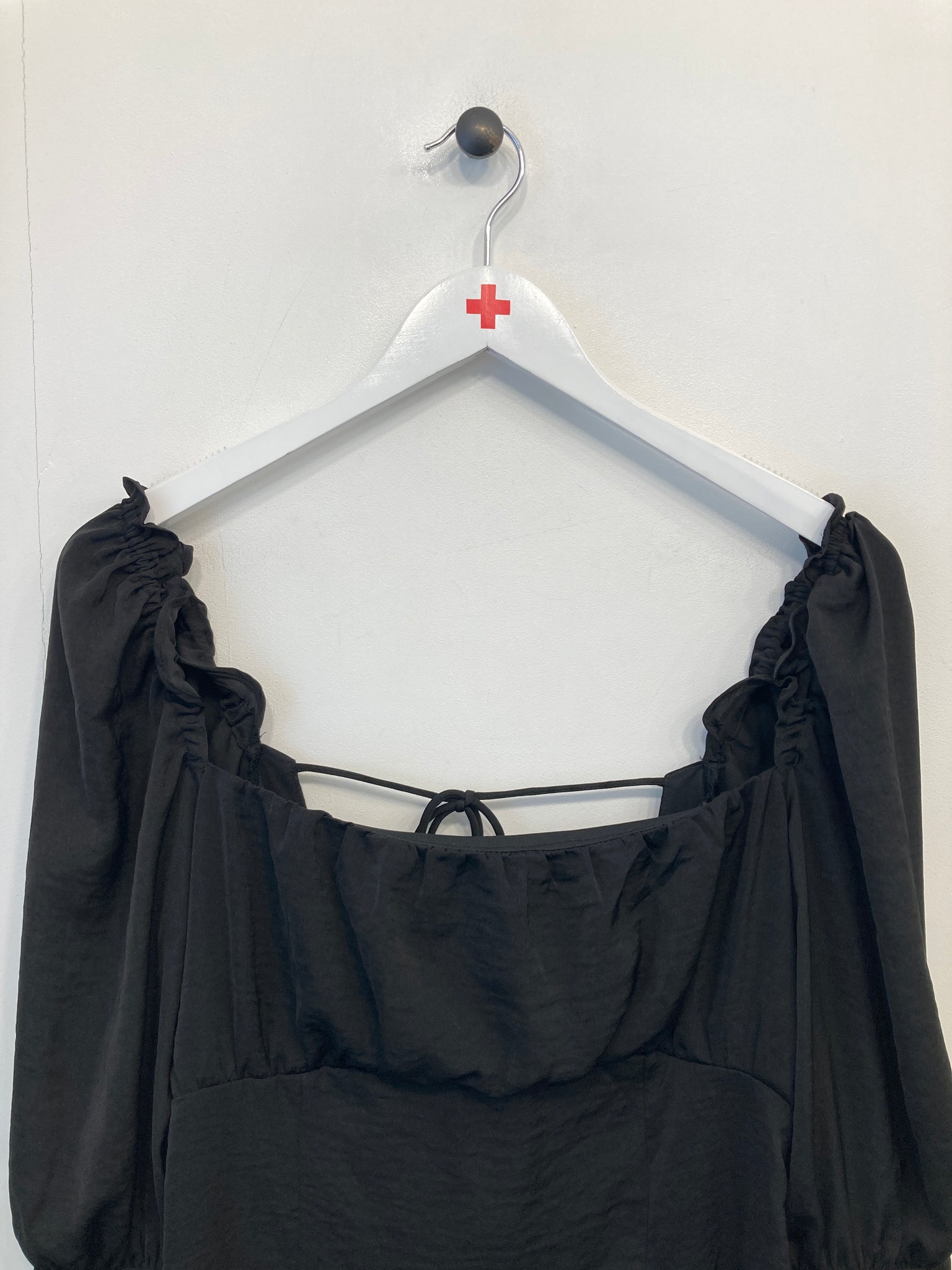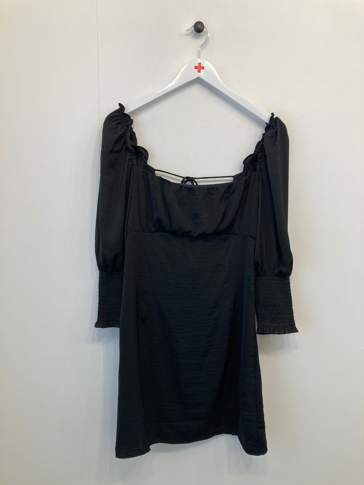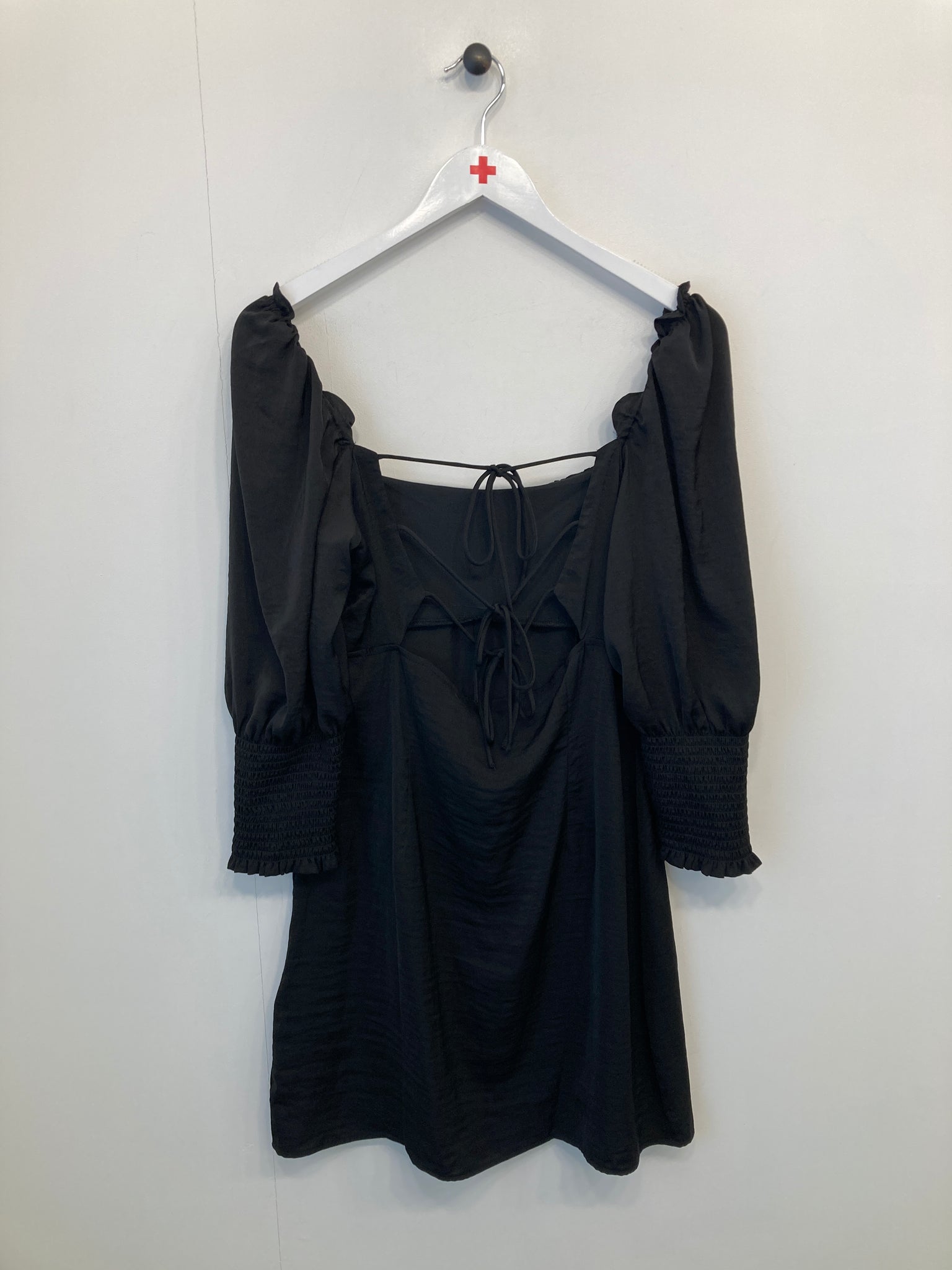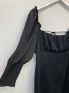 Kjole. Lange ærmer med elastik øverst samt bred elastikkant nederst. Lynlåslukning i side, åben ryg med bindebånd.
