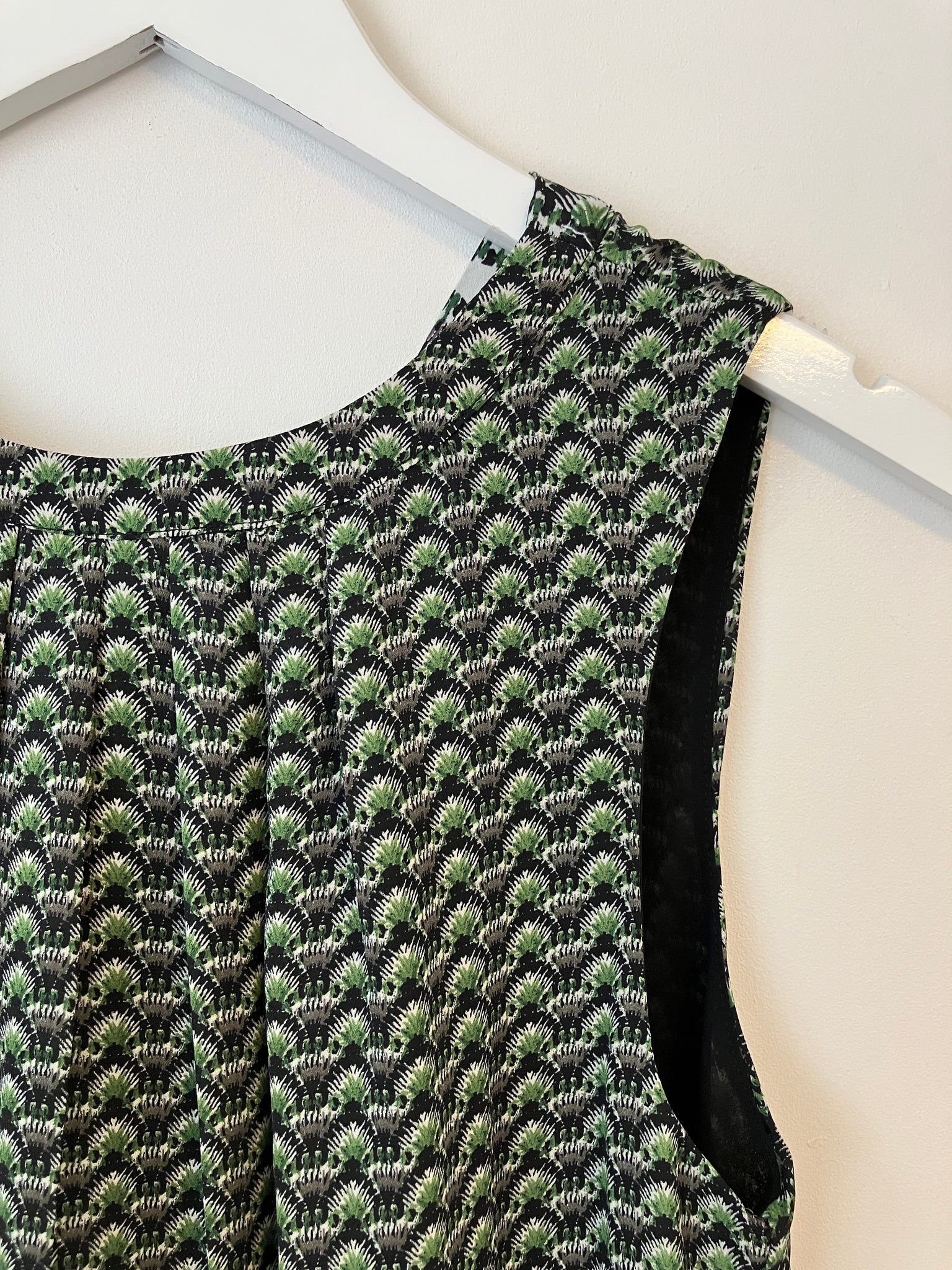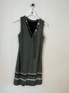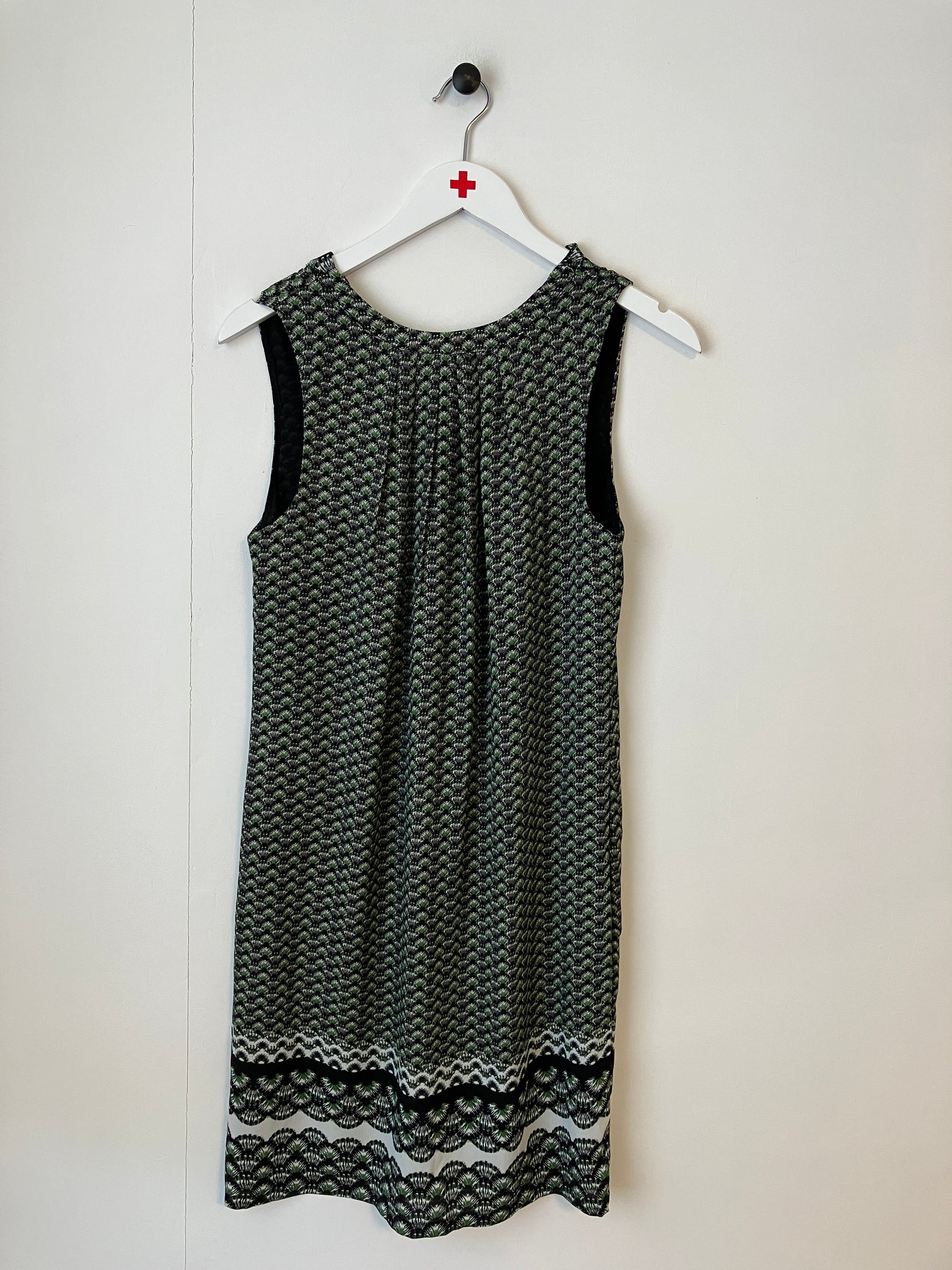 Lang og ærmesløs kjole med rund hals. V udskæring med bindebånd i ryg.