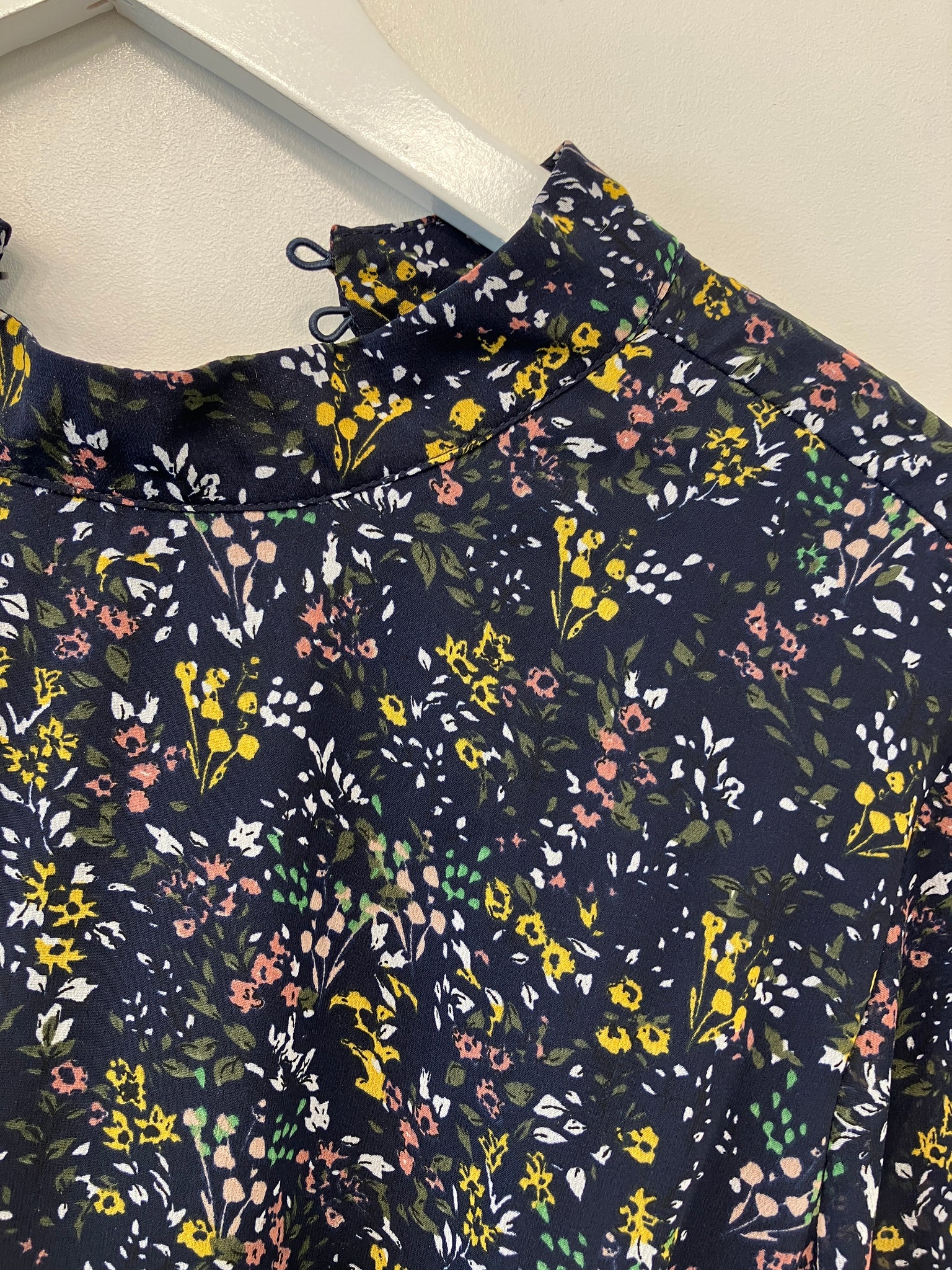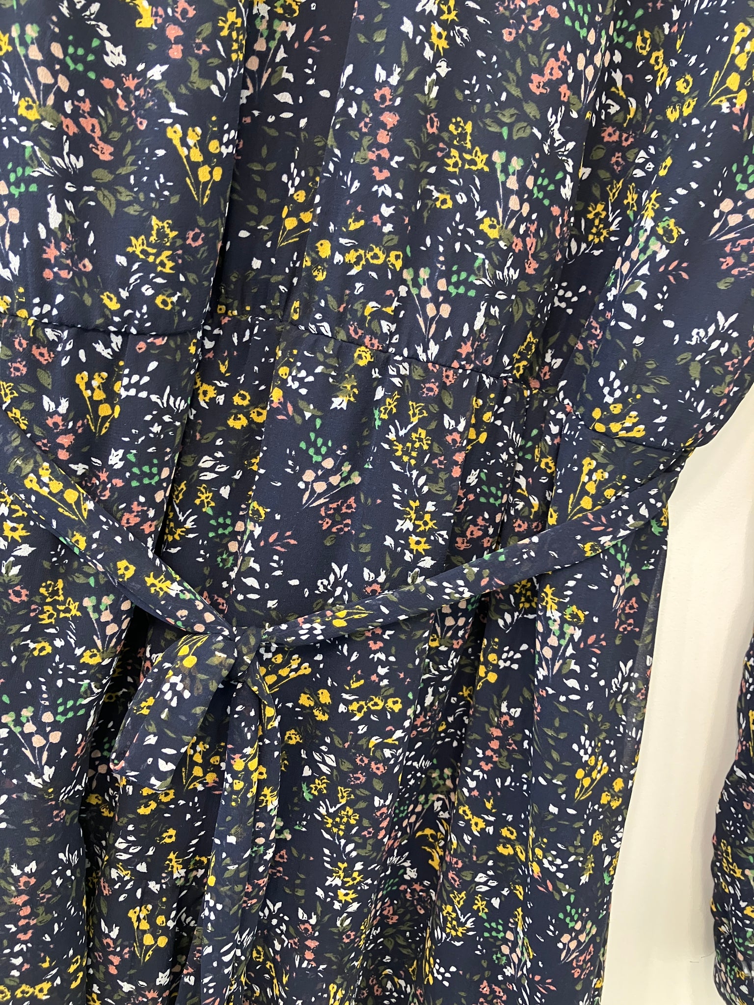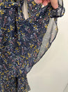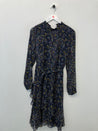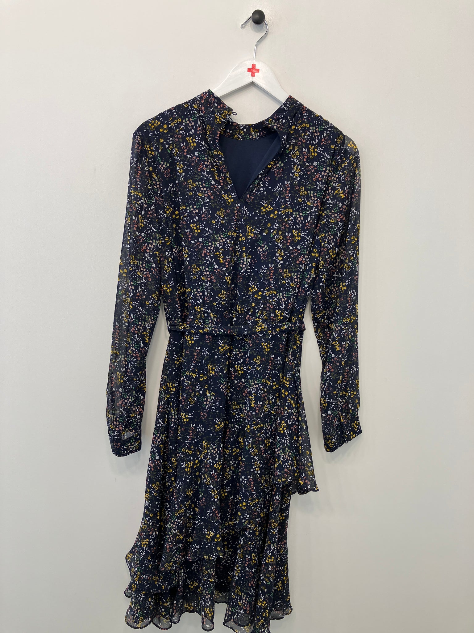 Kjole med flæse, rund hals, lange ærmer med knaplukning, Bindebælte i talje og knaplukning i ryg.