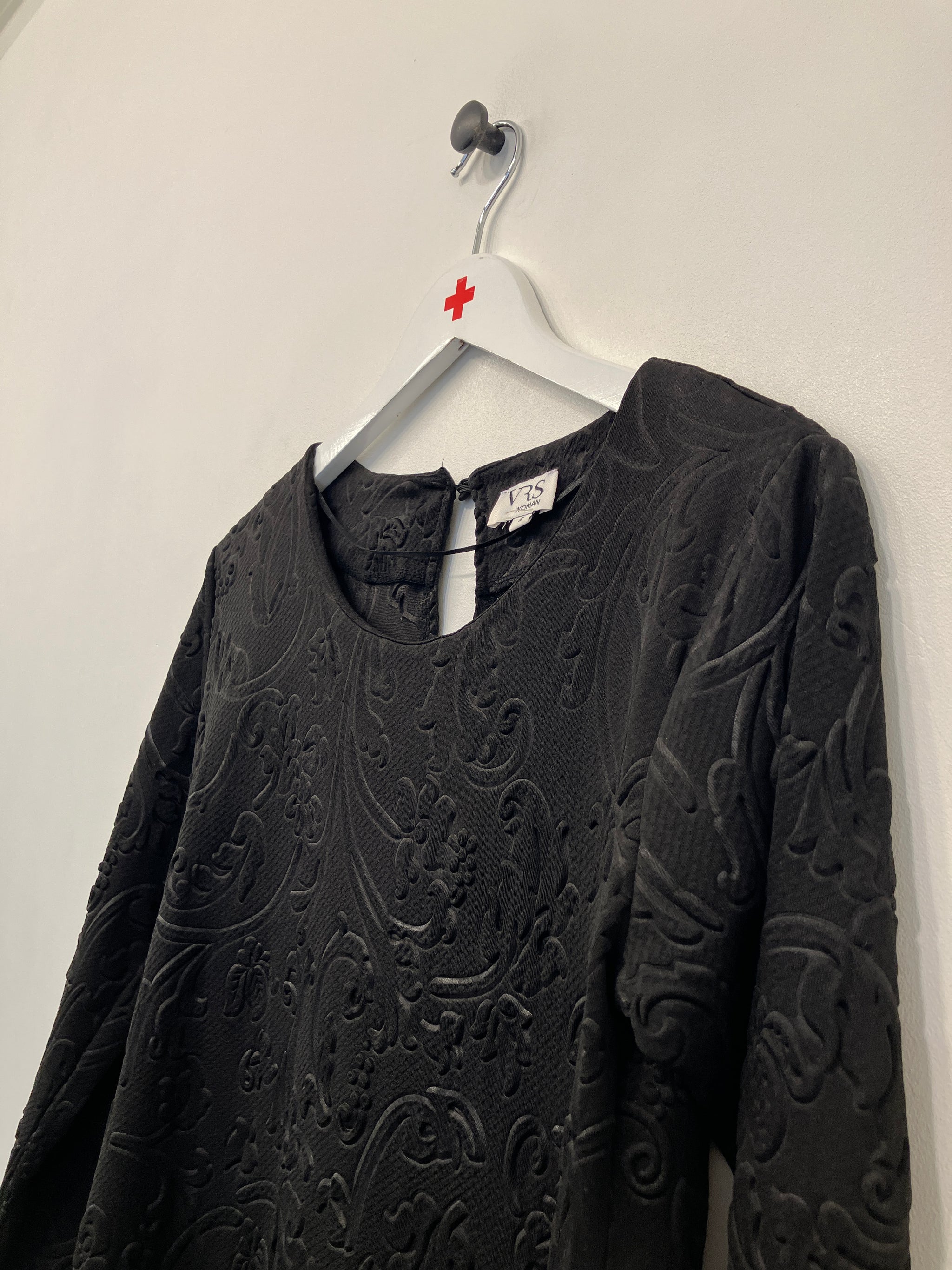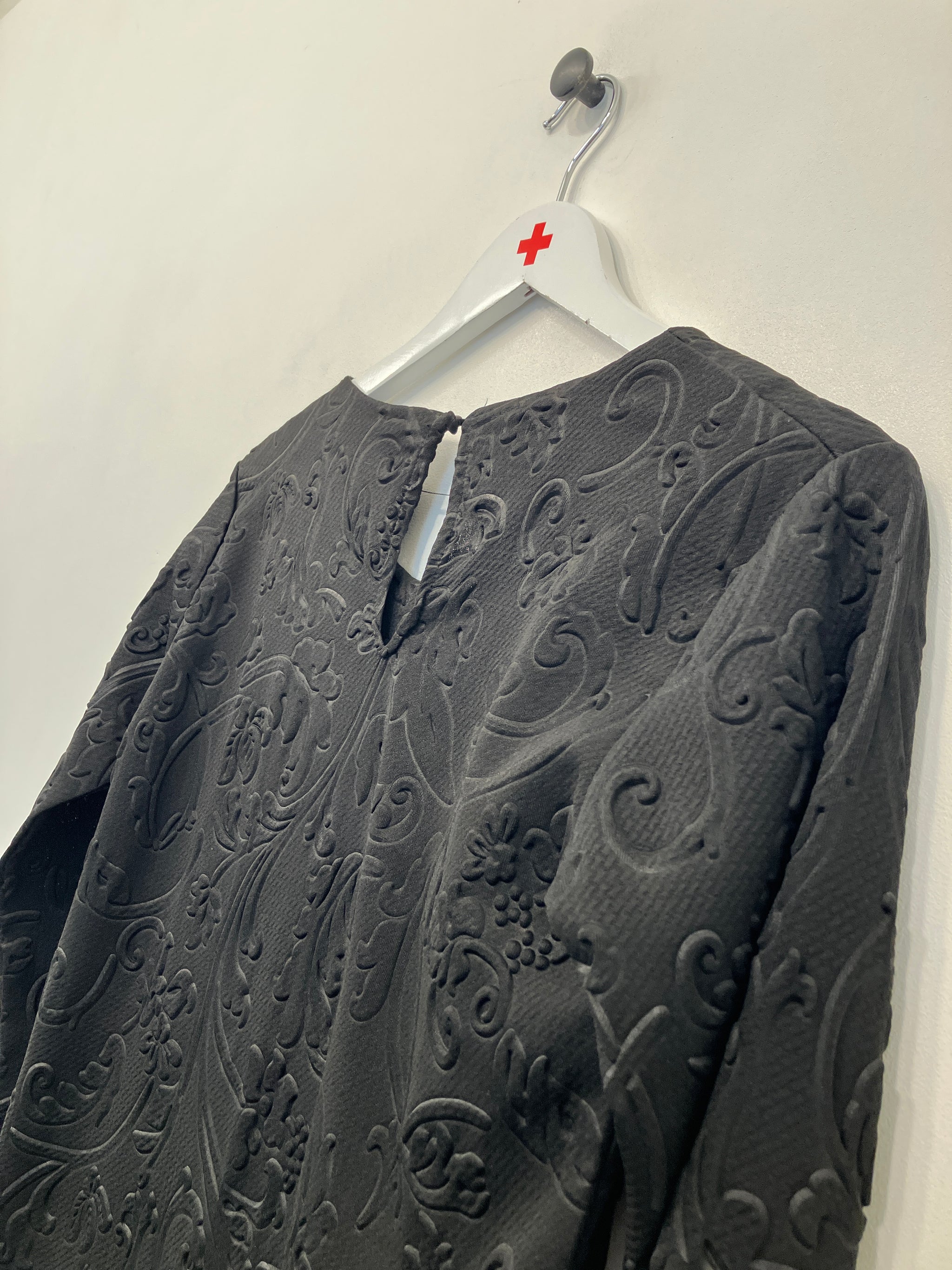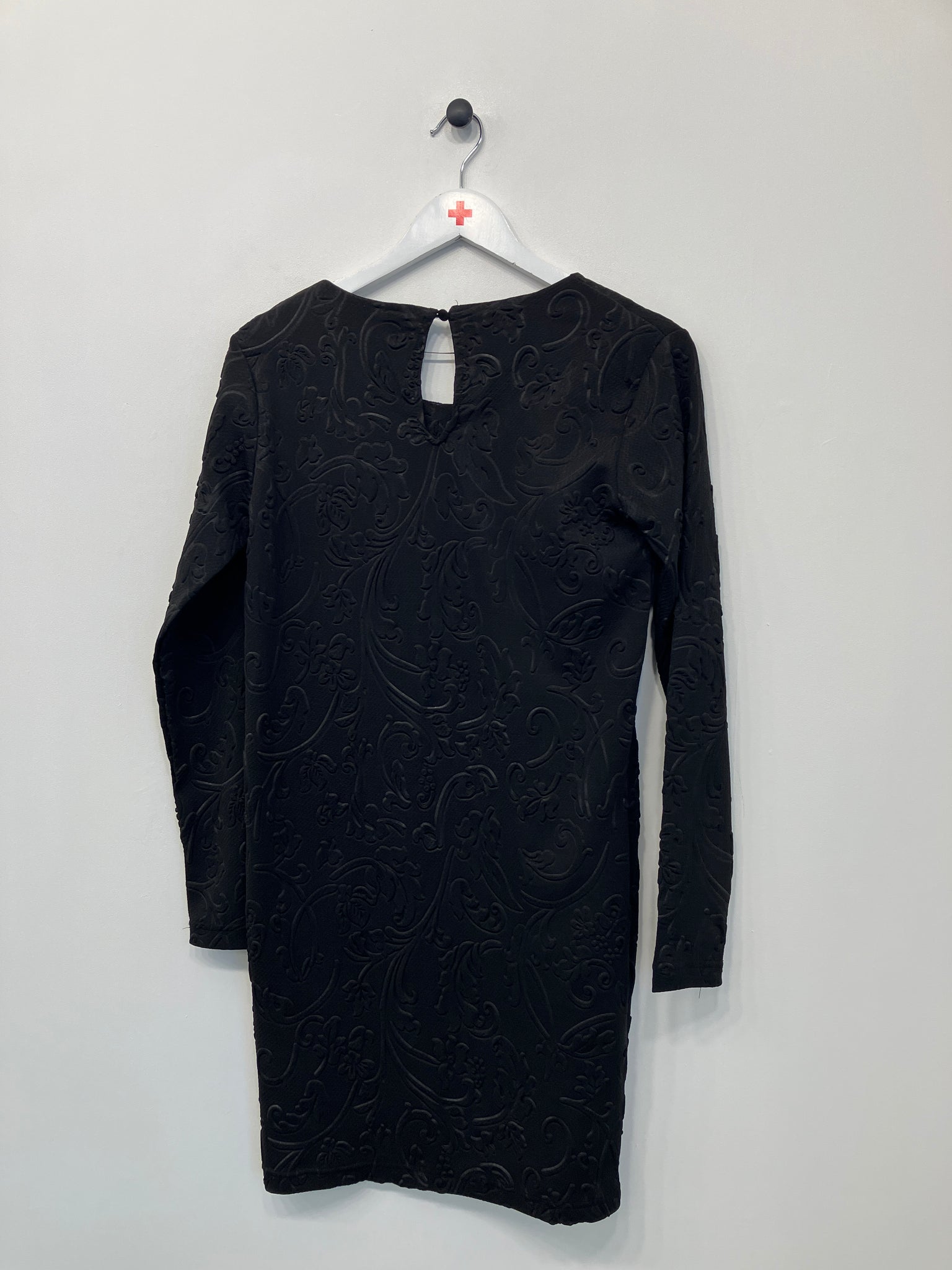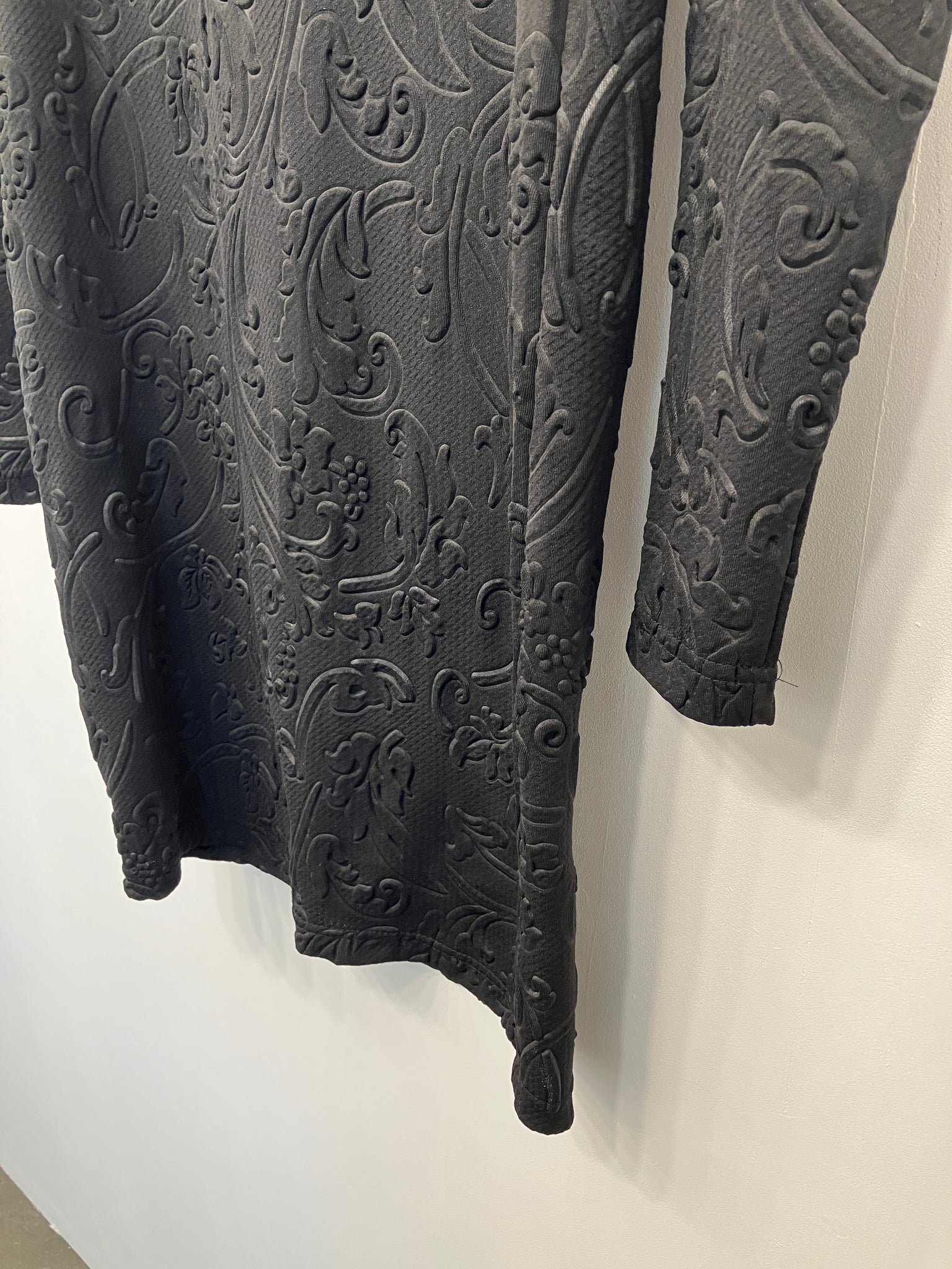 Kjole med lange ærmer, rund hals og knaplukning i ryg.