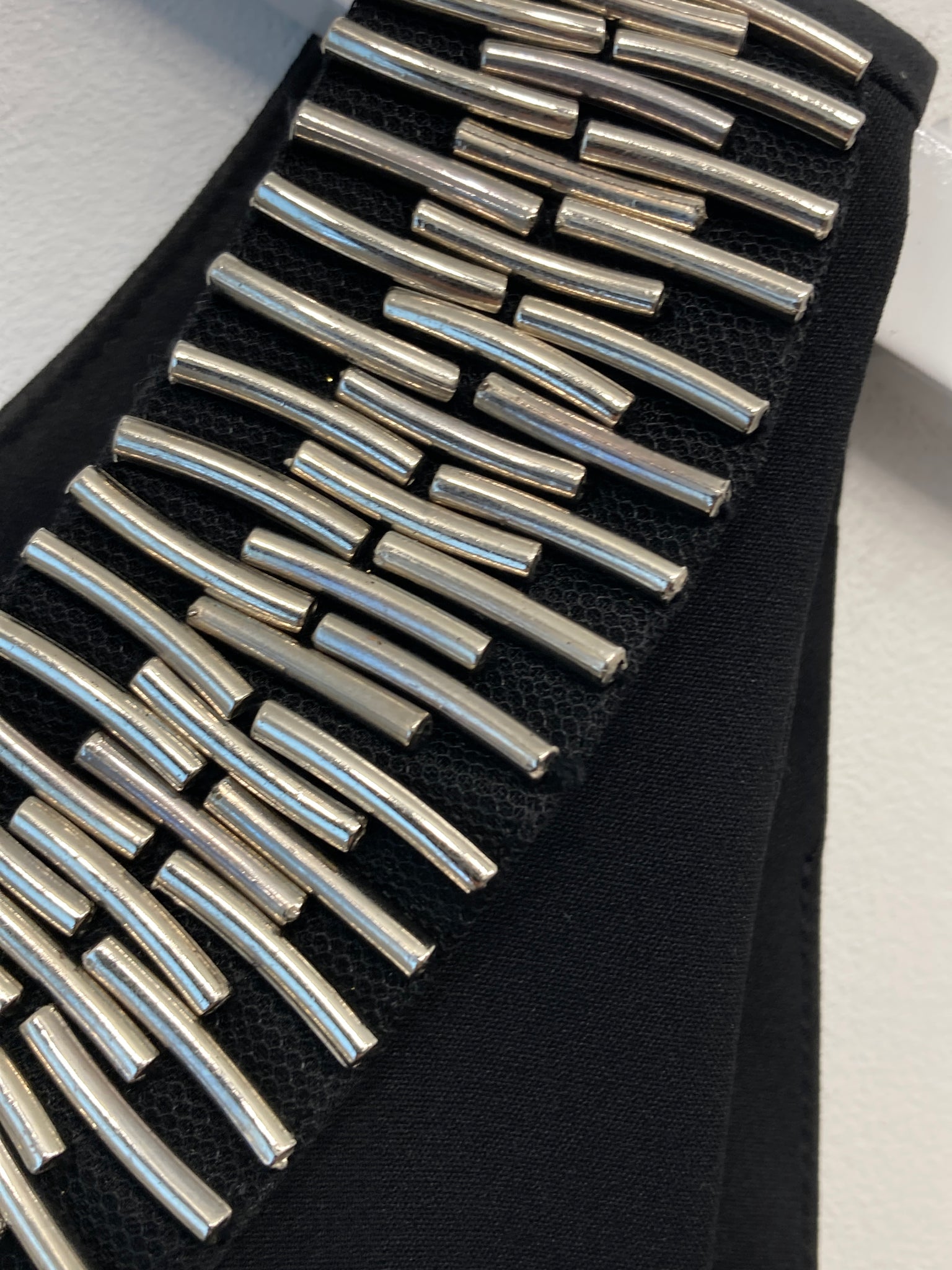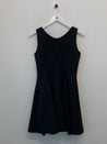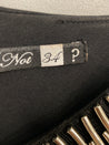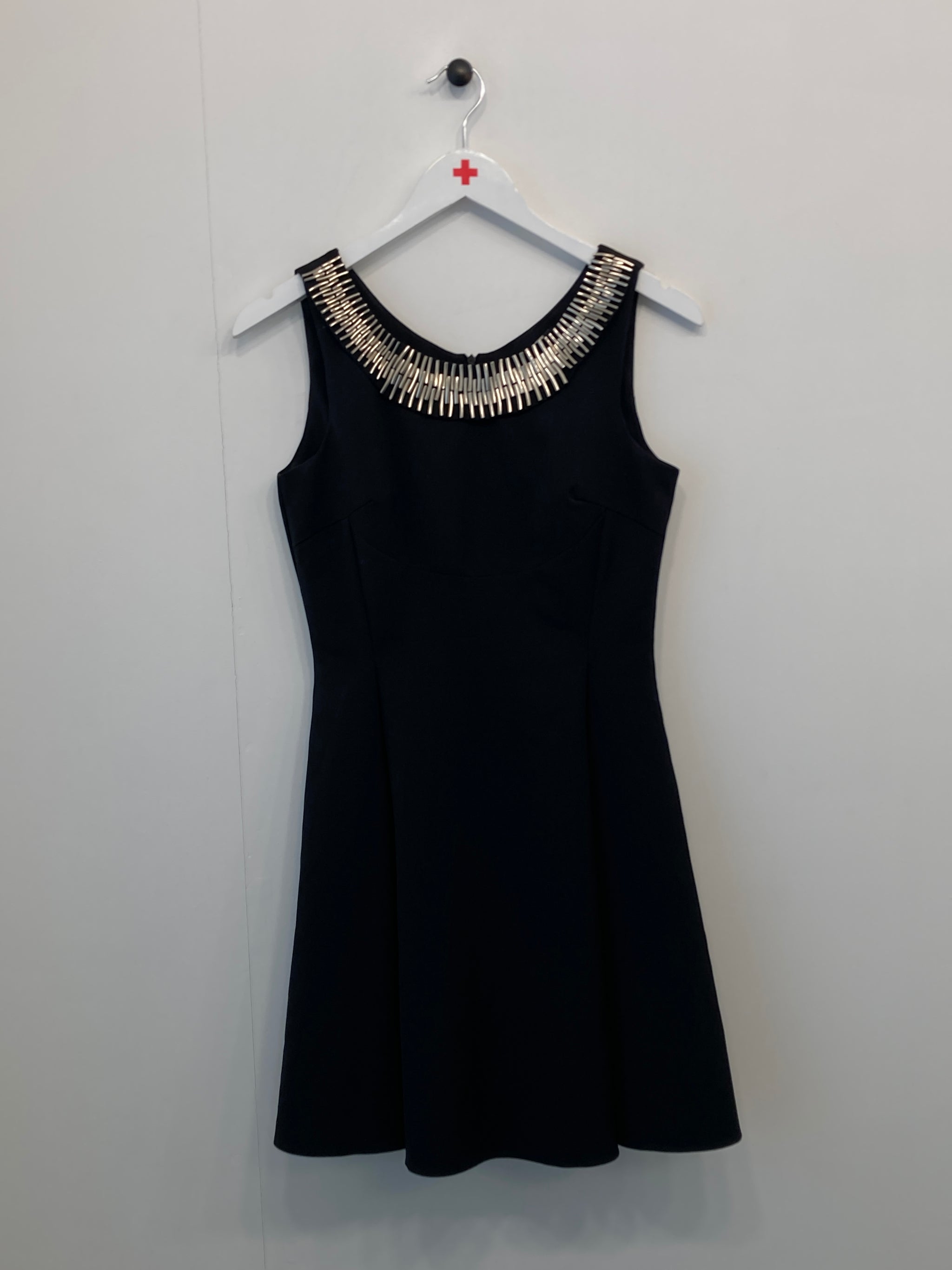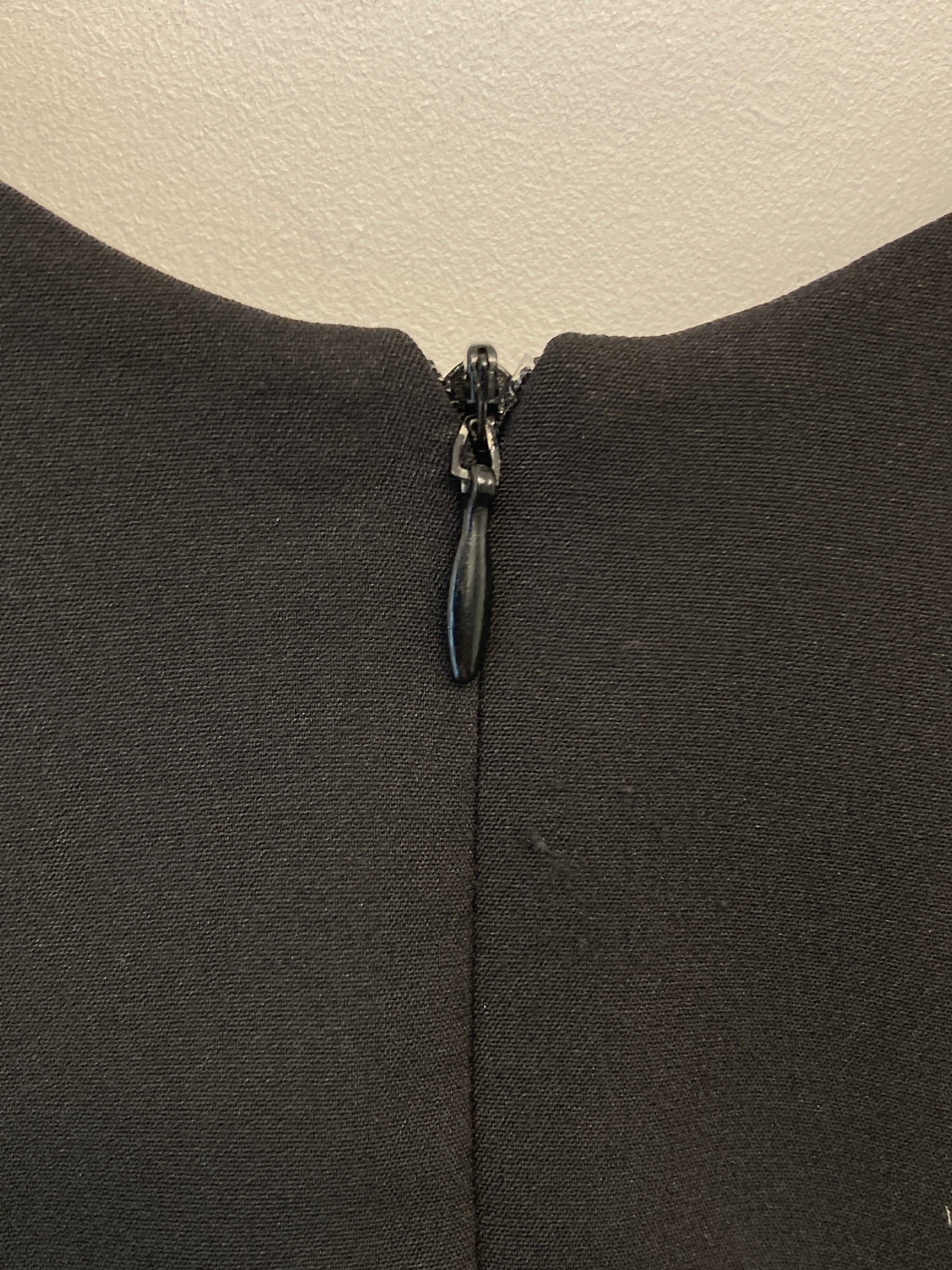 Kjole med foer, læg og vidde. Ærmeløs, rund hals med "sølv-pynt", lynlåslukning i ryg.