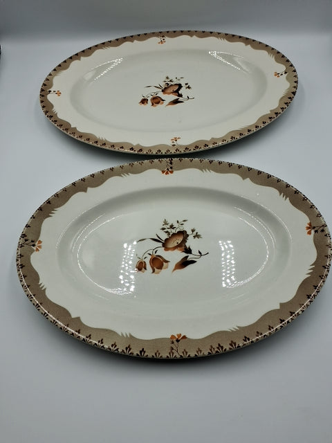 Der er to ovaler fade med en kant, dekoreret med blomster. De er lavet af keramik. Fra Fajancefabrik i København Et stort fad. L:38 Et lille fad. L:32