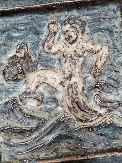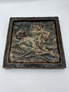 Værket er en relief af en menneskelig figur og et dyr i bevægelse. Det har en rustik overflade med flere farver og en dyb tekstur. Med brun, blå og grønlige nuancer.