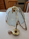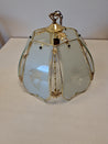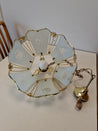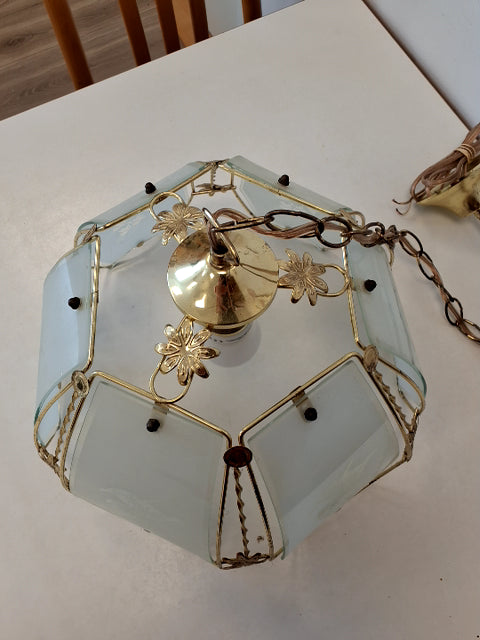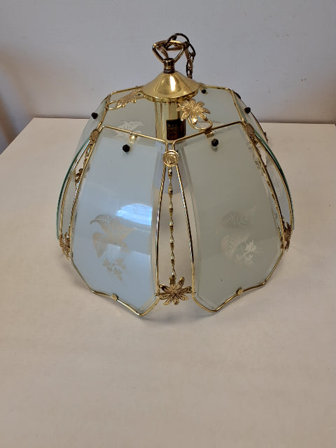 Lampeskærmen har et elegant design med glas og metalramme. Den er dekoreret med blomster.