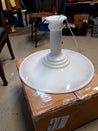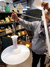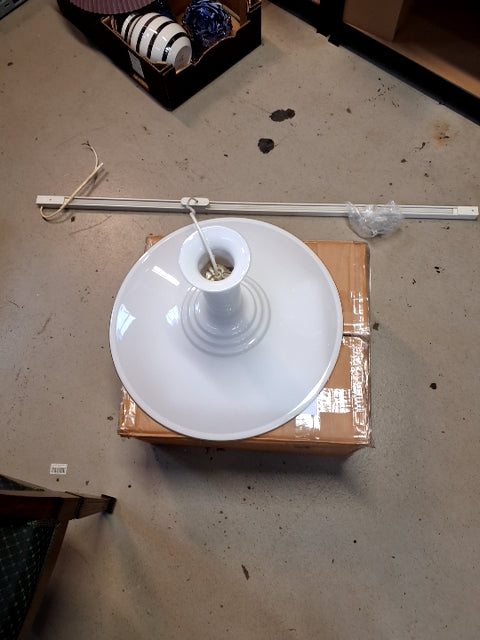 Af Holmegaard. Lavet i hvid opaline model 450. Skinne medfølger. Lampeskærmen er rund og lavet af glas. Den er hvid og har en glansfuld overflade. Diameter 49 cm