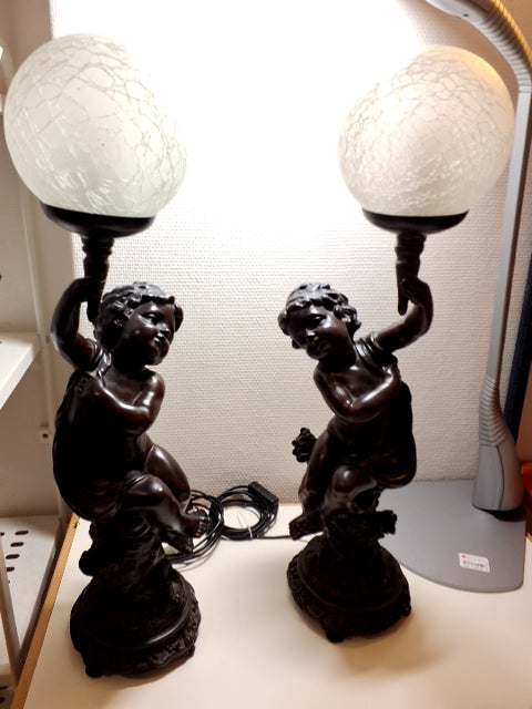 2 stk lamper som skulpturer. Lamperne forestiller engle der rækker op mod himlen. Lamperne er monteret med 2 kupler i matteret glas. Materiale: Komposit