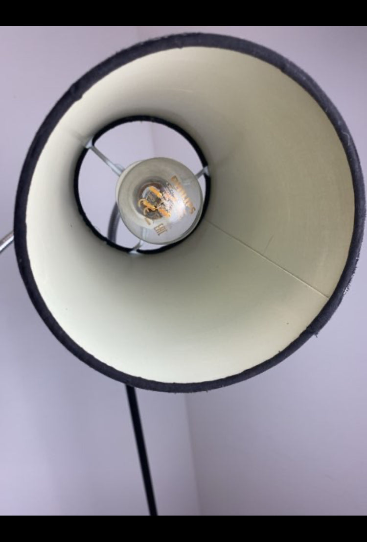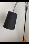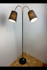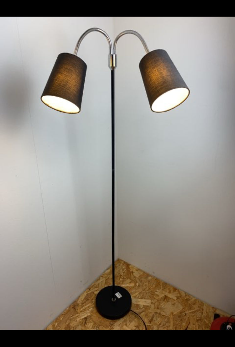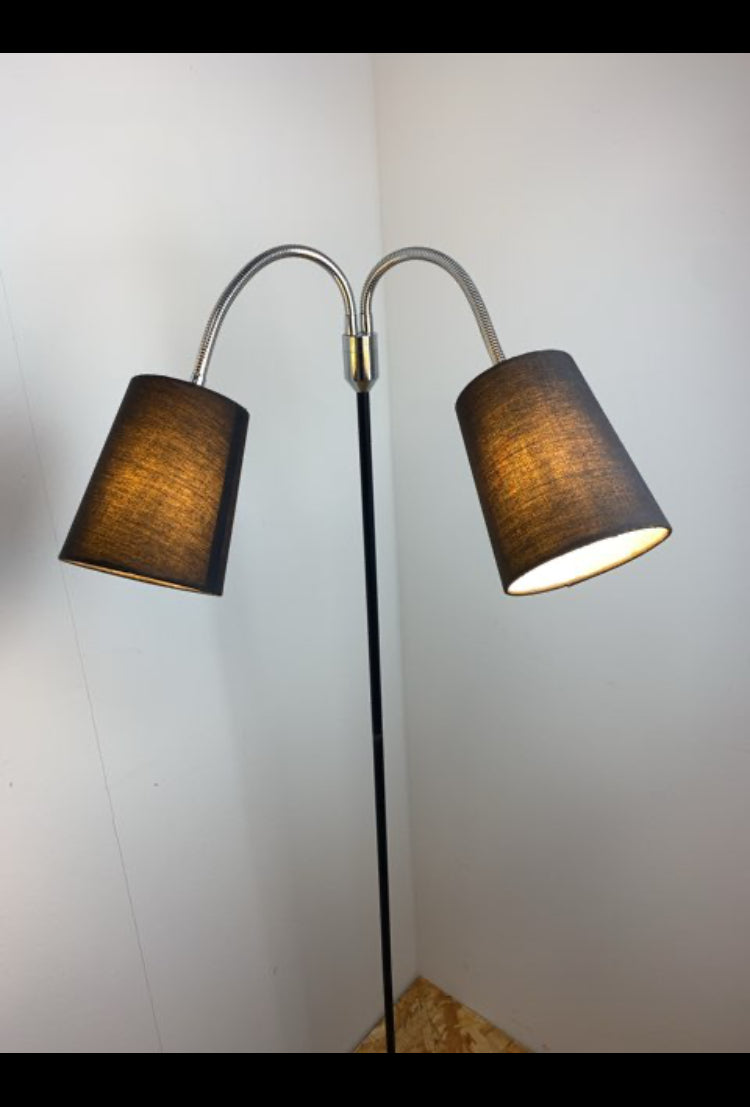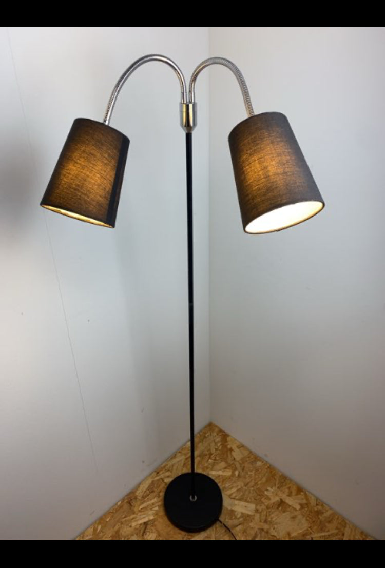 Flot sort gulvlampe i klassisk retrostil med to justerbare arme og stofskærme. Perfekt til læsehjørnet, stuen eller som hyggelys i musikhjørnet. Den giver et varmt, blødt lys – og har det dér tidløse look, der passer ind overalt.