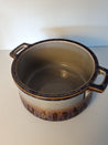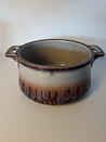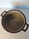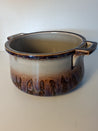 Skålen har en glaseret overflade med to håndtag, der giver nemt greb. Den har en dyb form.