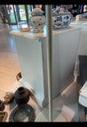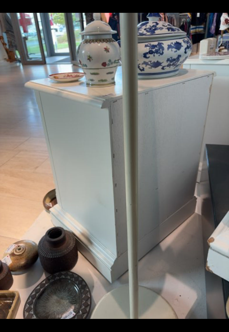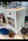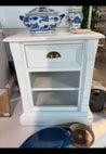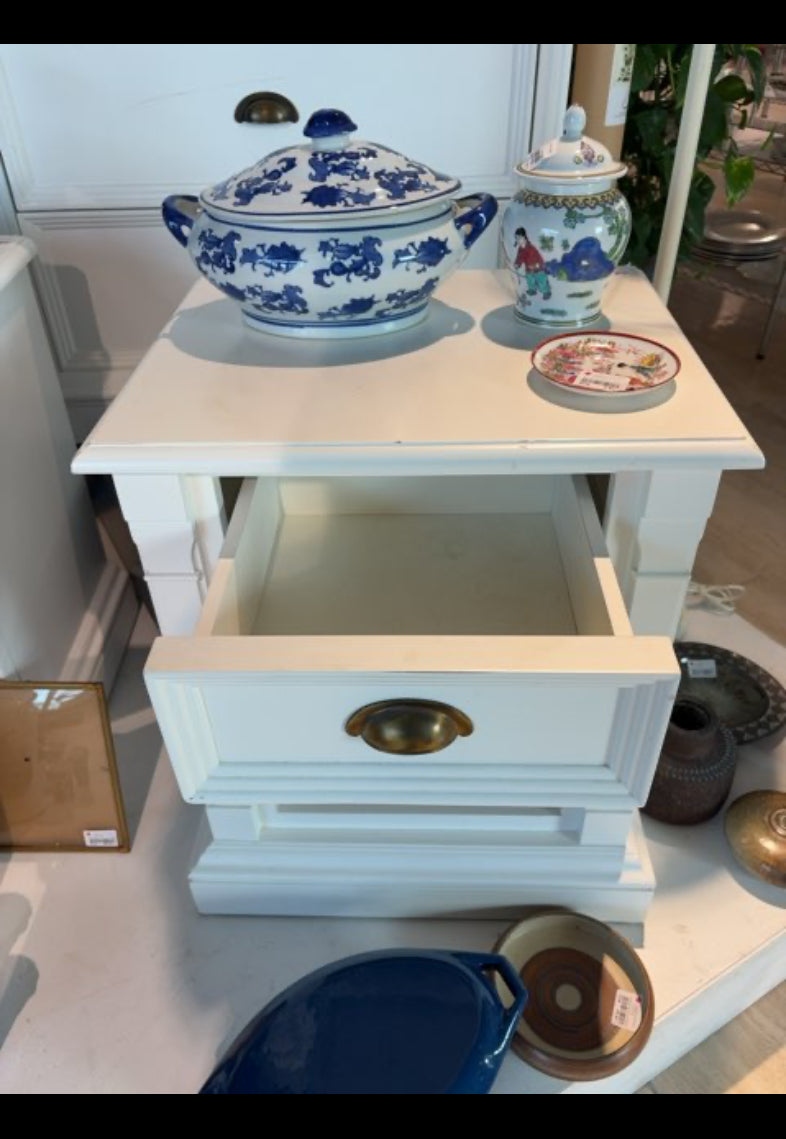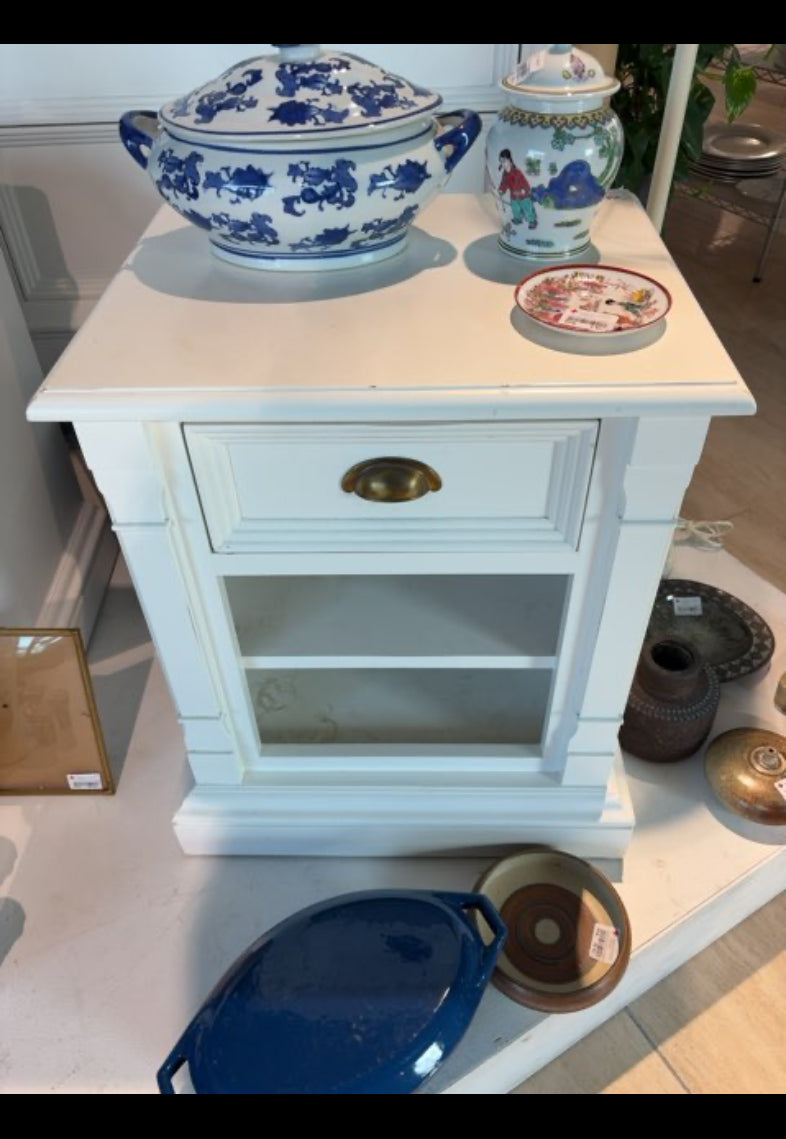Møblet er en hvid natbord med en skuffe og åbne hylder. Materialet er træfiner med metalgreb.