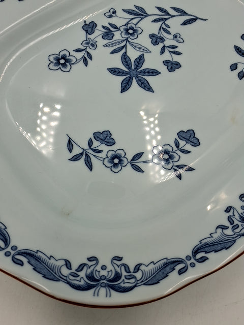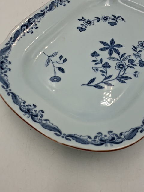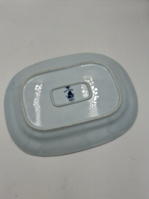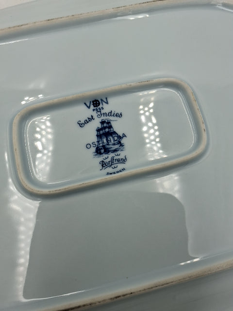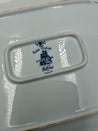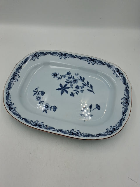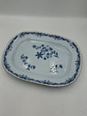 Fad af porcelæn med en rektangulær form og blå blomstermotiv.