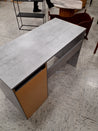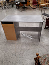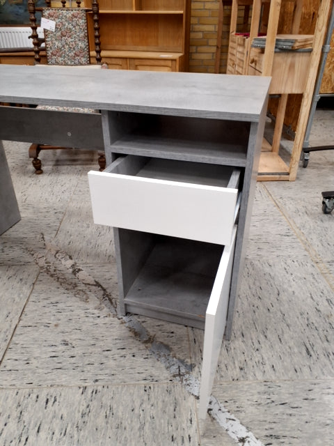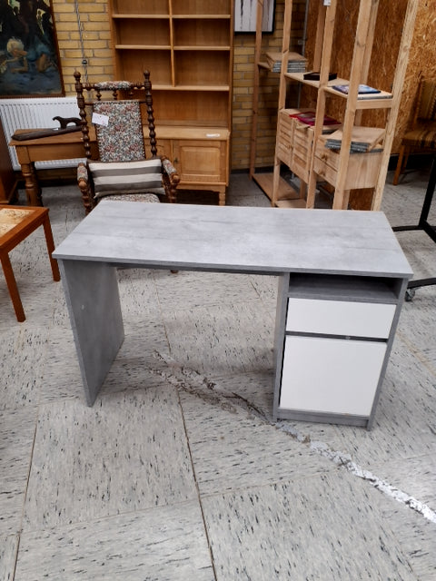Skrivebordet har en enkel og moderne design med en glat, grå overflade. Det inkluderer en skuffe og et skab med hvide låger.