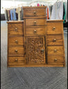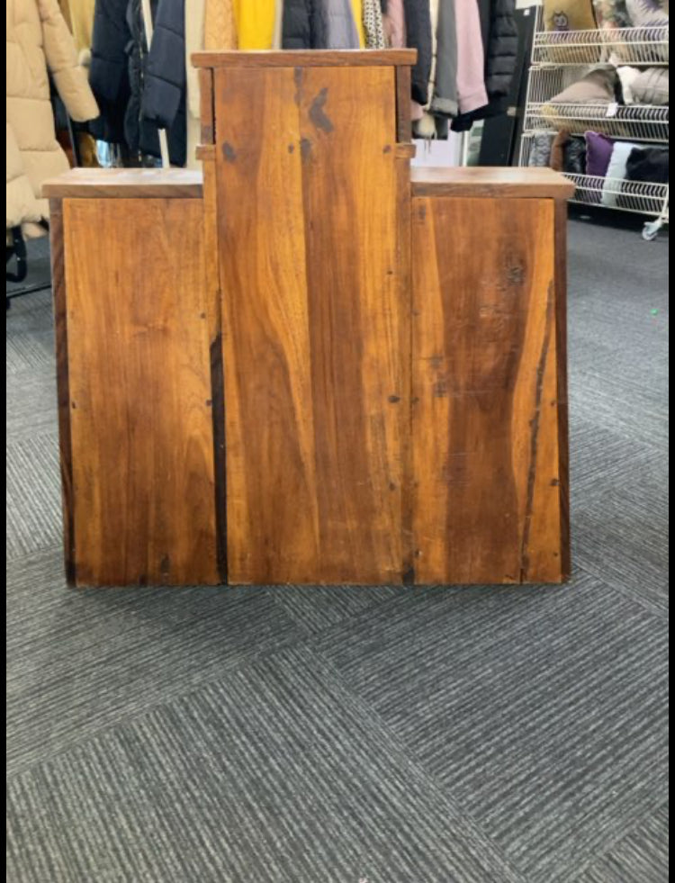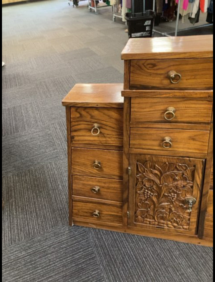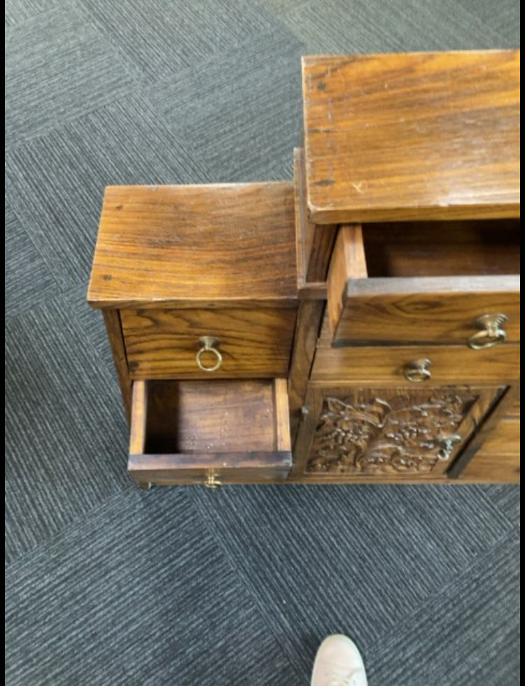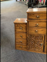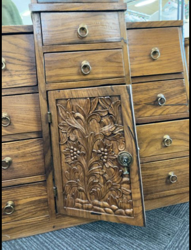 Skabet er i massivt træ med flere skuffer og udsmykket skab. Alle hængsler tilstede.