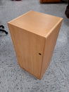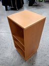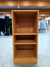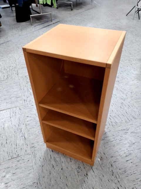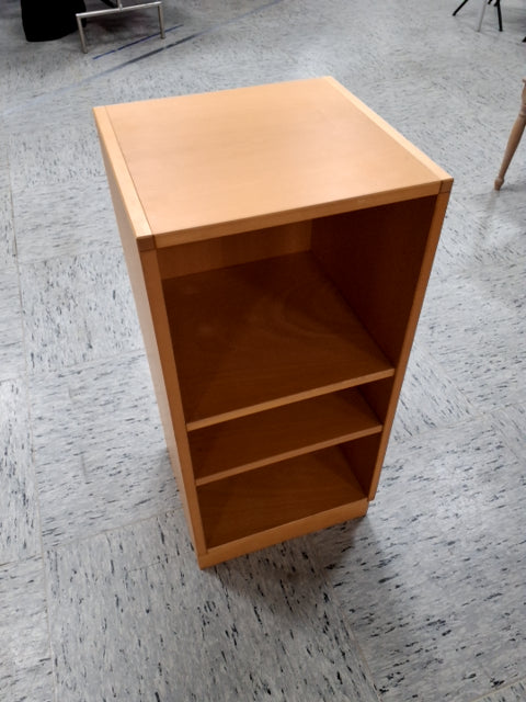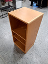 Skabet har tre hylder. Det er lavet af træ med en lys finish. På sokkel. Der er boret et hul i bagbeklædningen til at føre ledninger igennem.