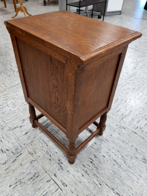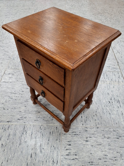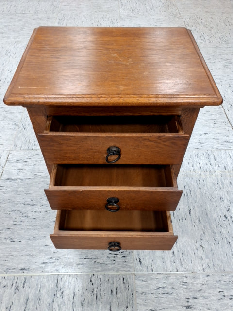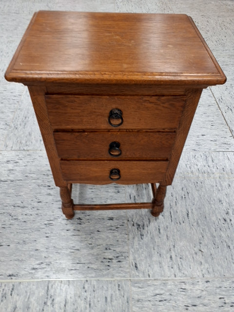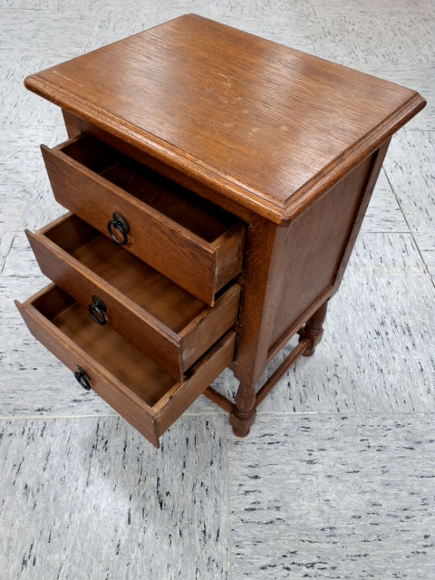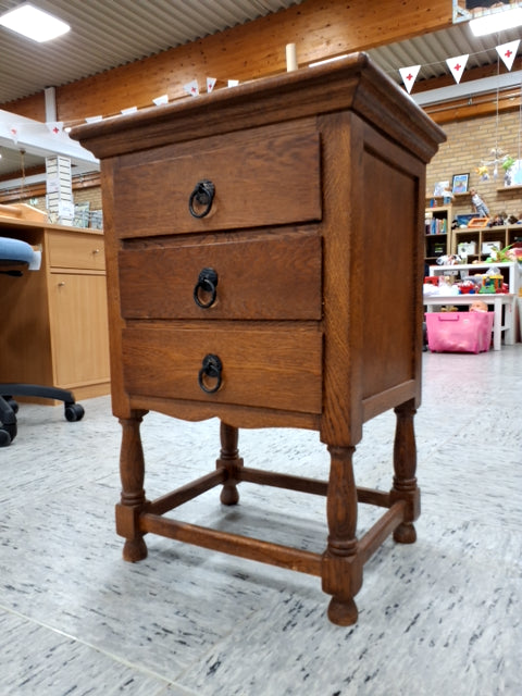 Møblet har tre skuffer og en flad top. Det er lavet af træ med en naturlig finish.