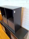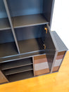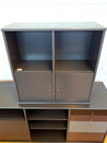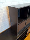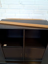 Møblet har en moderne struktur med to åbne hylder og to lukkede skabe.