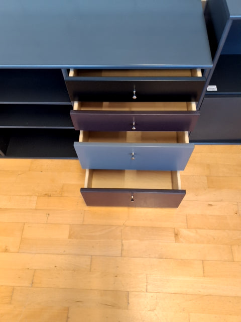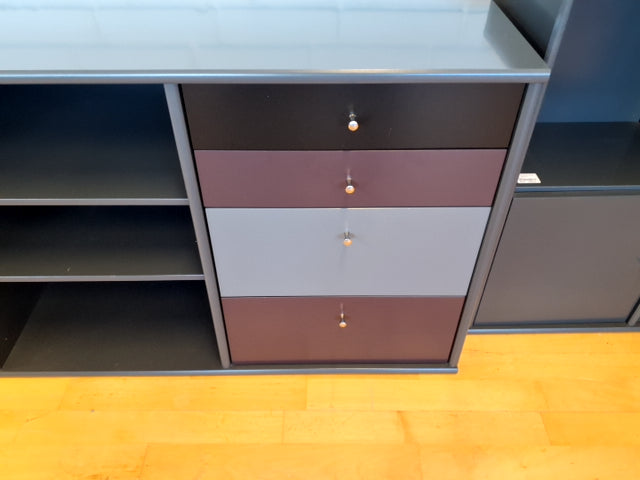 Farverne er mørke og kontrasterer med skuffer i forskellige nuancer.