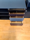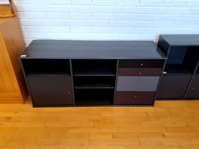 Møblet har en simpel og moderne stil med flere åbne og lukkede opbevaringsmuligheder. Det er fremstillet af holdbart materiale og har en glat overflade.