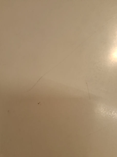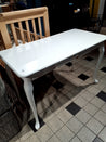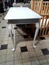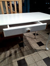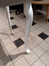 Bordet har en glat, moderne overflade og elegante, bølgede ben. Det har en skuffe med porcelænsgreb. Lidt ridser på bordpladen, men et rigtig fint bord.