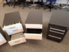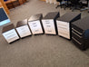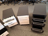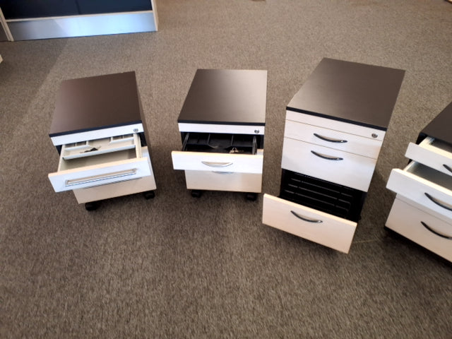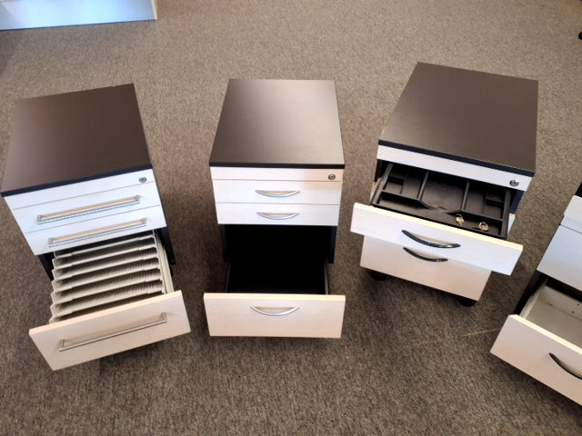 Skuffesektionene har 3 eller 4 skuffer. De fleste har en kombination af lys træ på front og mørk finish på kabinet. Hovedparten er med hjul. Mål på de mindste er: H 50. B 43. L 59. Mål på de største er: H 63. B 42. L 59.