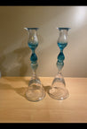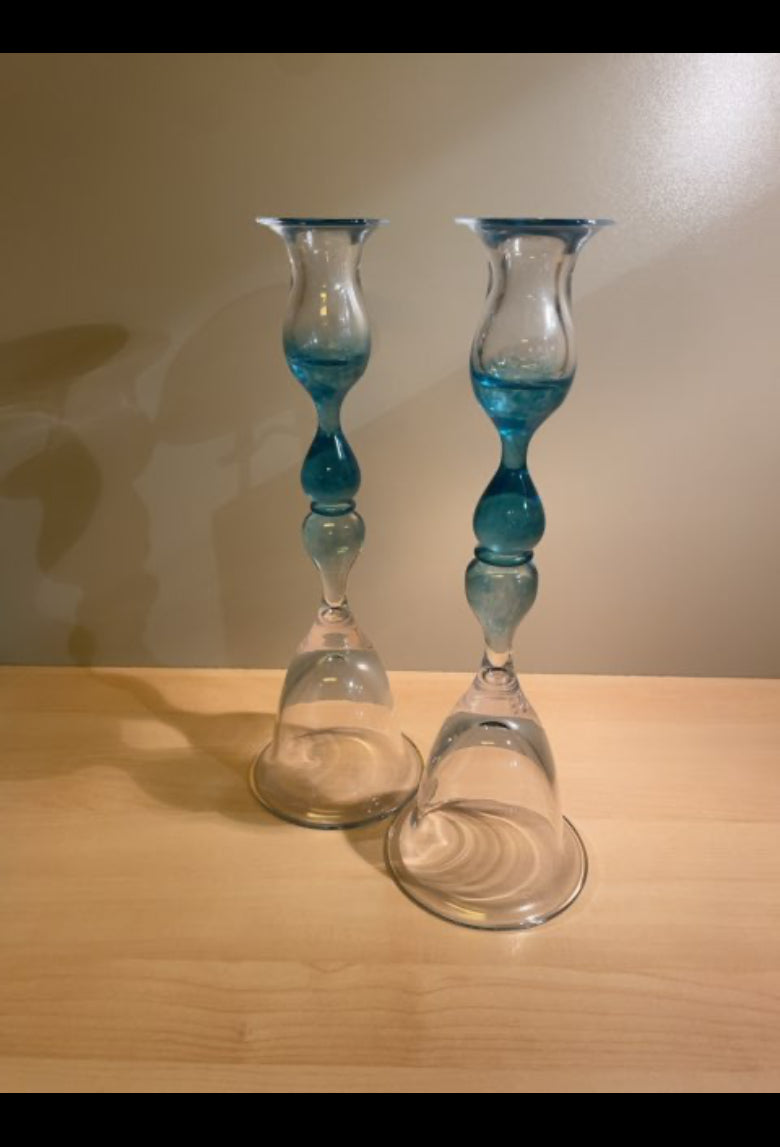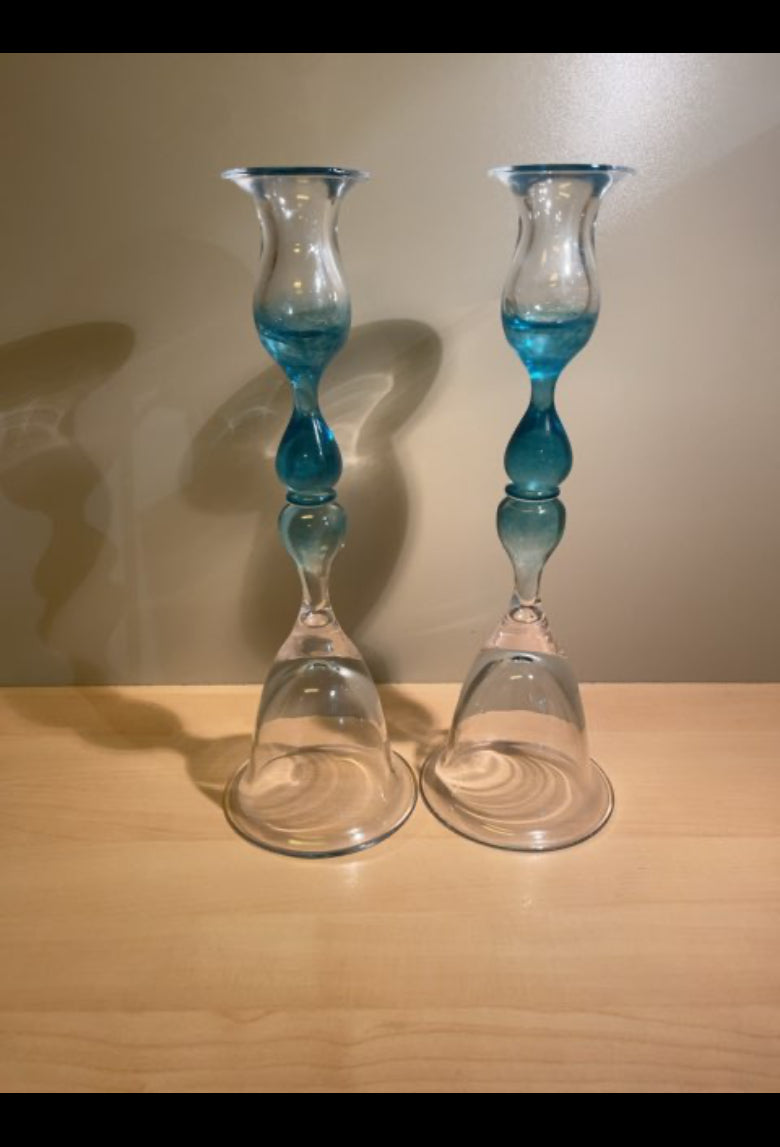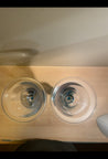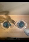 Produktene er to elegante glas med en dekorativ, bølget form og en blå farvetone i midten. Glasne er lavet af klart glas med en glat overflade. Pris er pr. stk.