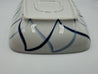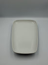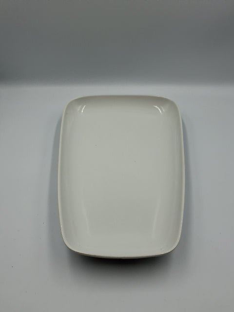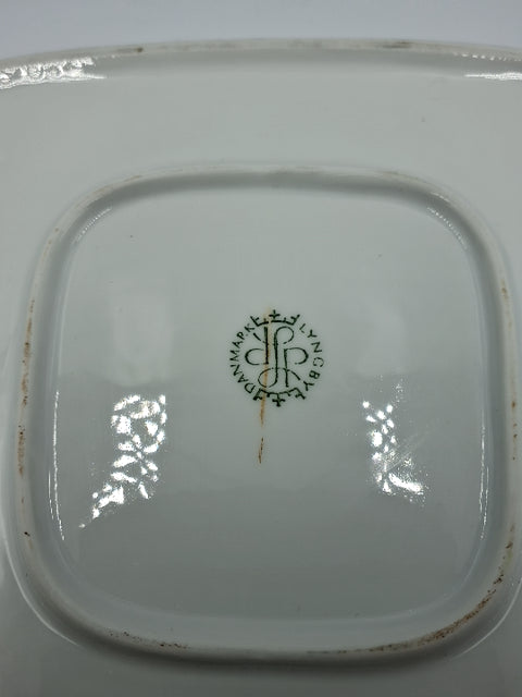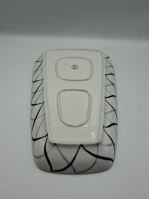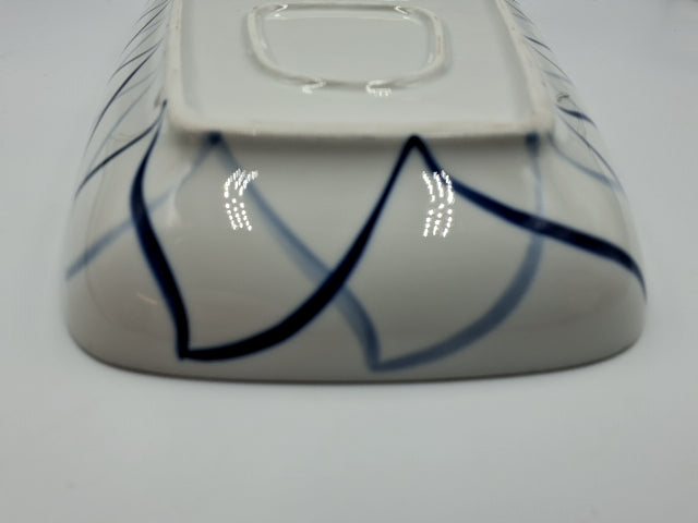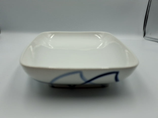 Skålen er firkantet med glatte kanter og en enkelt blå dekoration.