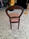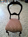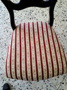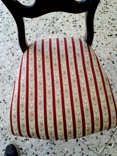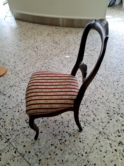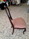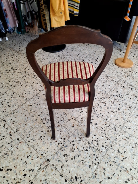Stolen har en elegant, buet ryg og et polstret sæde med stribet mønster. Træramme.