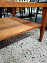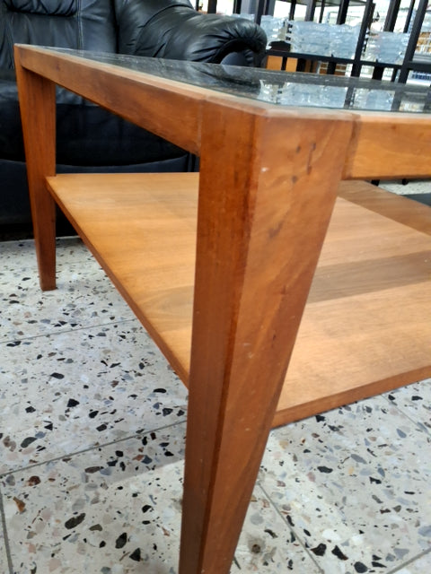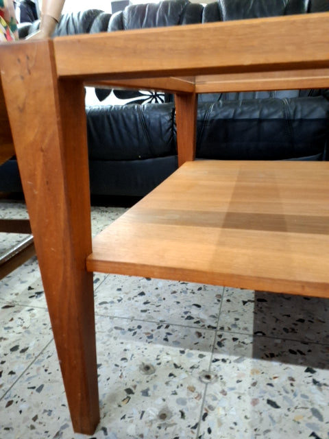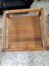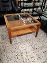 Bordet har en kvadratisk form med en glas bordplade og en hylde i træ. Materialet er træ.