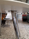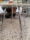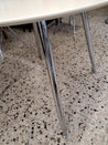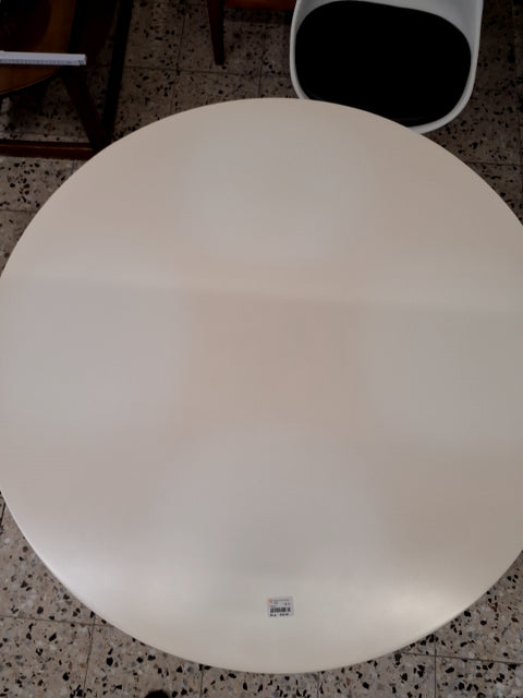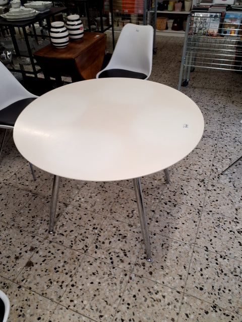 Bordet har en glat, rund bordplade og metalben, der sikrer god stabilitet.