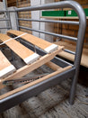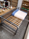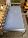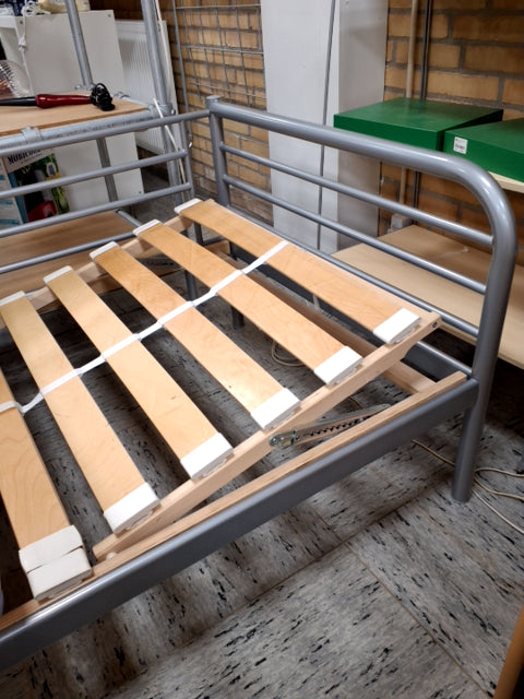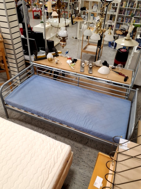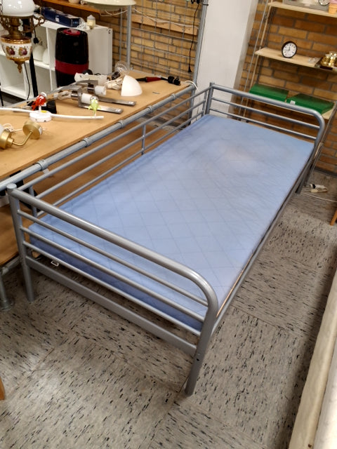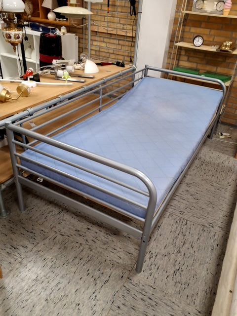 Enkeltseng i en metalramme inkl blød, blå madras. Madrassen har nogle pletter - prisen er sat derefter. Hovedenden af sengen kan manuelt hæves og sænkes. Sengerammen har målene: 96 x 209 cm, og er til en 90 x 200 cm madras.